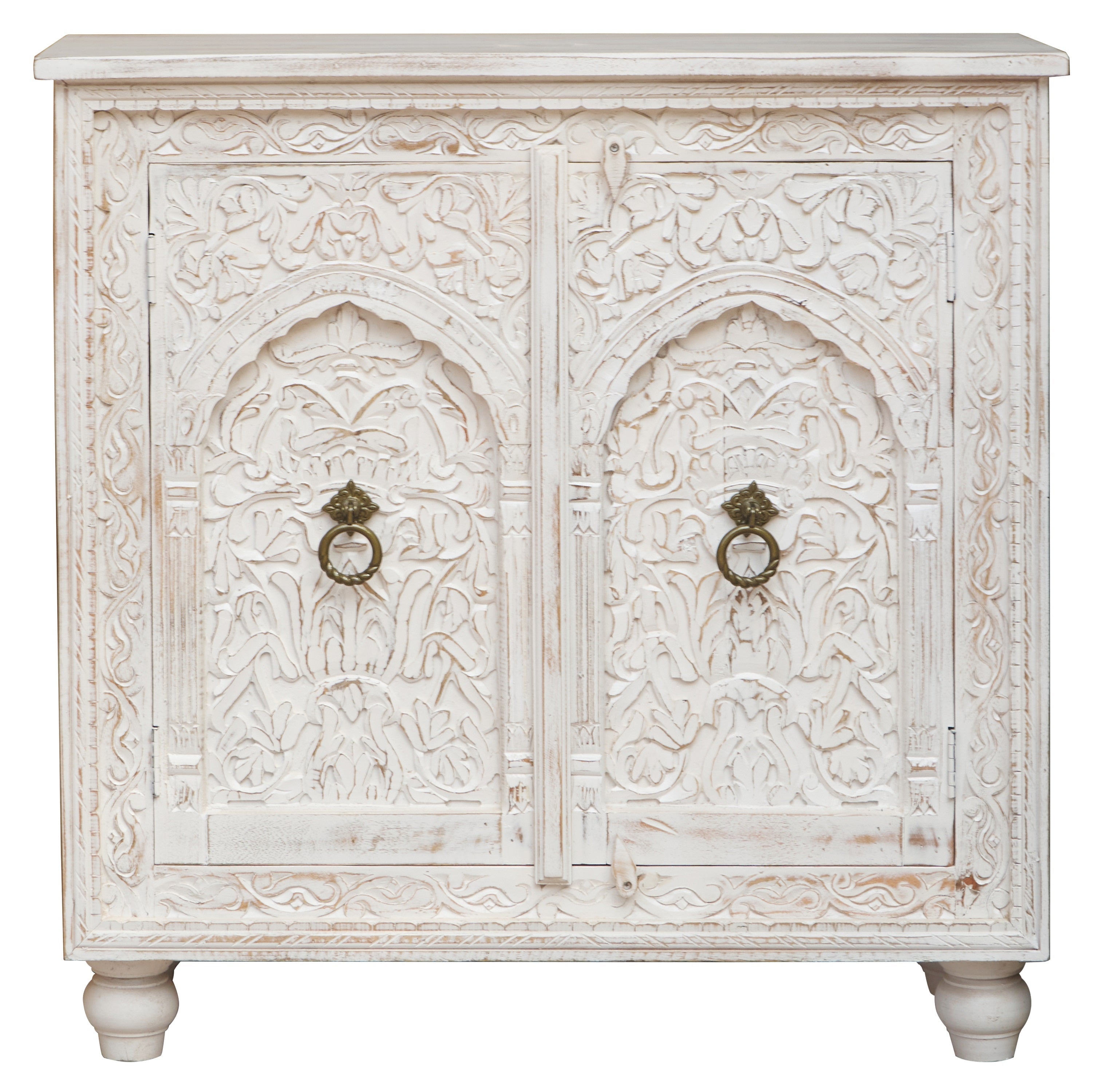 Hand carved with 1 shelve inside made from solid mango wood in the shape of delicate carving, this show-stopping storage piece has great interior space and it is ideal for living room entertainment, also can be used as an entryway piece.