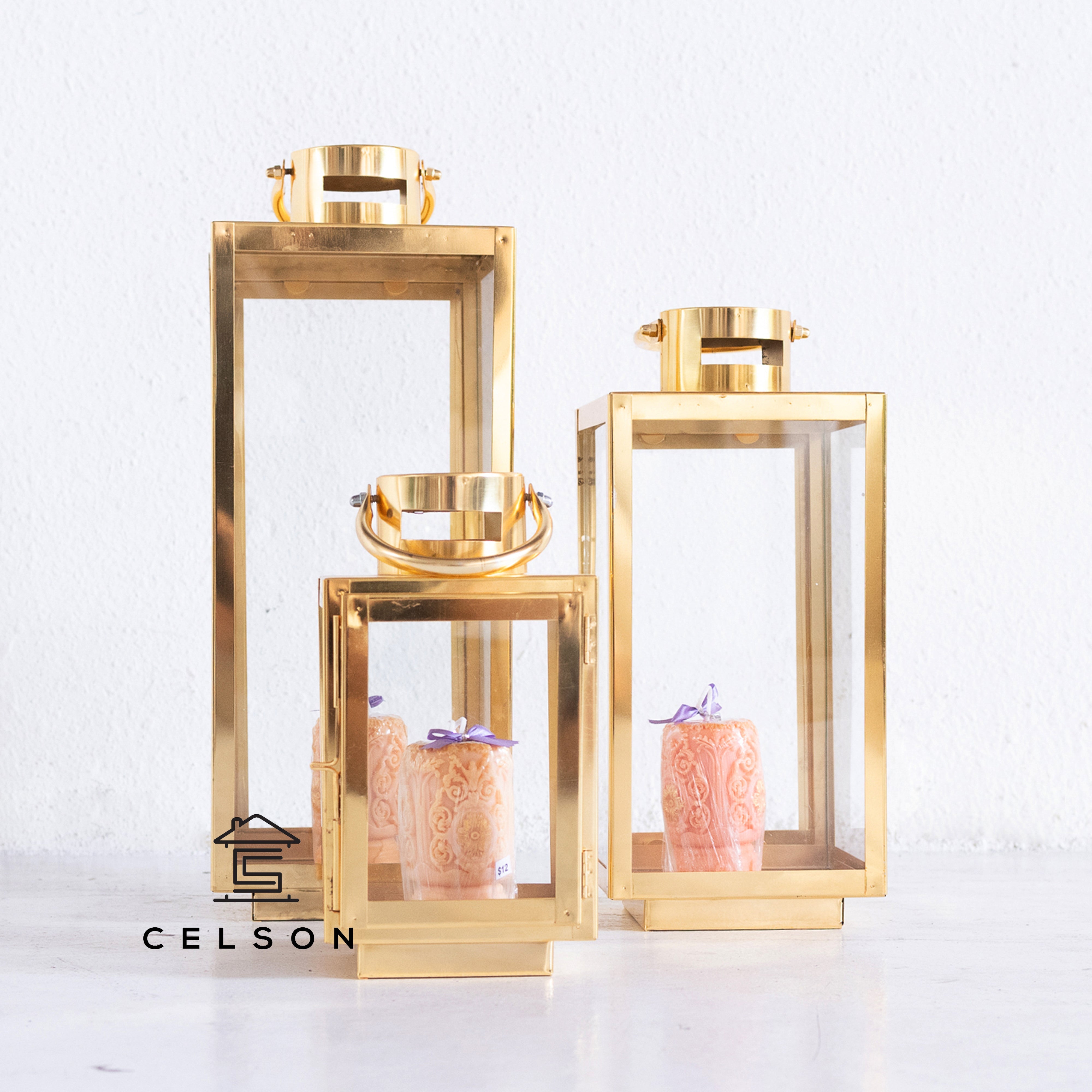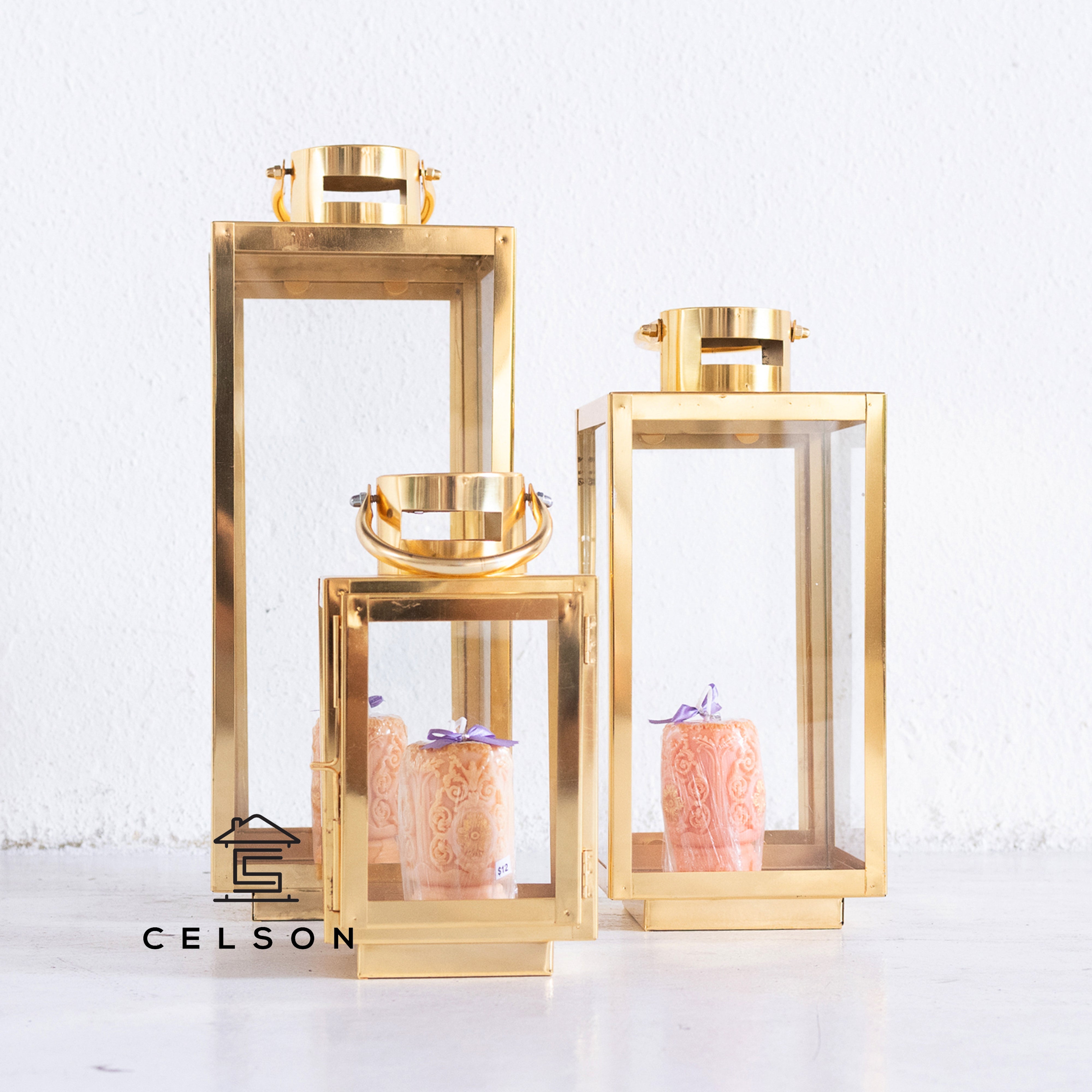 Bring a warmer look to your home with our antique gold finish lantern set.