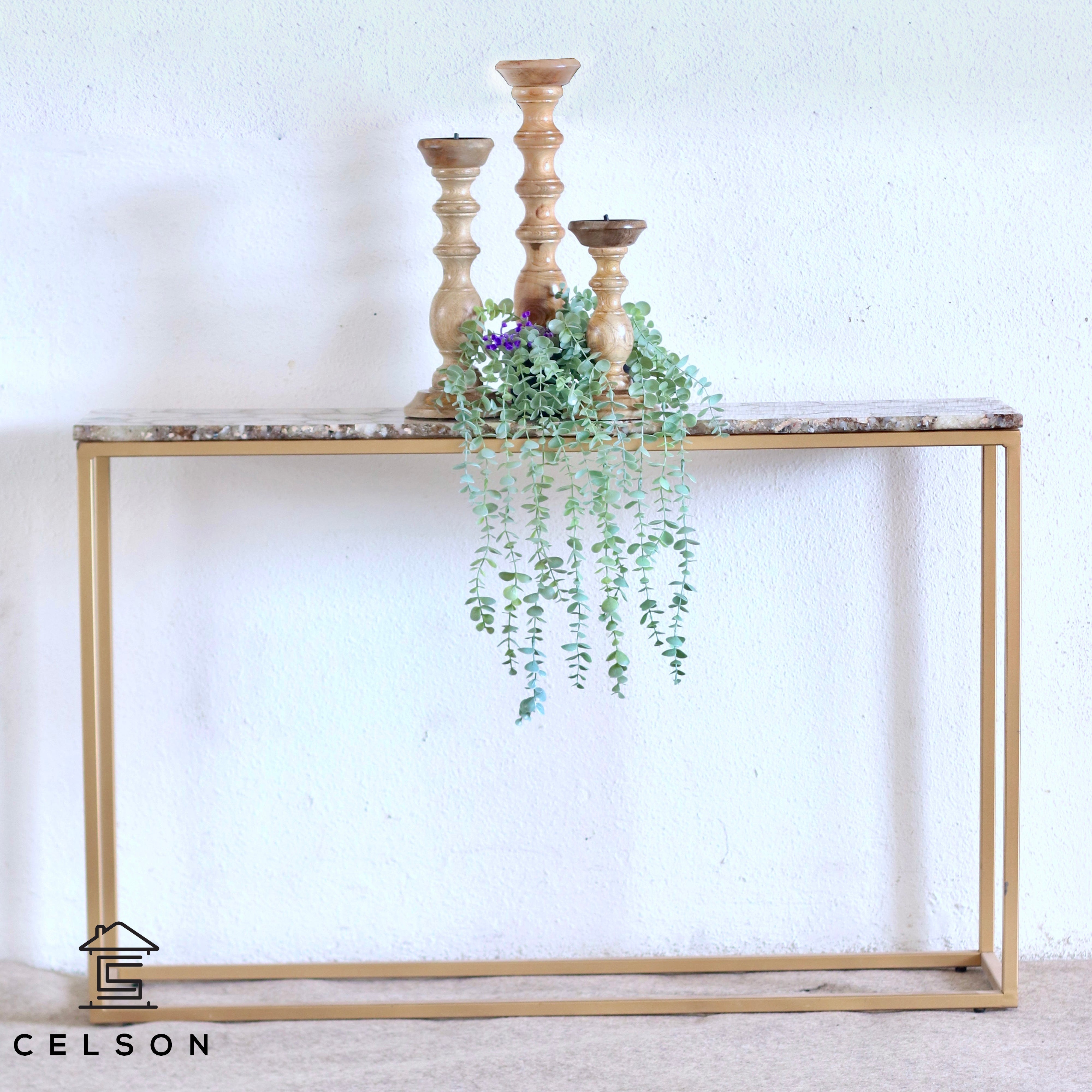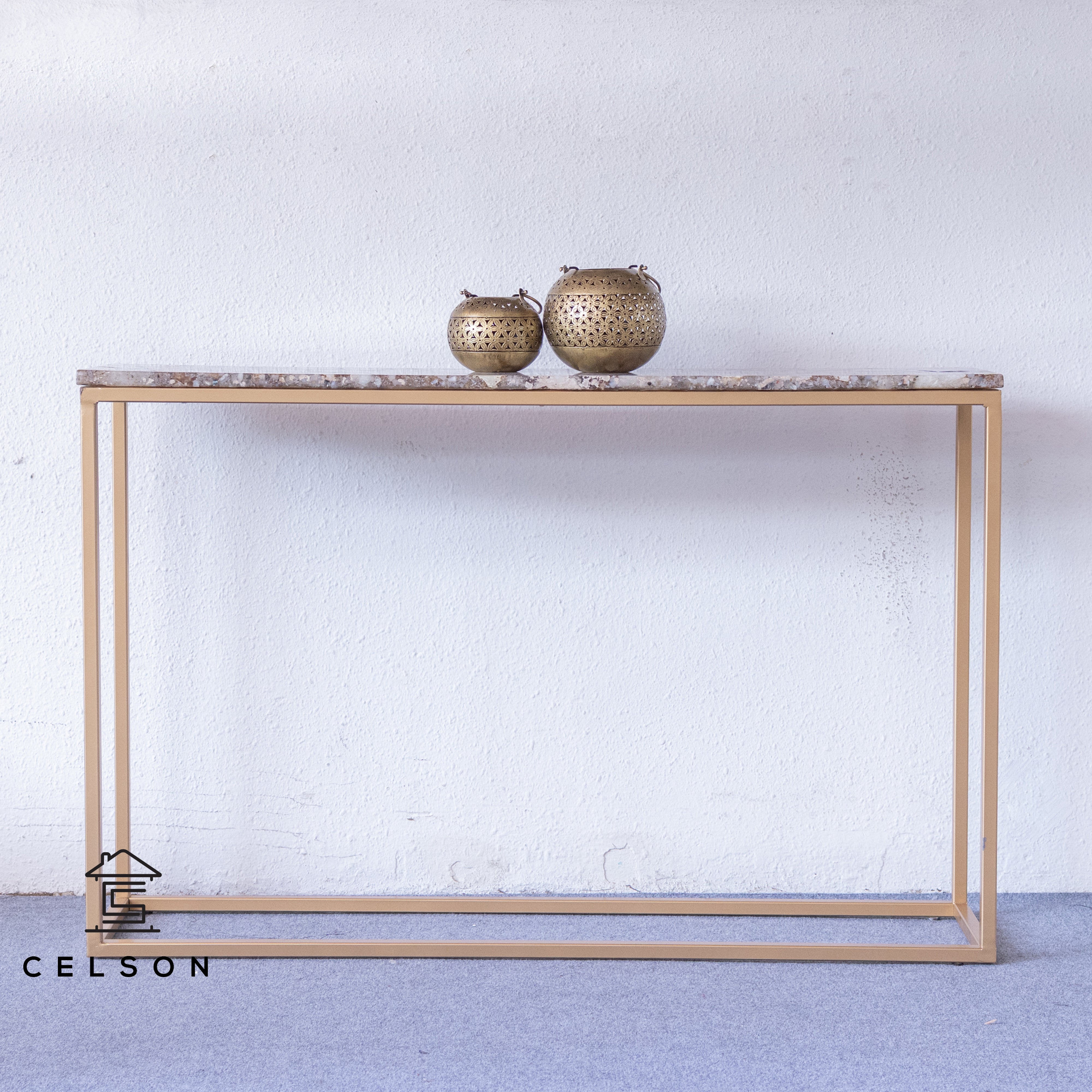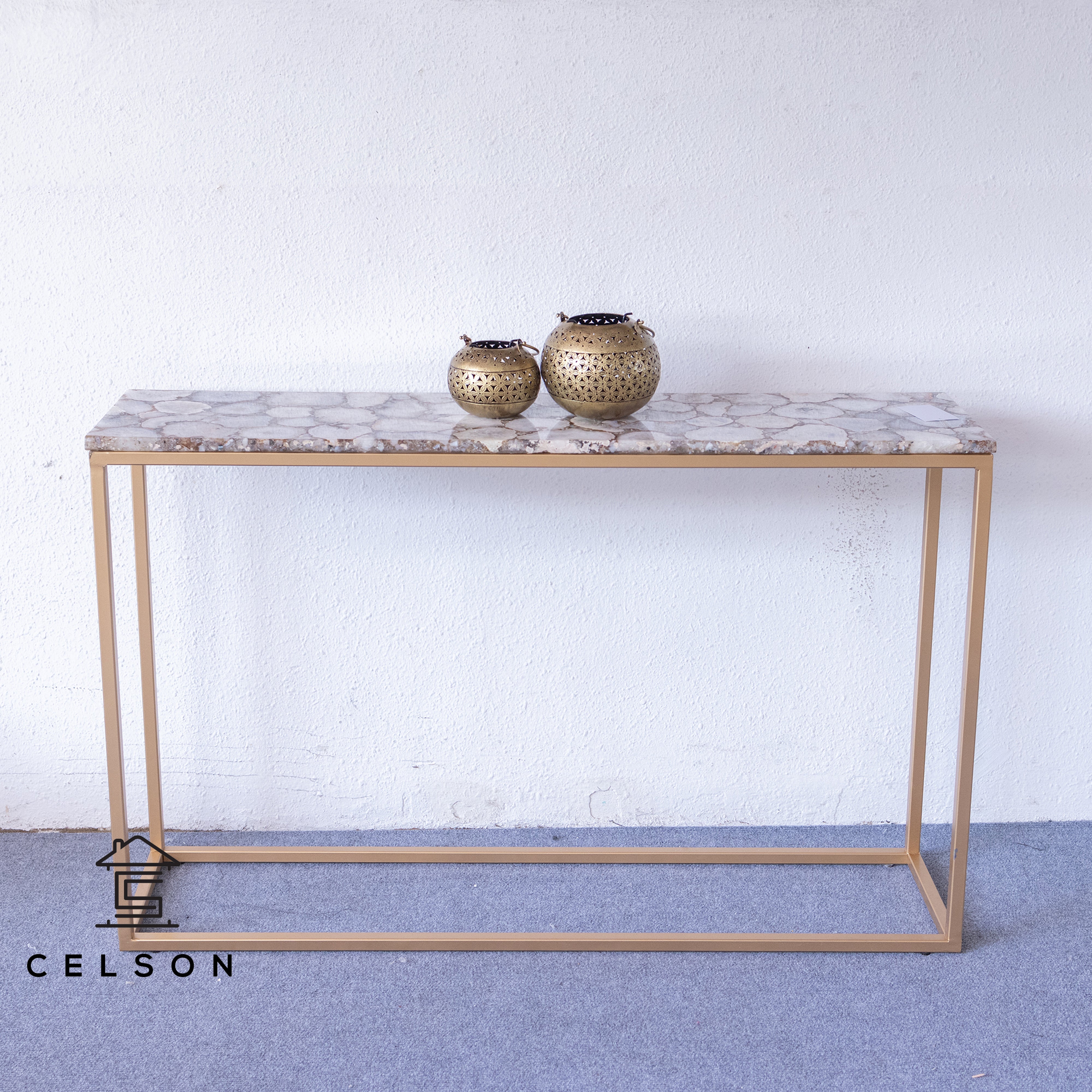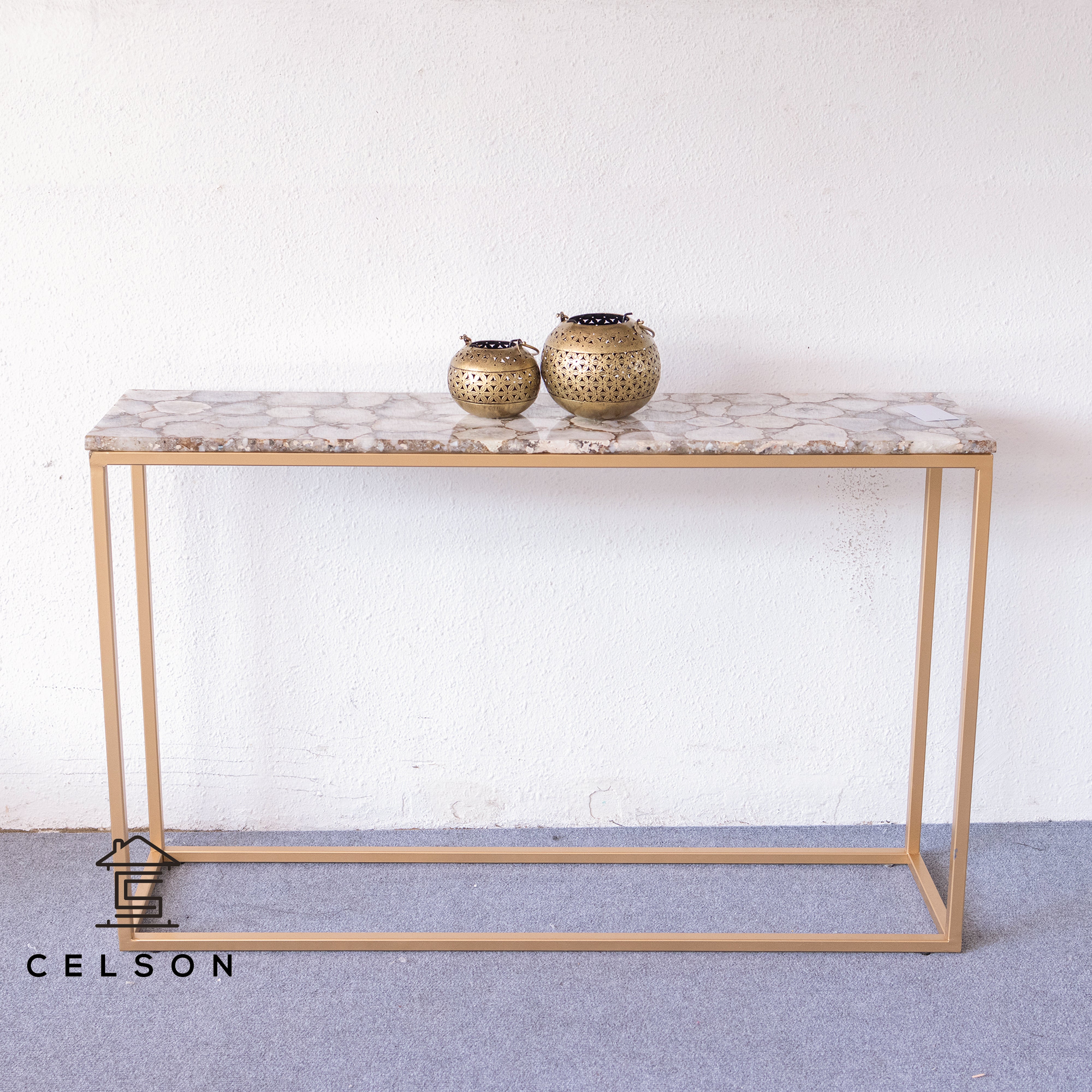 The Kim Console Table is a slim & unique piece with an agate top & metallic gold legs.