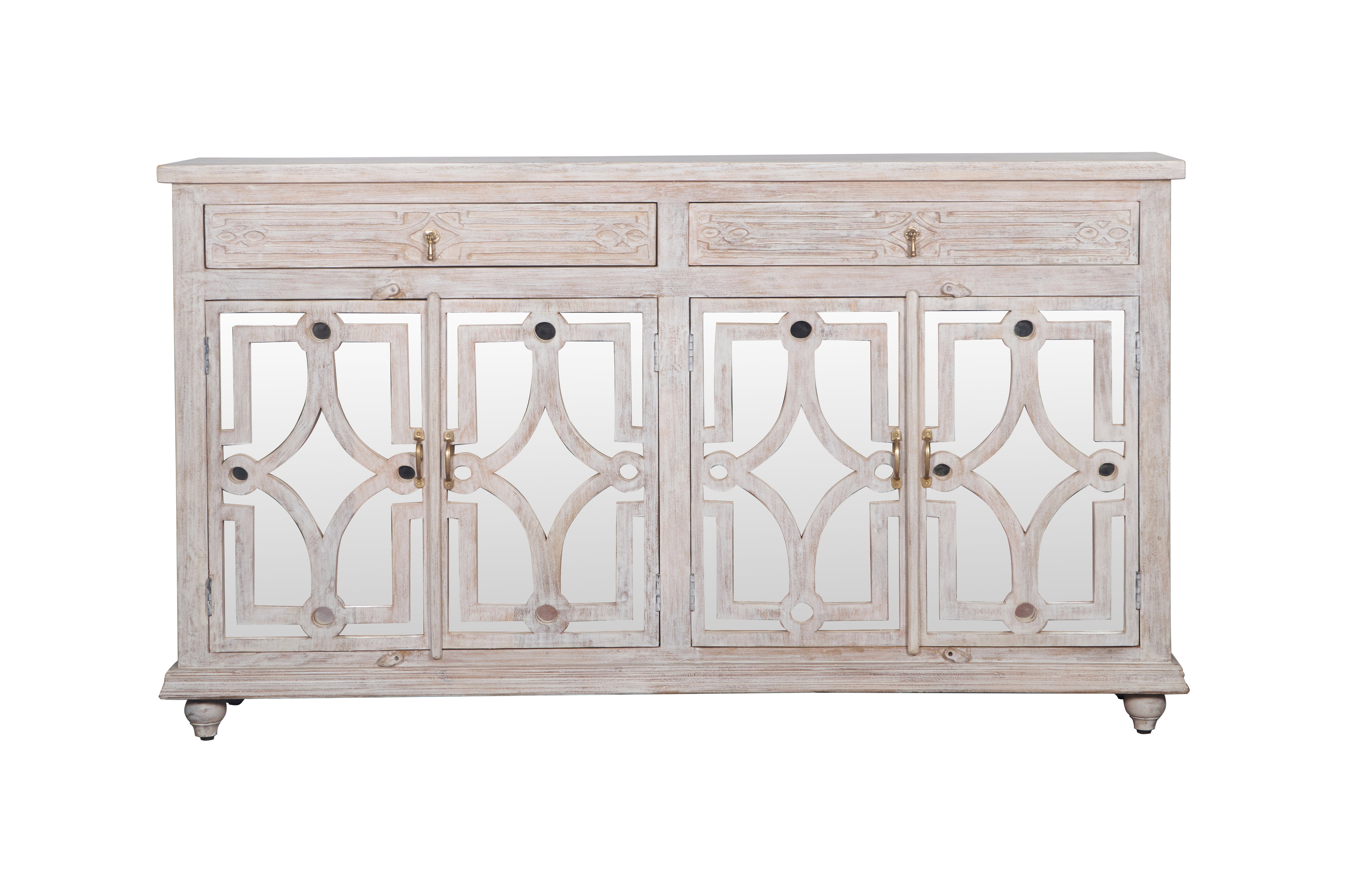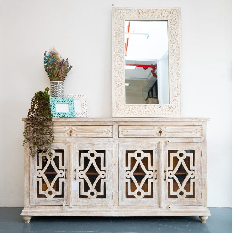 Our Lovely sideboard comes in a distressed white finish with glass panels and hand carved wooden design all over the front facade and matching metal brass hardware.