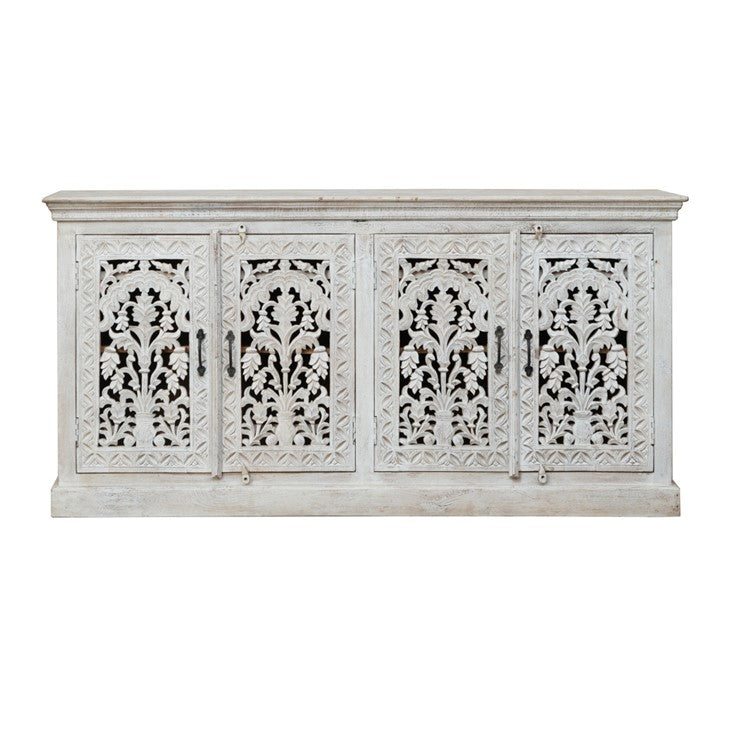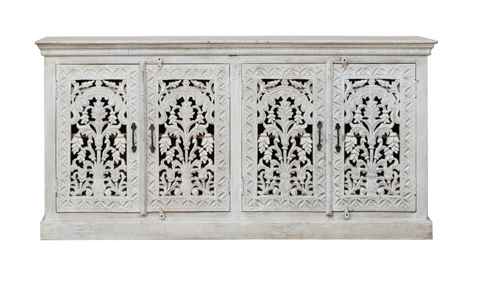 This white washed finish sideboard is an absolute eye catcher with its hand carved design and complimenting metal pulls.