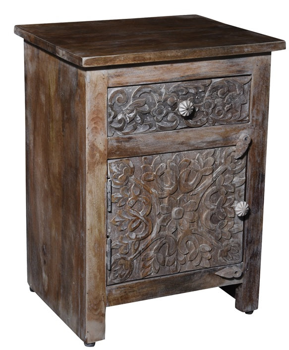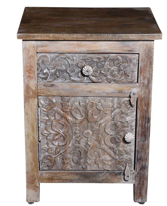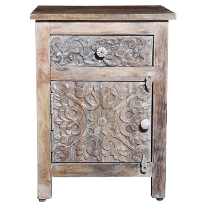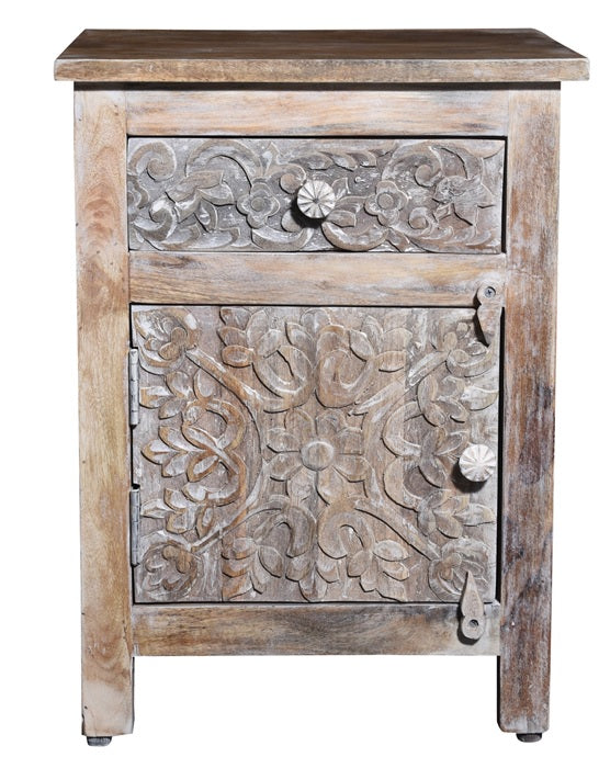 This bedside cabinet comes with one drawer & one door which are carved in floral designs & offer you some storage.