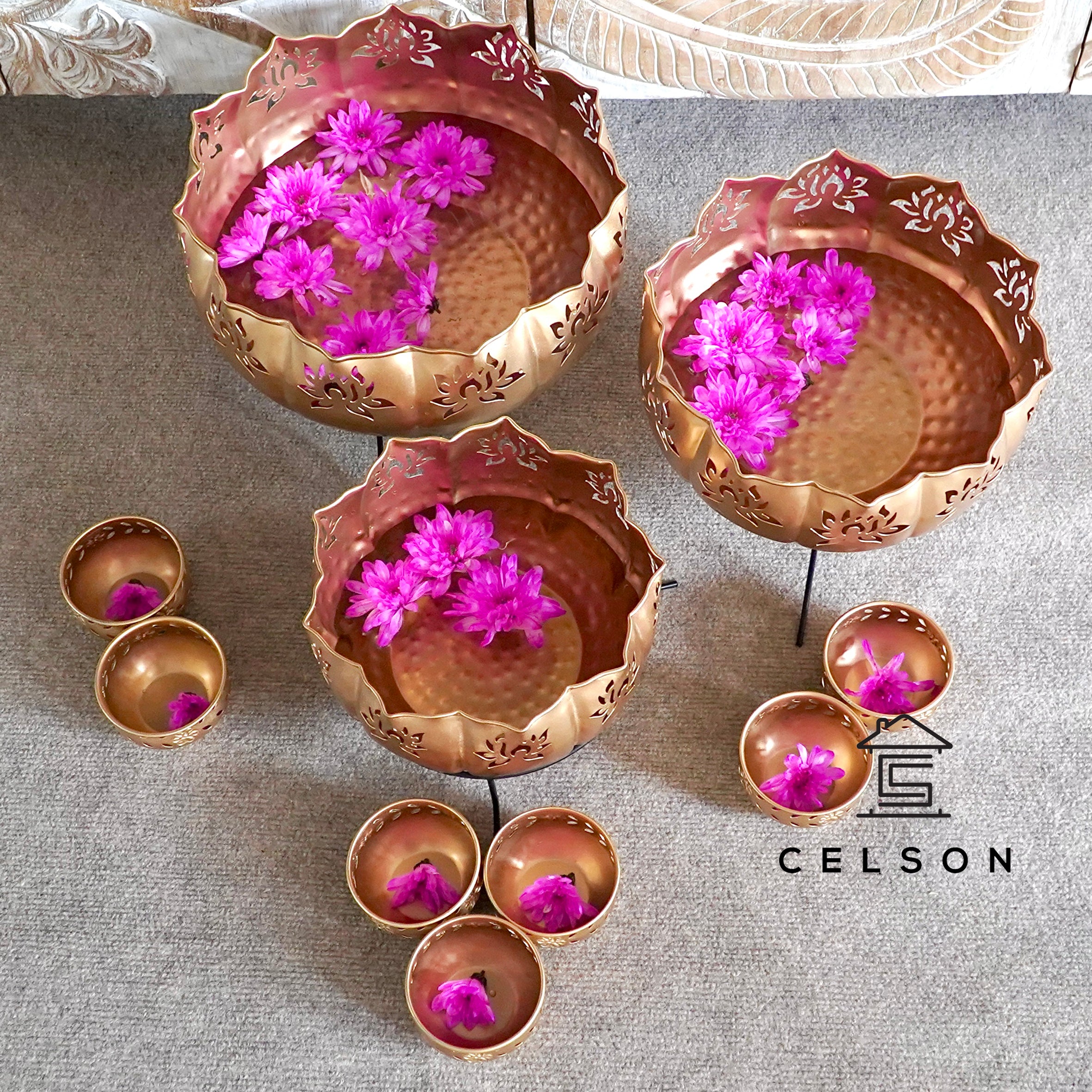 A stunning urli set featuring three large bowls with stand and matching small bowls - perfect for floral displays, festive decor, or timeless elegance.