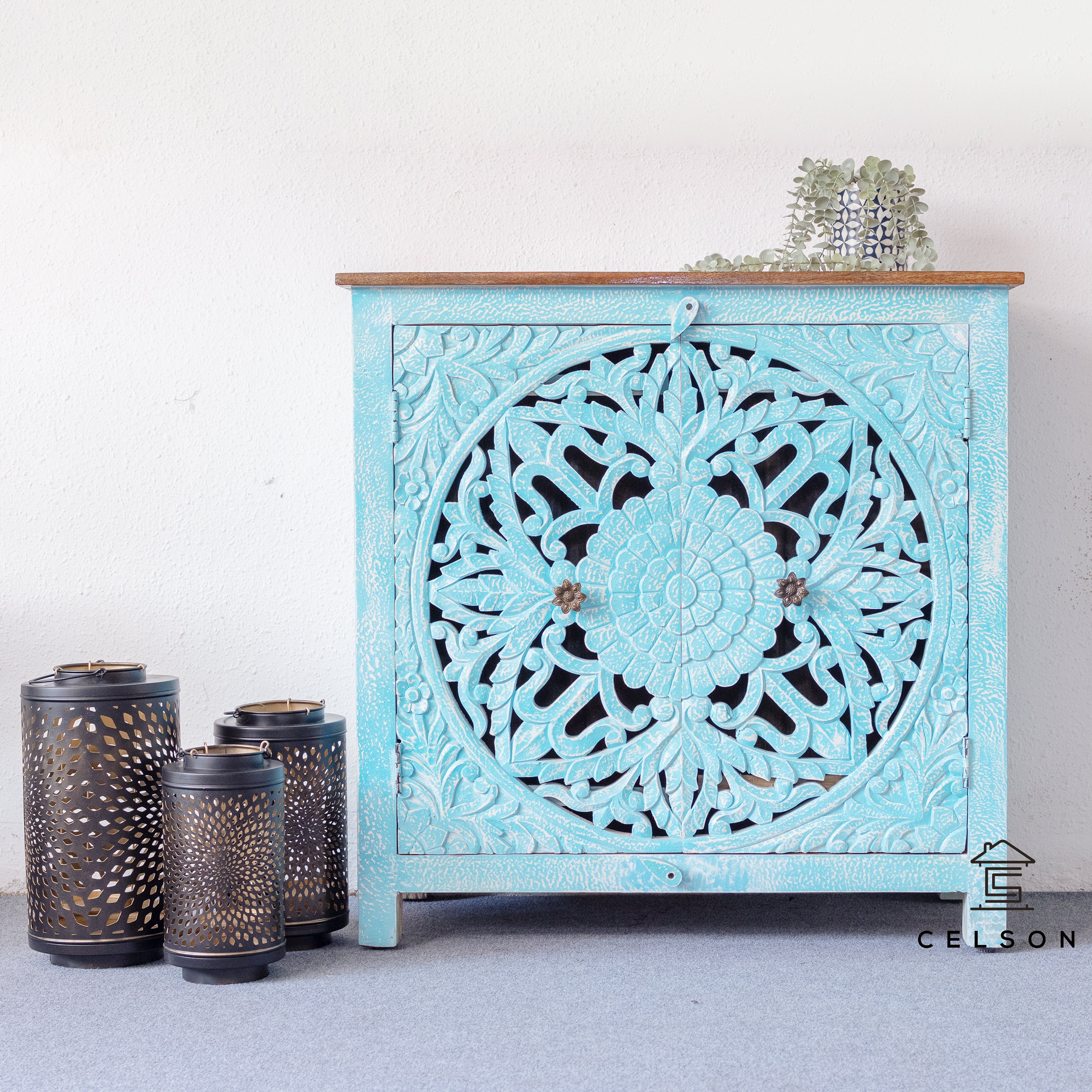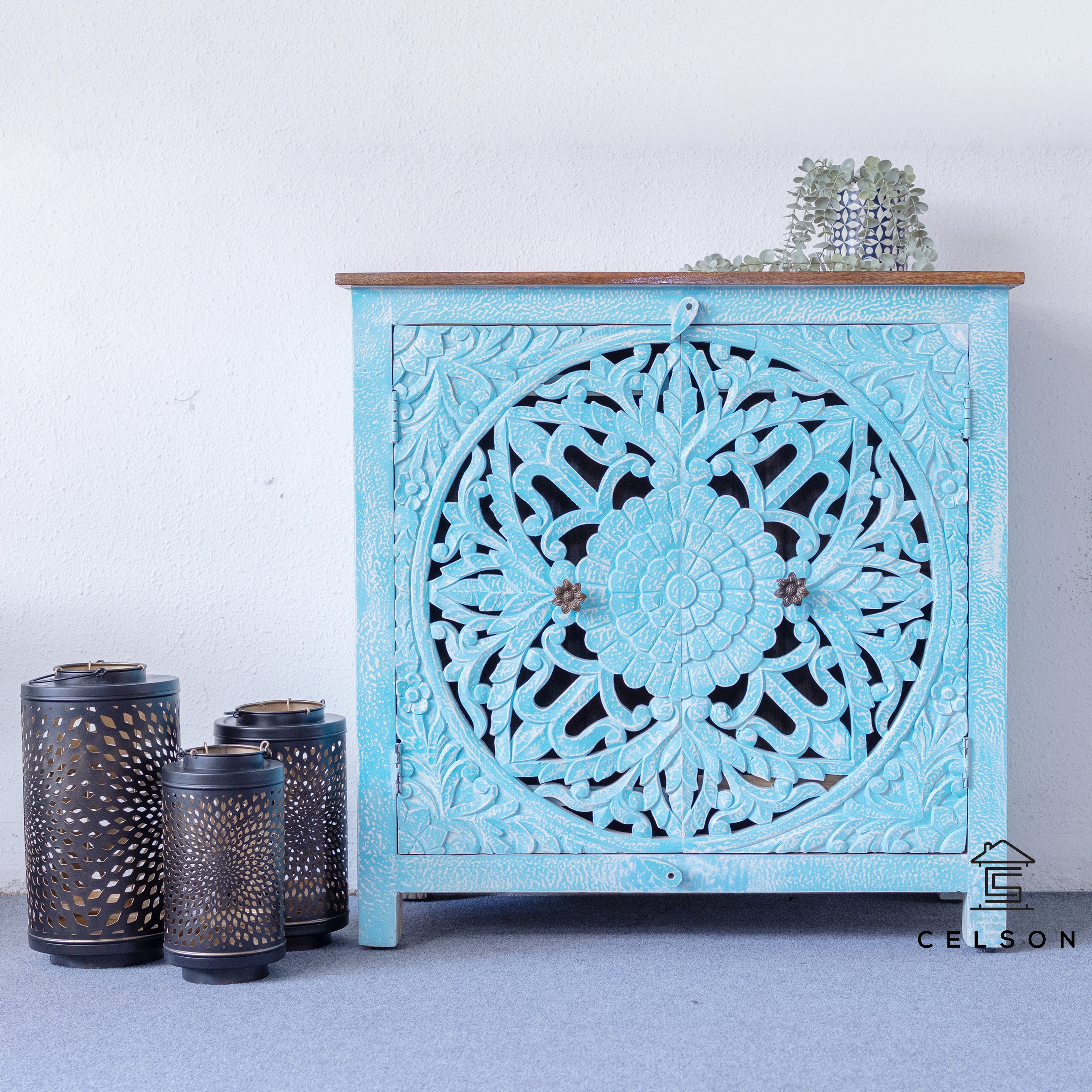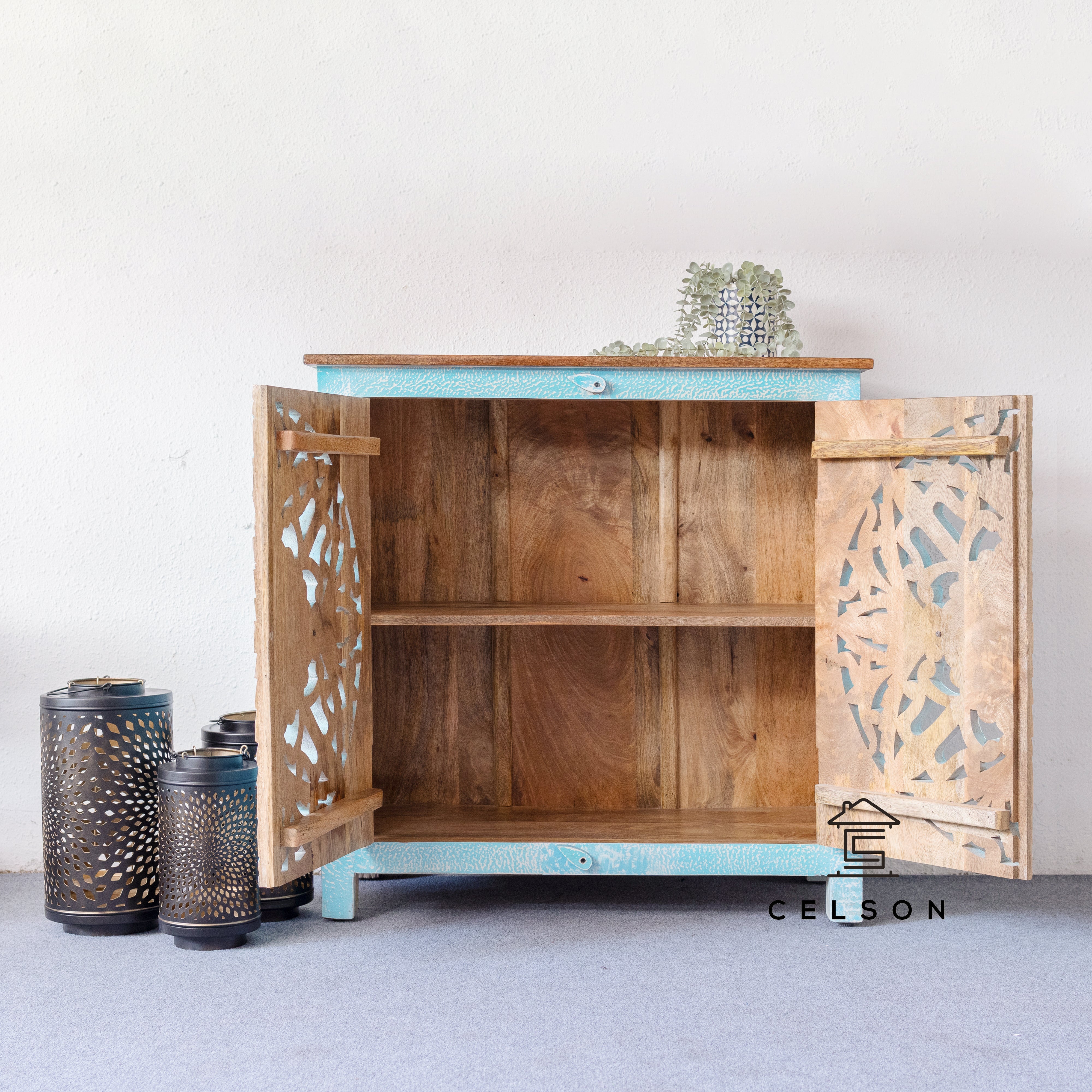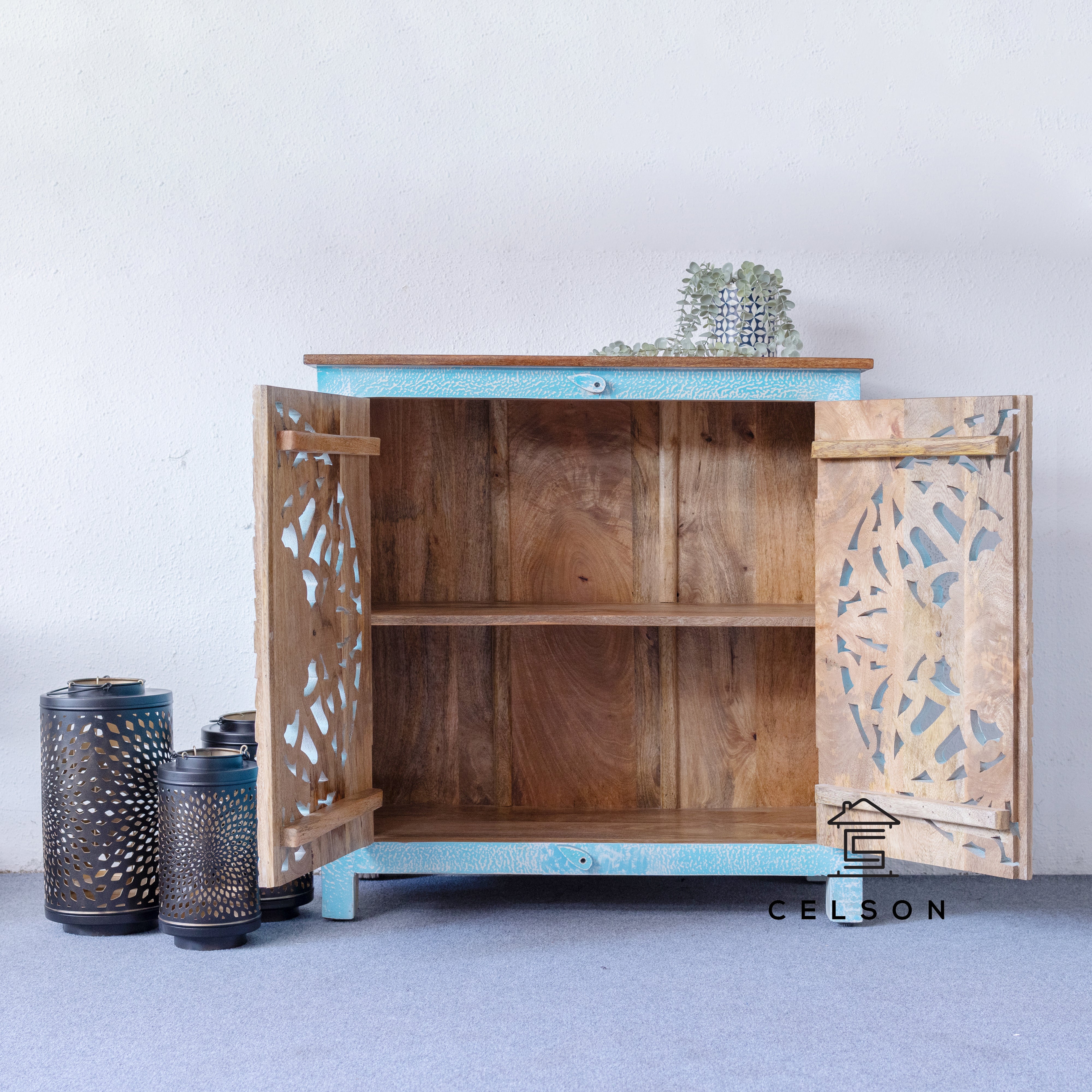 Add a pop of color and craftsmanship to your home with this blue door cabinet. Hand-carved accents and practical storage doors complete the look.