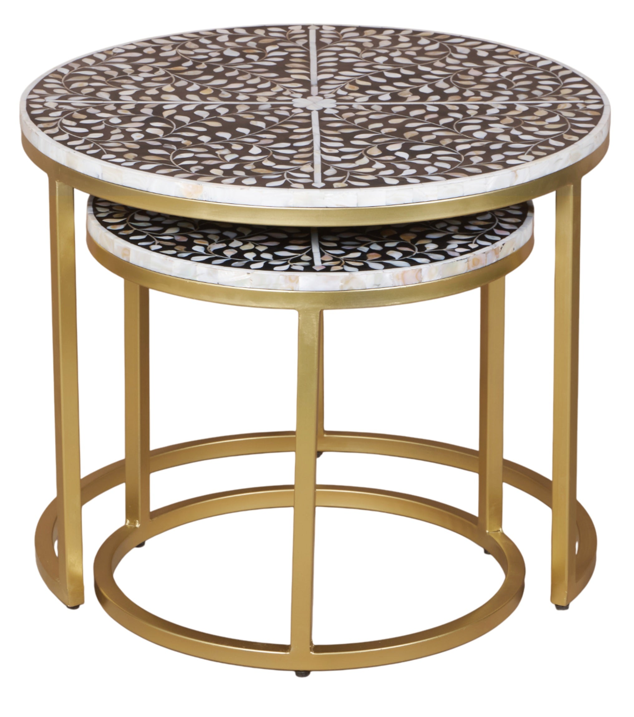 Expertly handcrafted with intricate mop inlay, these nesting tables offer flexible styling as a coffee table or refined side tables.