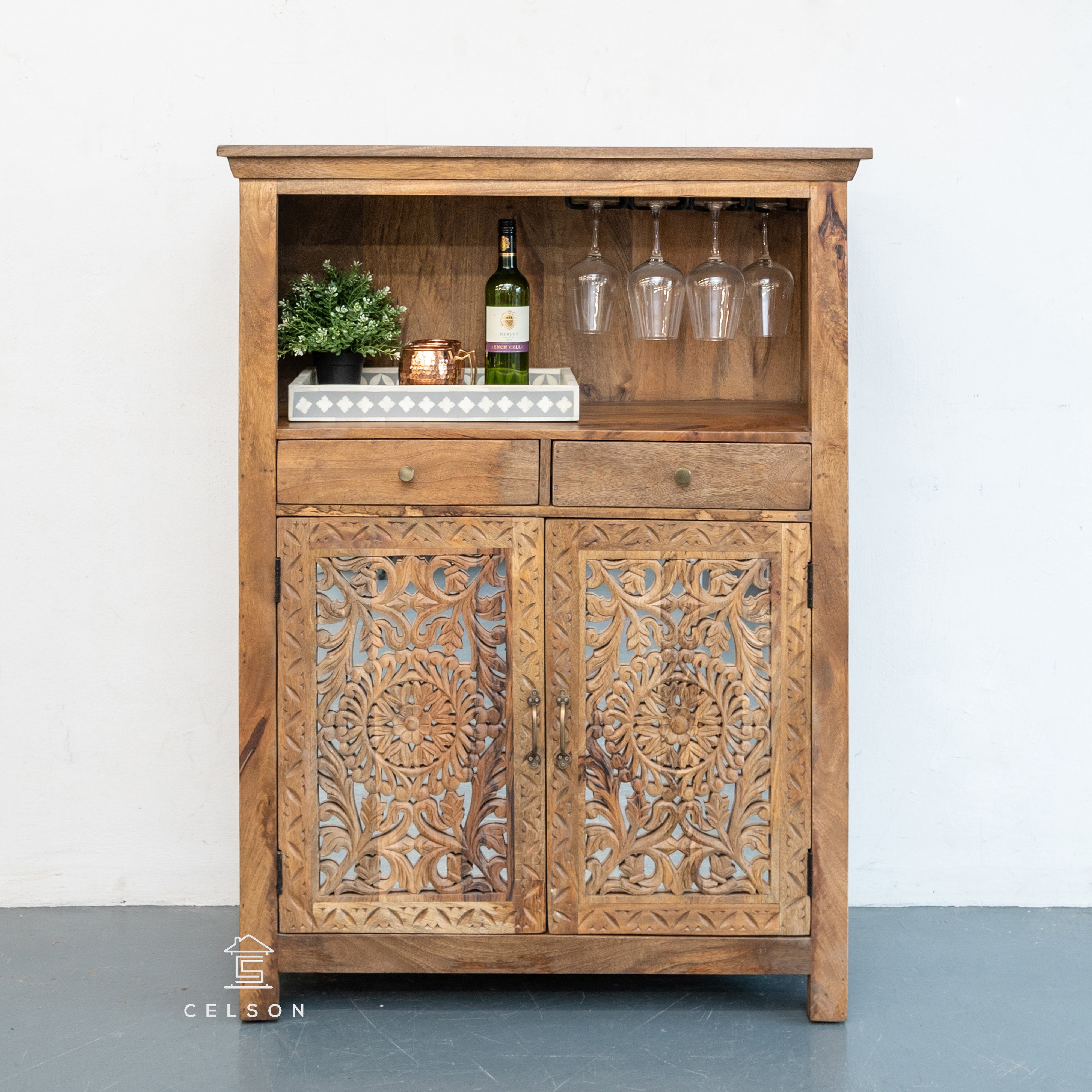 Our solid wood margo bar cabinet is sure to make you stop your search with its carving exterior & lovely natural finish. Multiple shelves and drawers make for the perfect storage space for bottles, glasses and other bar accessories.