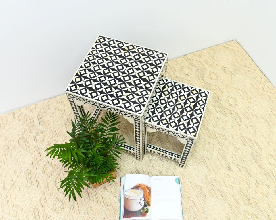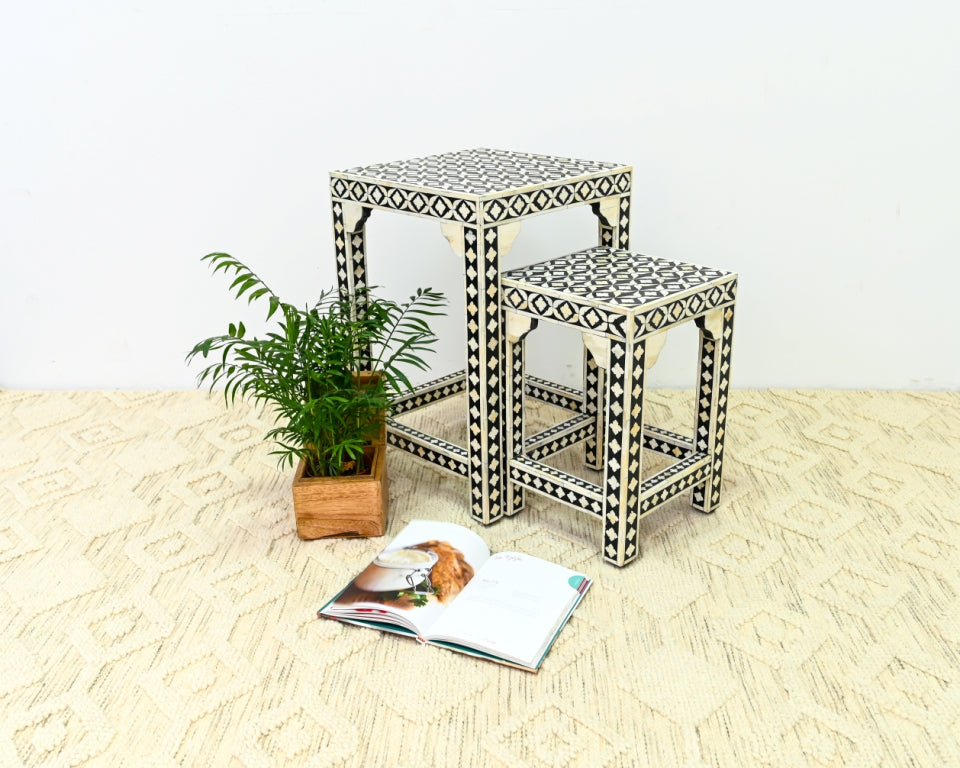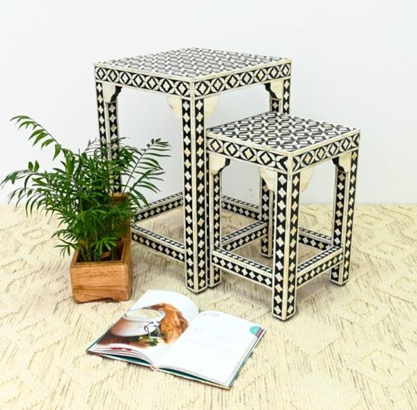 Bone Inlay Nesting table- Set of 2 is styled for today's home. The rich, classy finish will impress everyone. The smaller tables can be pulled out for entertaining or tucked away when space is limited.