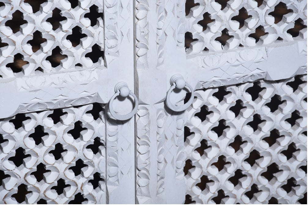 This gorgeous cabinet comes with completely hand carved doors and a traditional Indian jali frame. The contrasting bottom, top & sides in dark wood colour add to the beauty of this piece. It comes with a shelf inside for storage.