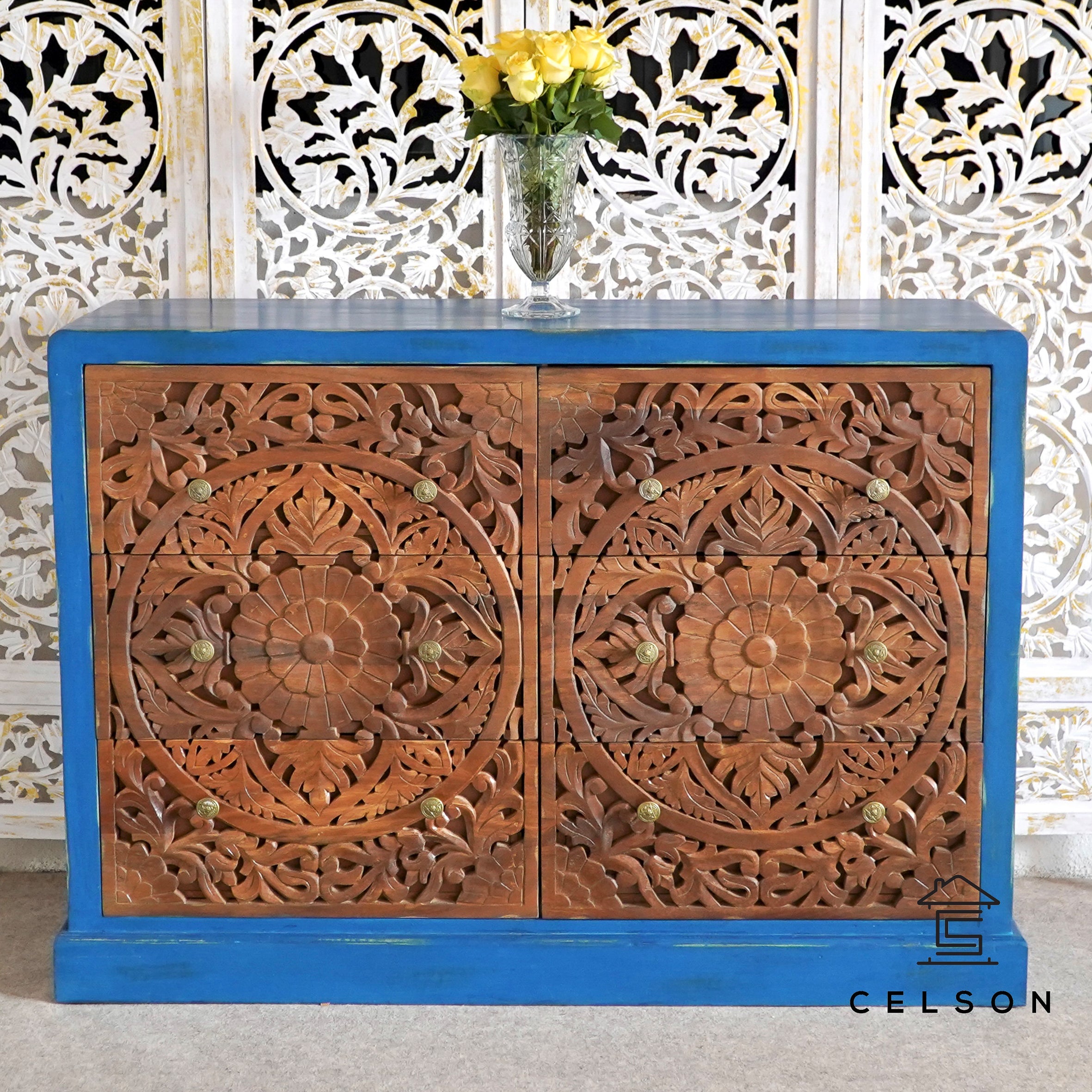 Make a statement with this bold blue chest, paired with brown drawers and exquisite hand-carved details. The pop of color brings life to any space, while the neutral-toned cabinets maintain a refined look. With six drawers, it's perfect for storing bed and bath linens or kids' toys.