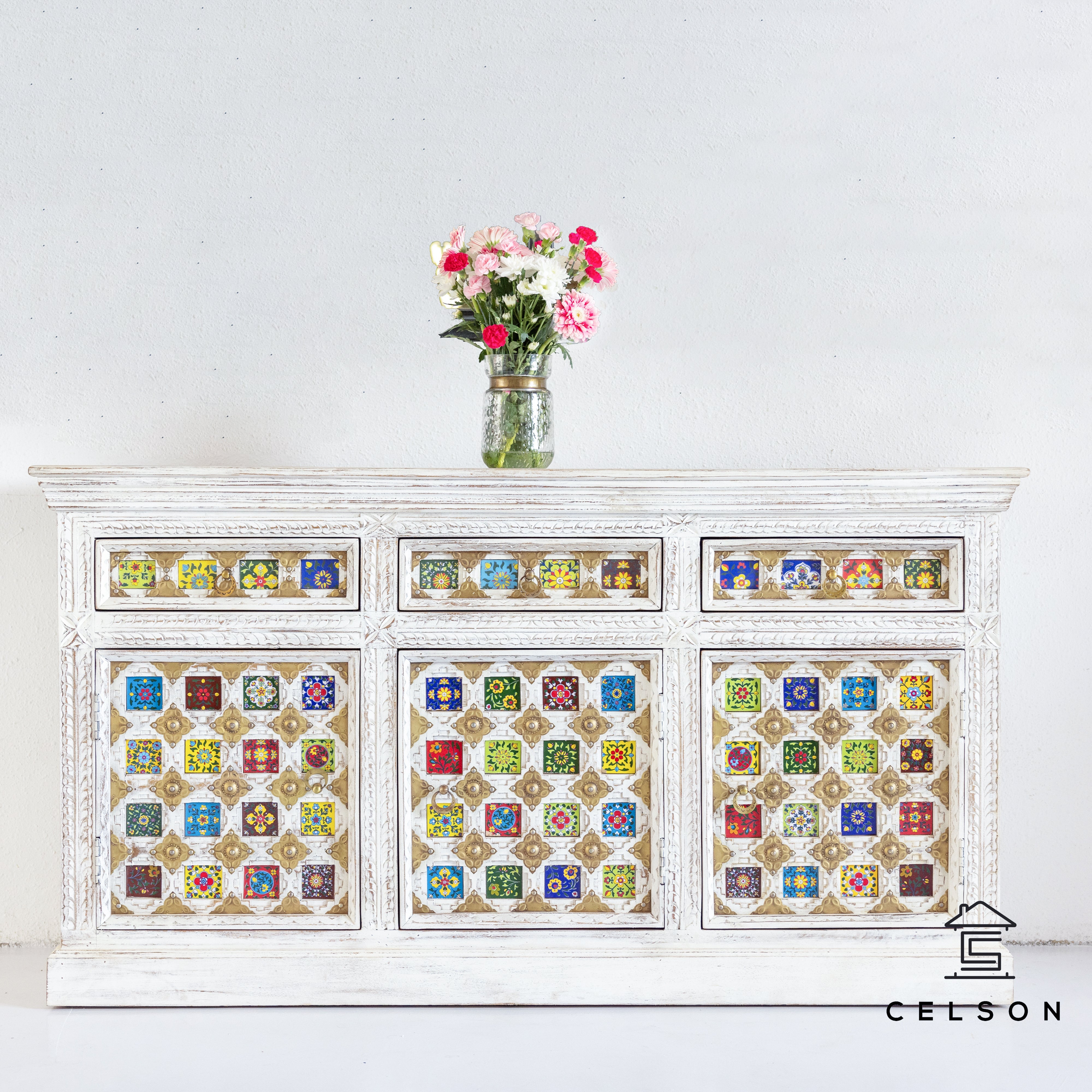Our 3 doors and 3 drawers gorgeous sideboard with multi color ceramic tiles, this beauty can be used in the dining area to store dinner ware and serve ware or in the bedroom to stores clothes & accessories or in the living room to store all your extra gadgets, books and stationery.