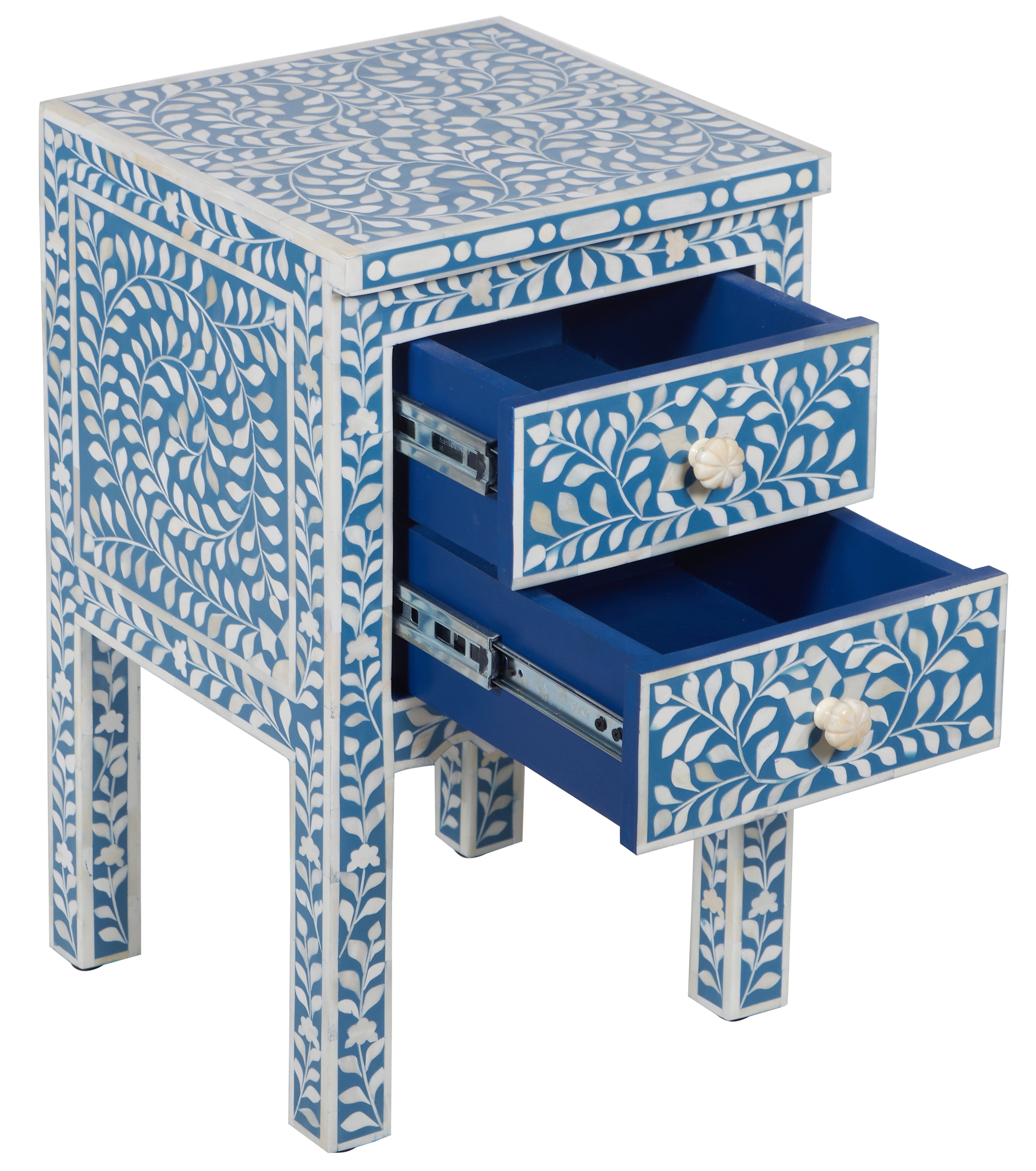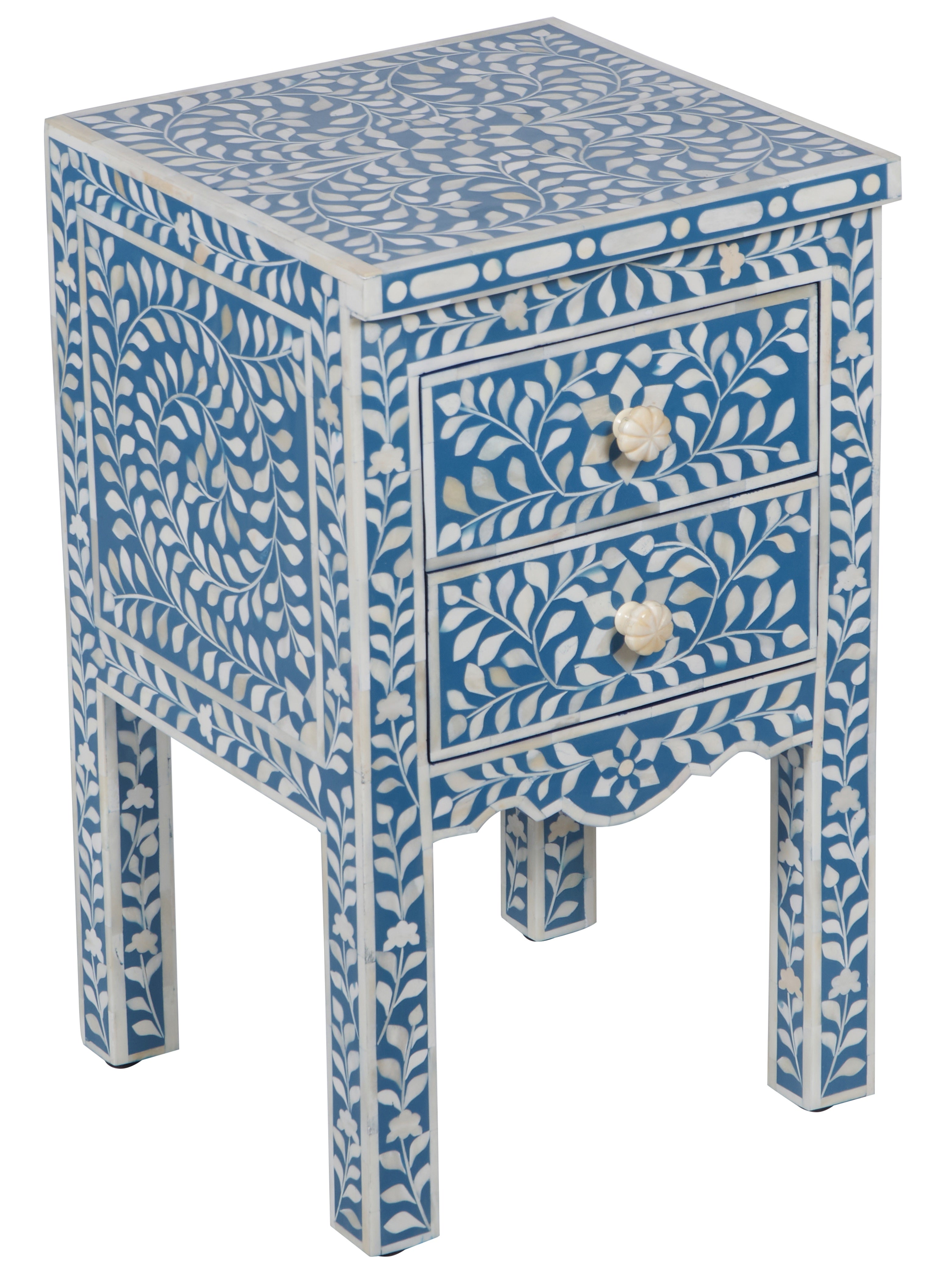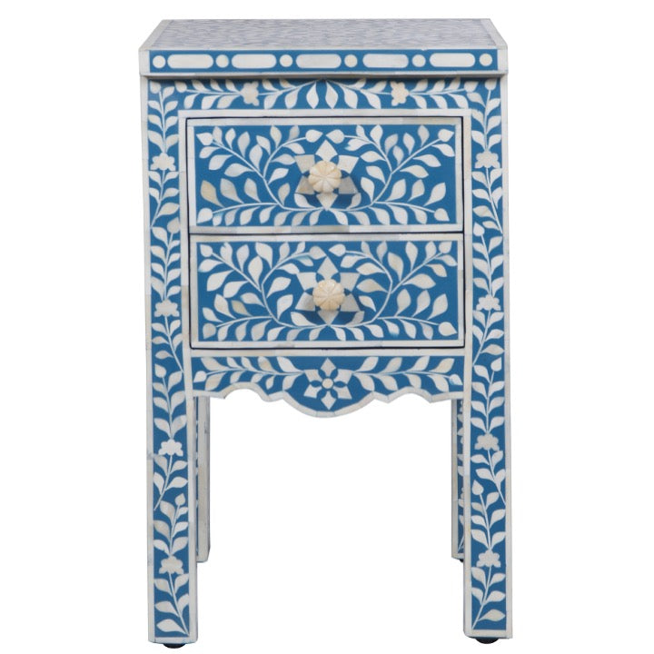 A bone inlay bedside table is the perfect touch! Its floral pattern complements any decor, and with two drawers, it’s great for storing your night-time essentials.