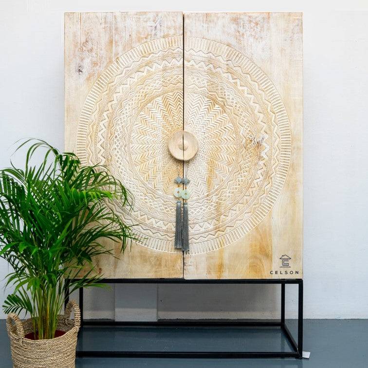 Our hand carved, white washed Moore tall cabinet can be a perfect cupboard. It has multiple shelves inside to neatly store all your clothes or crockery!!