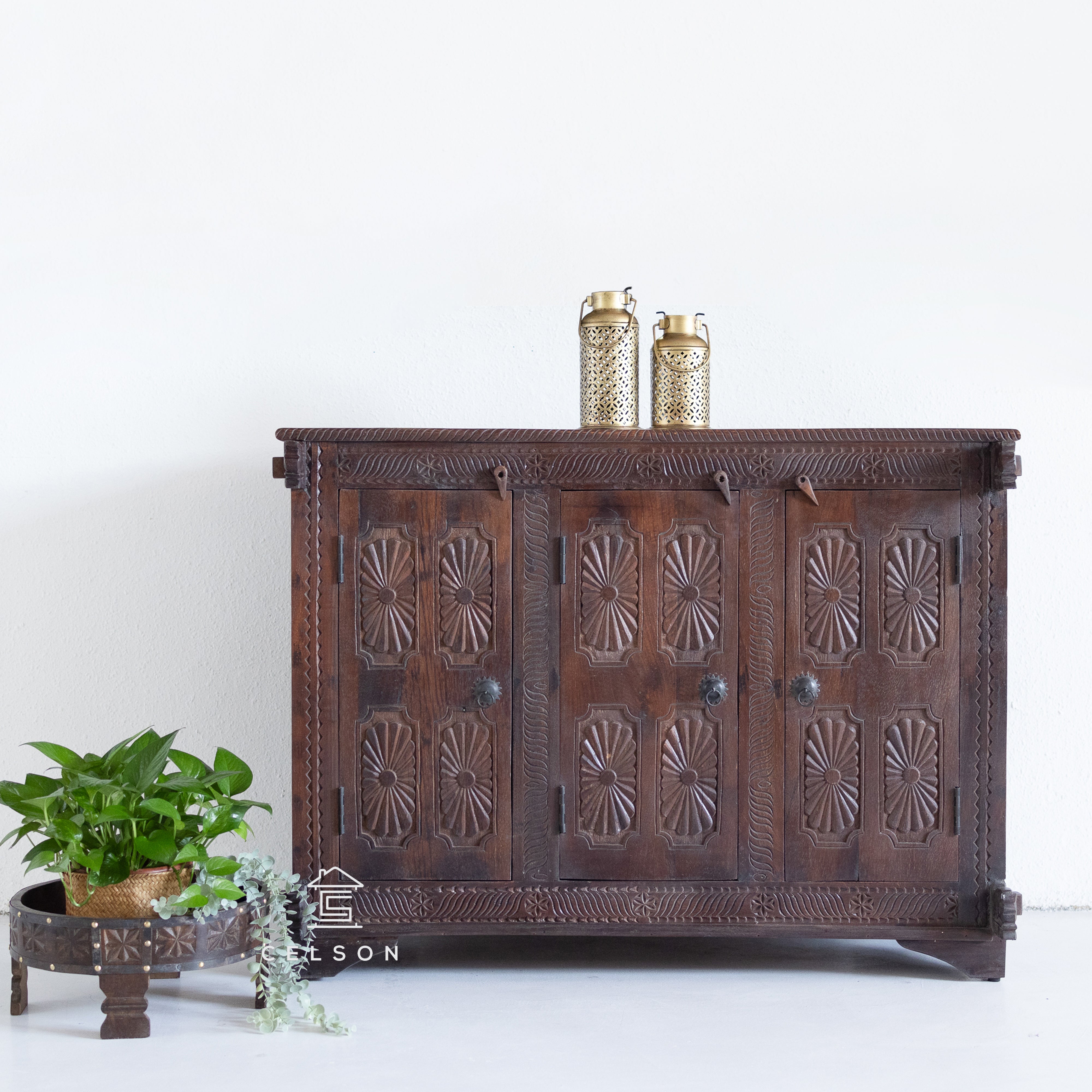 Crafted from reclaimed wood, this vintage Damchiya showcases exquisite hand carving and smart storage with inner shelves - a true heirloom for your home.