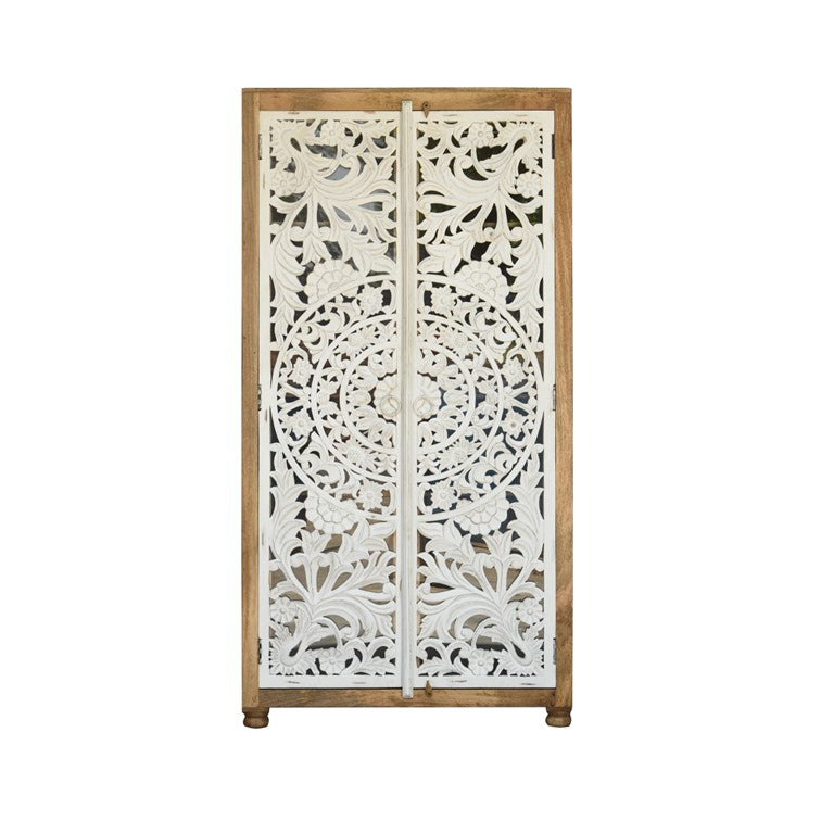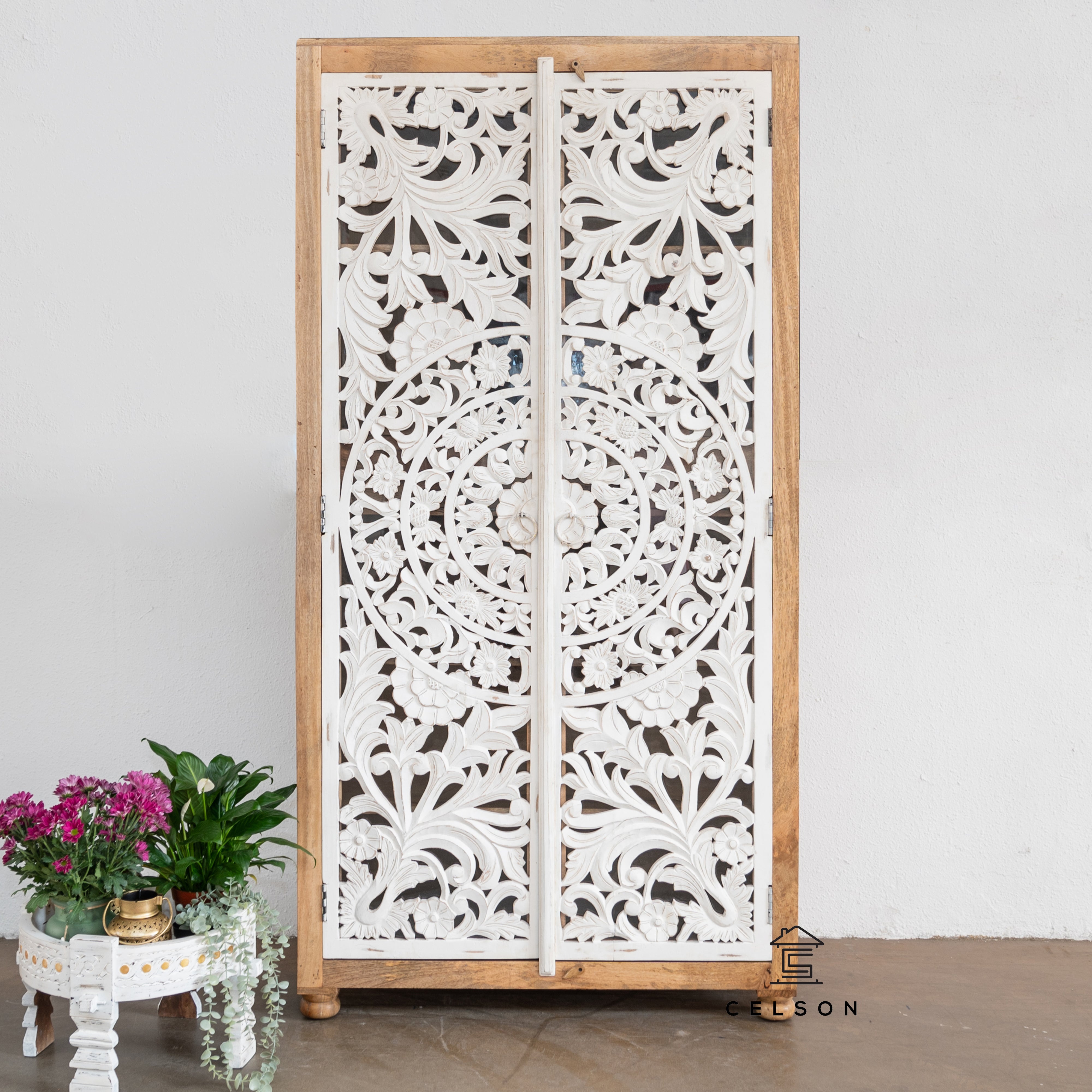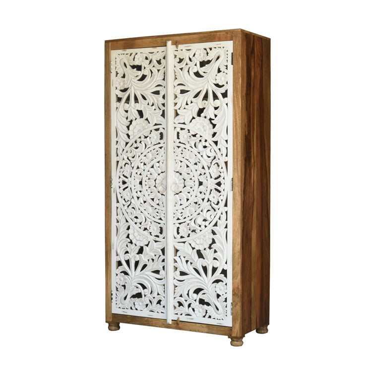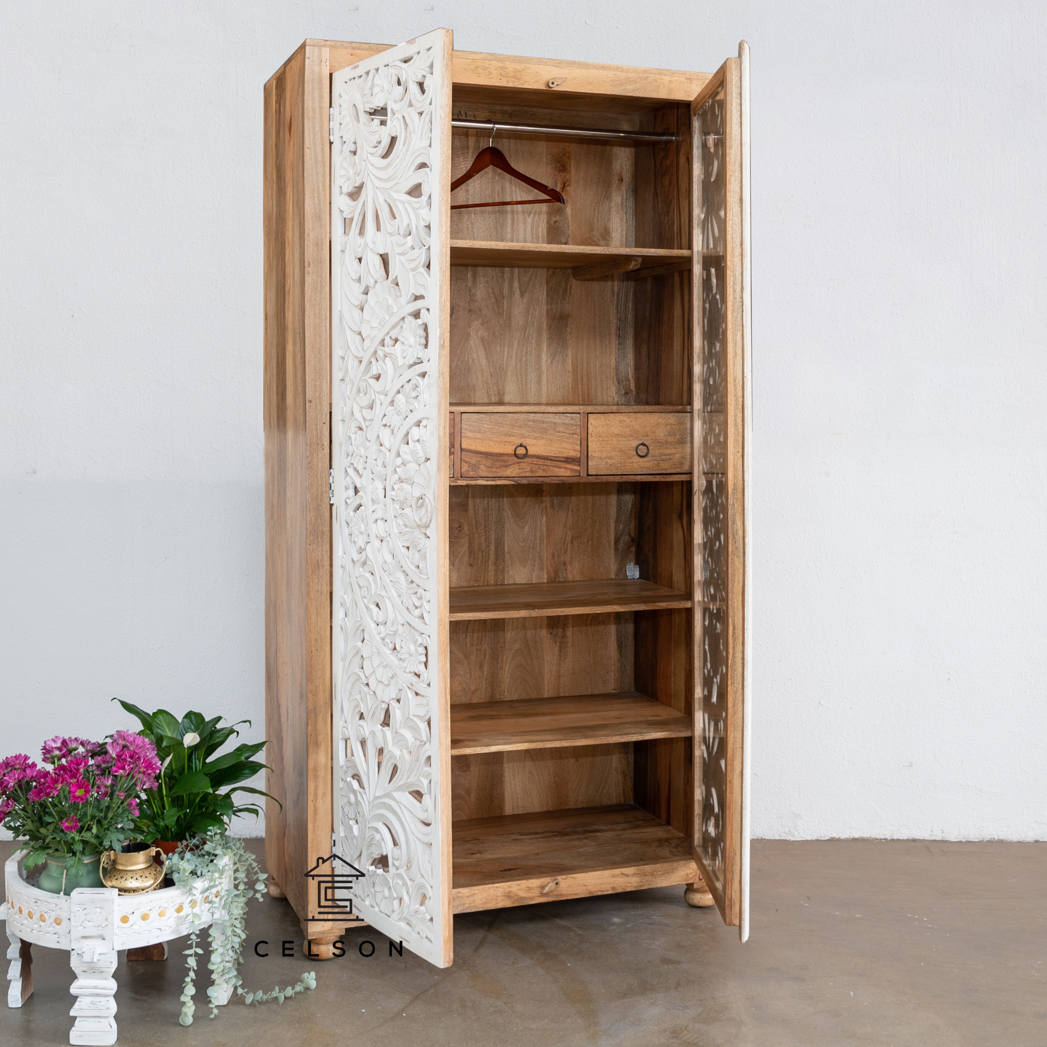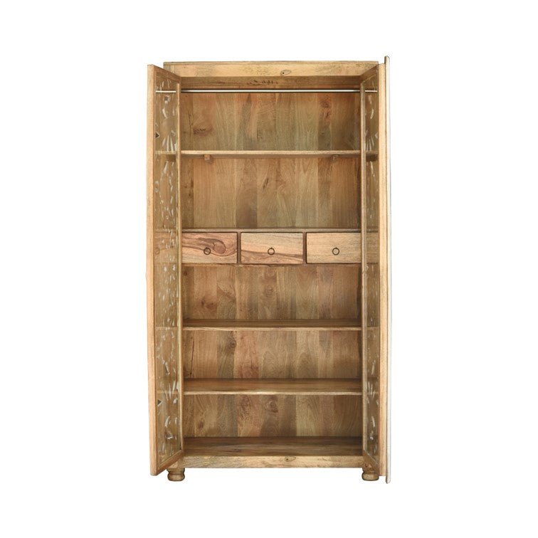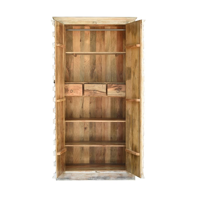 Our James almirah, having sturdy mango wood construction with beautiful natural and white washed finish works perfectly with the color scheme of any bedroom, living room, and hallway or entryway.