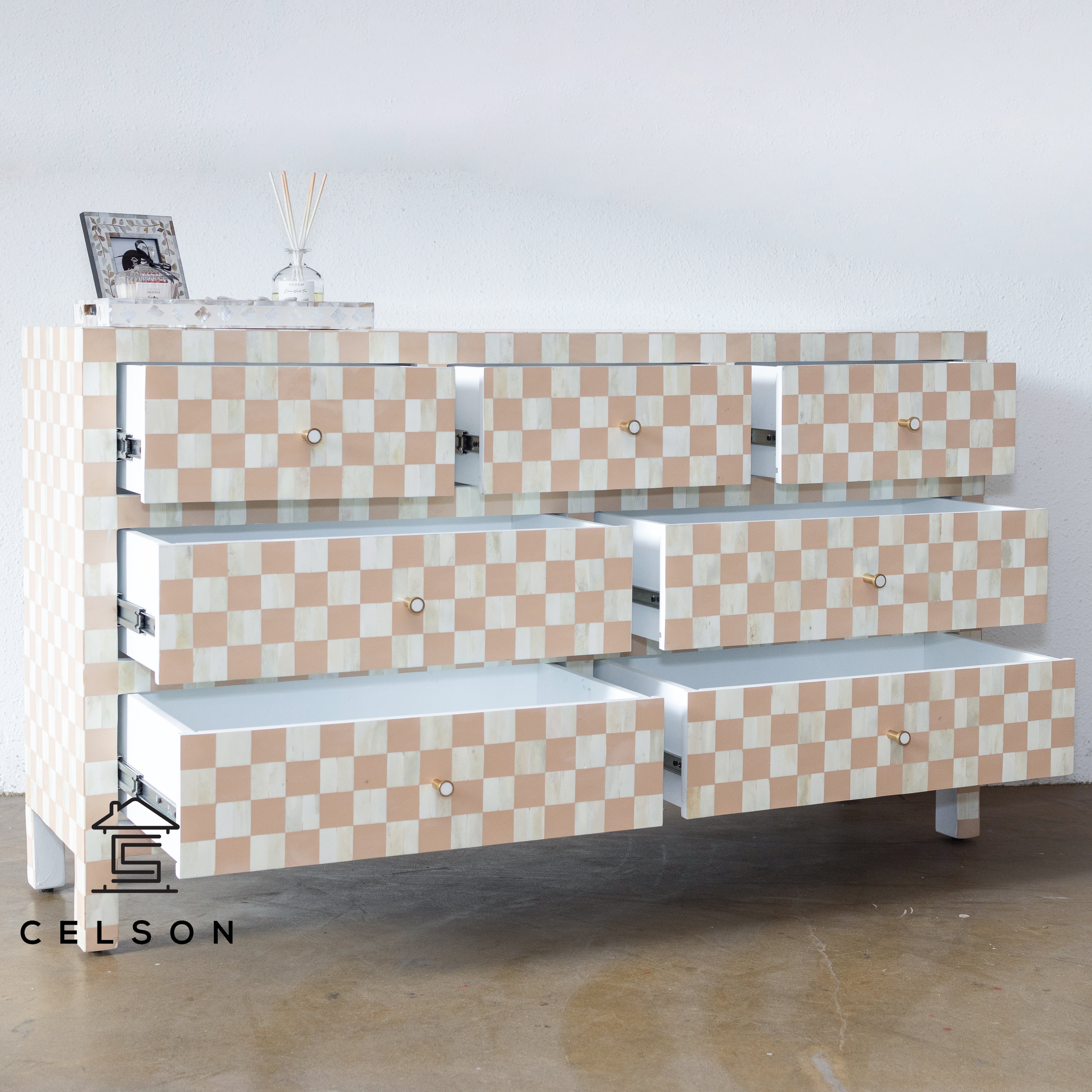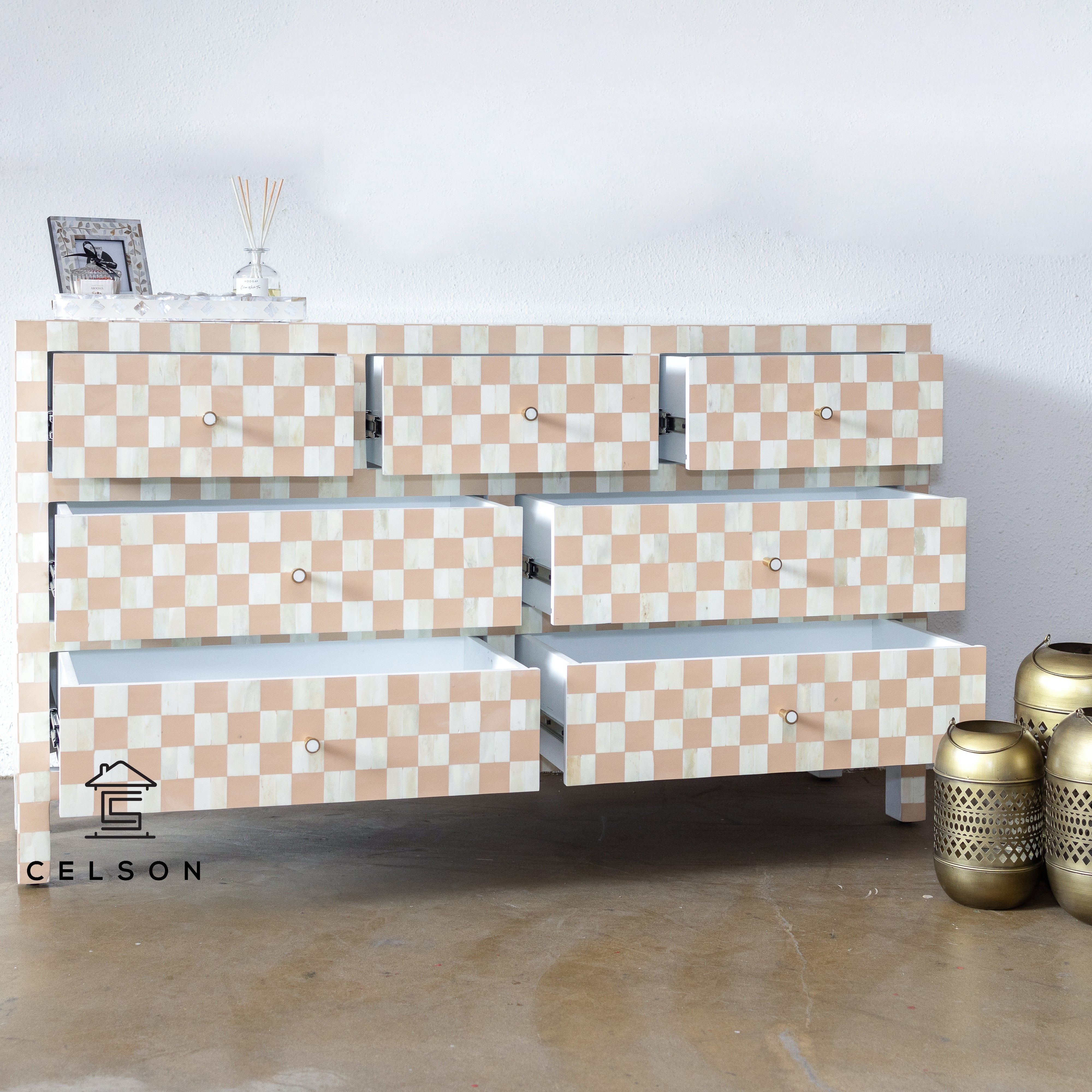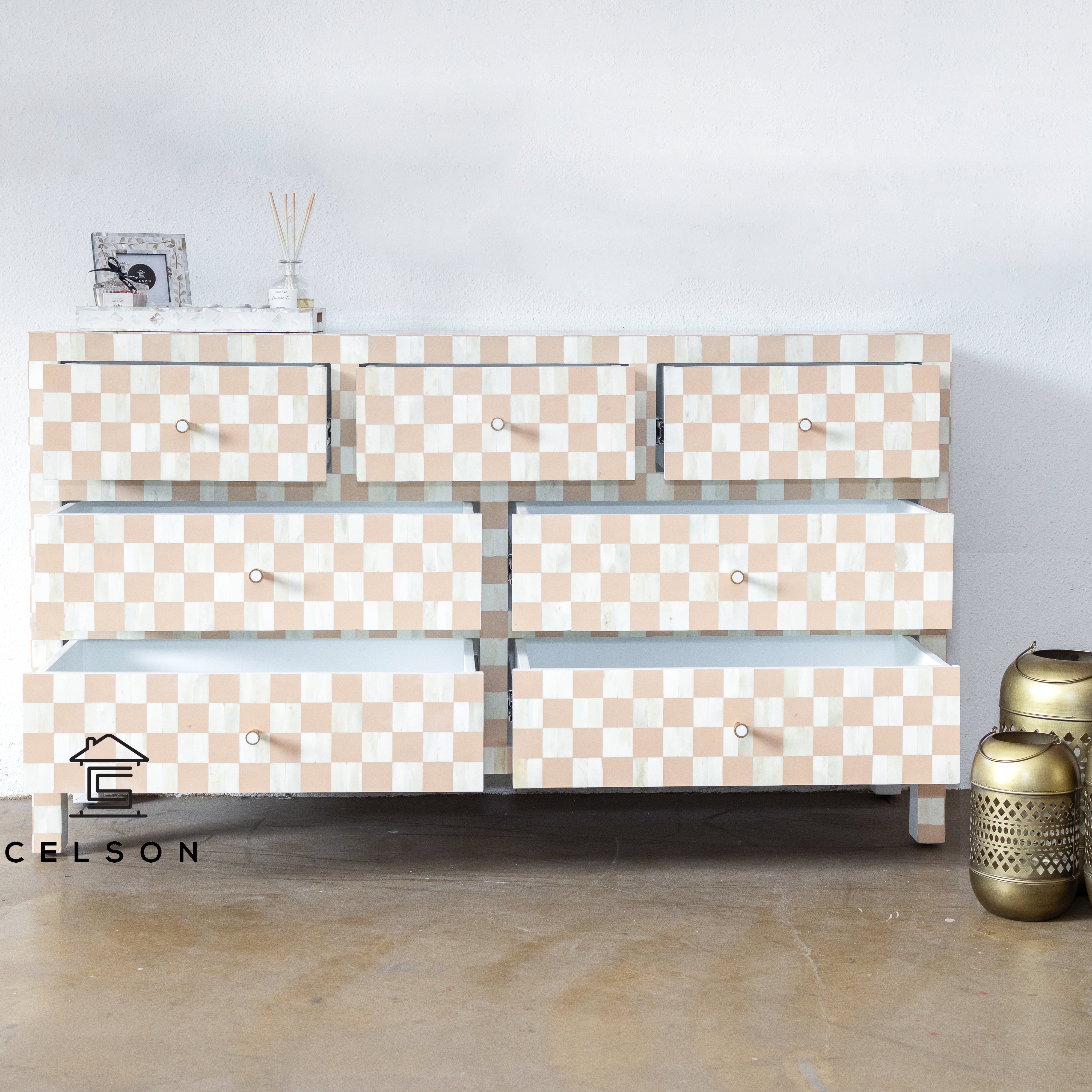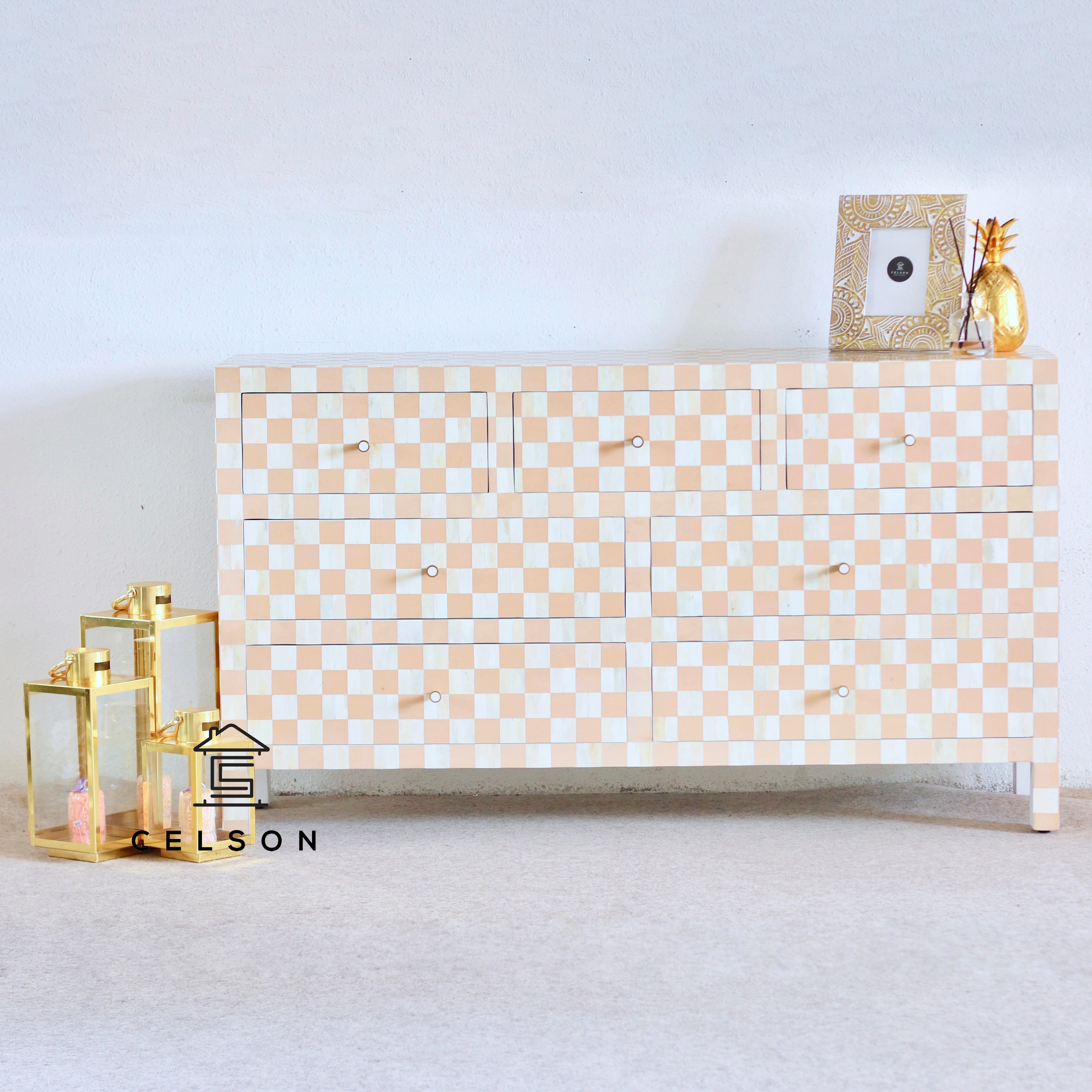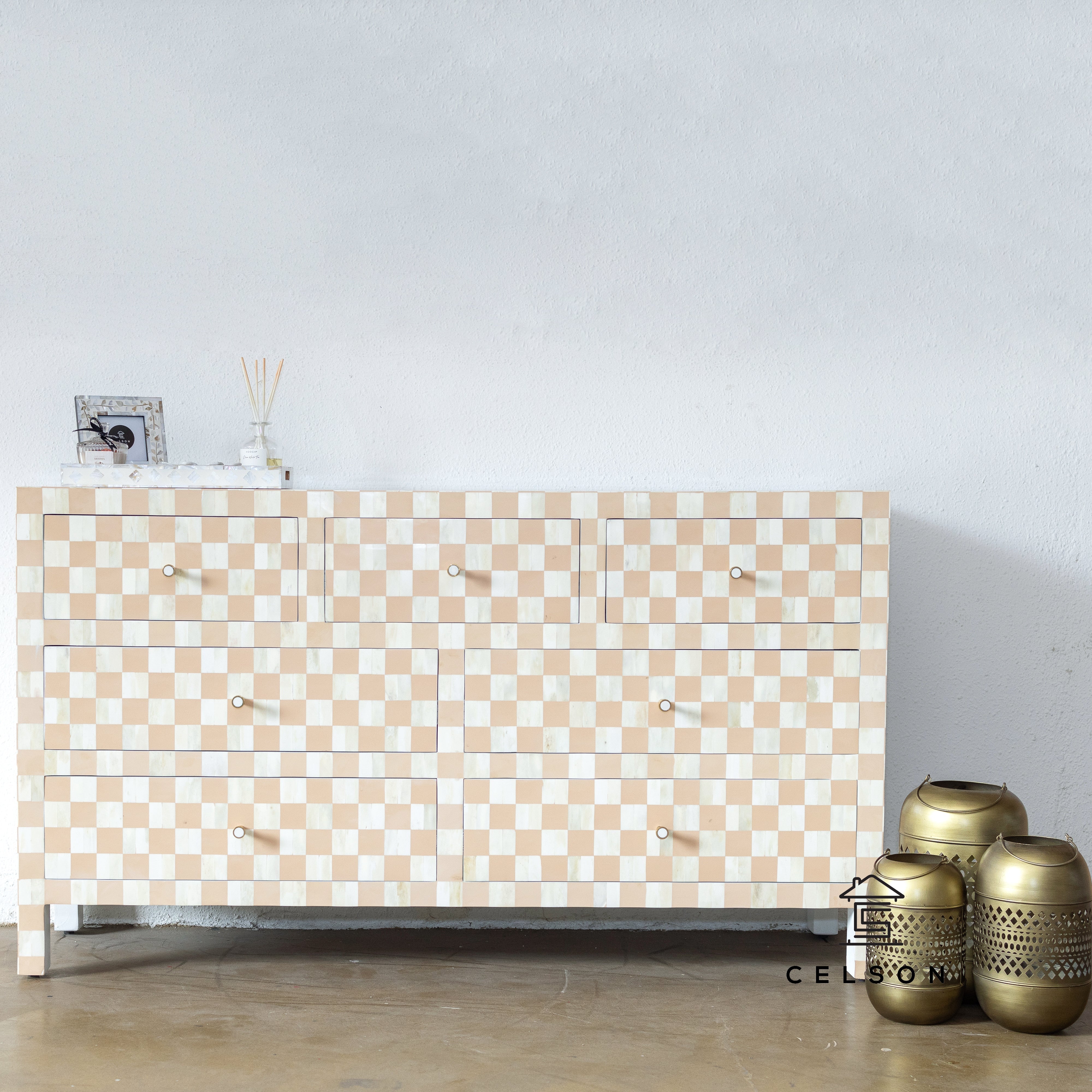 Say hello to this adorable bone inlay dresser, which enjoys a lot of popularity! This comes with seven drawers, which are set in beige color with a floral pattern all over & have brass knobs.