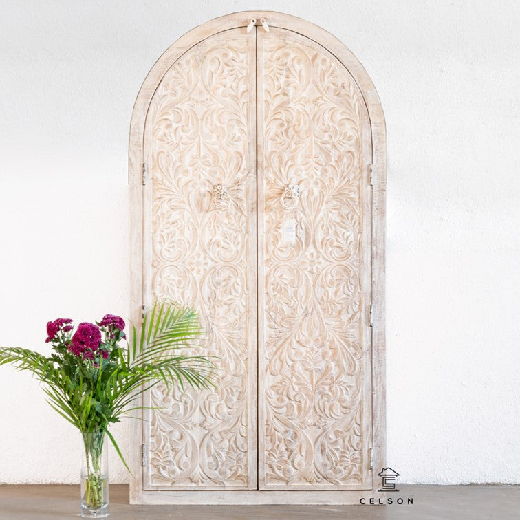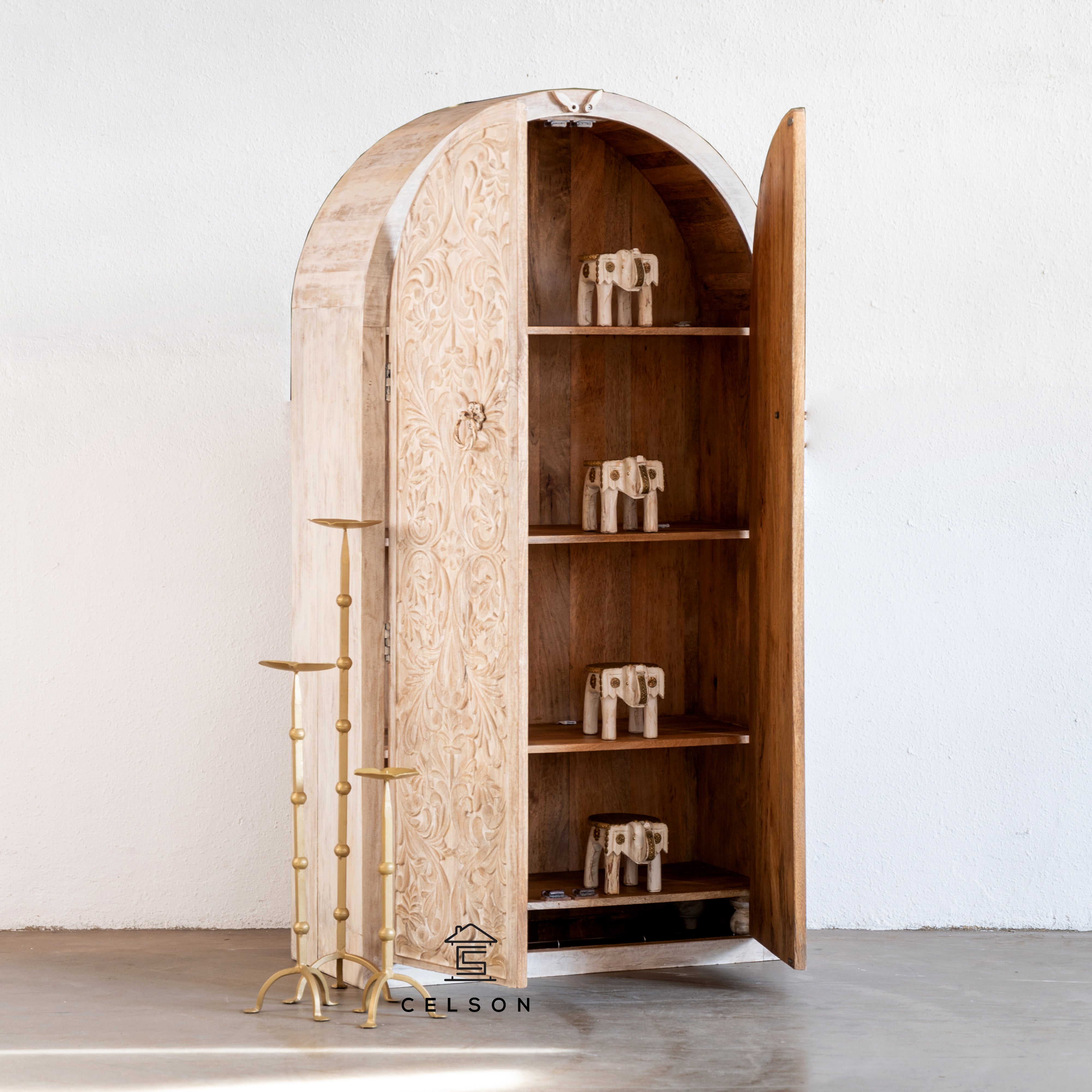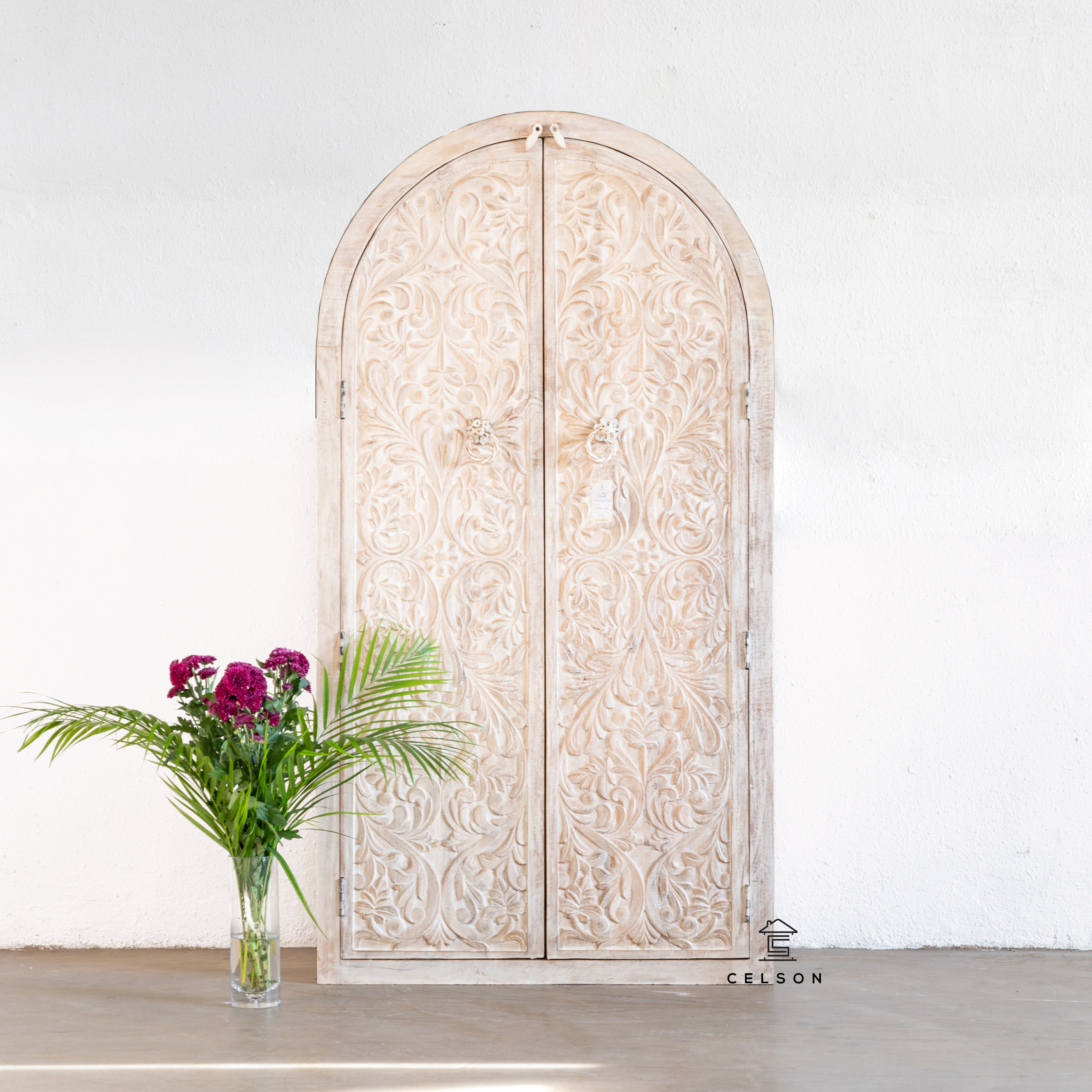 Our hand carved, distressed white tall cabinet can be a perfect cupboard. It has multiple shelves inside to neatly store all your clothes.