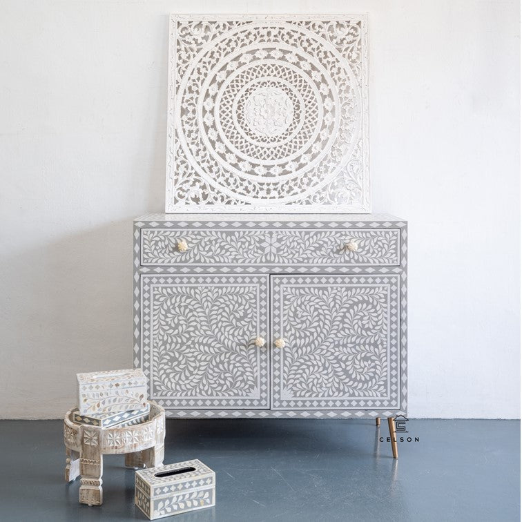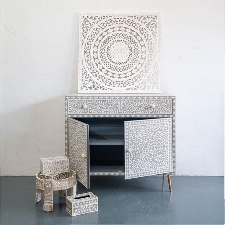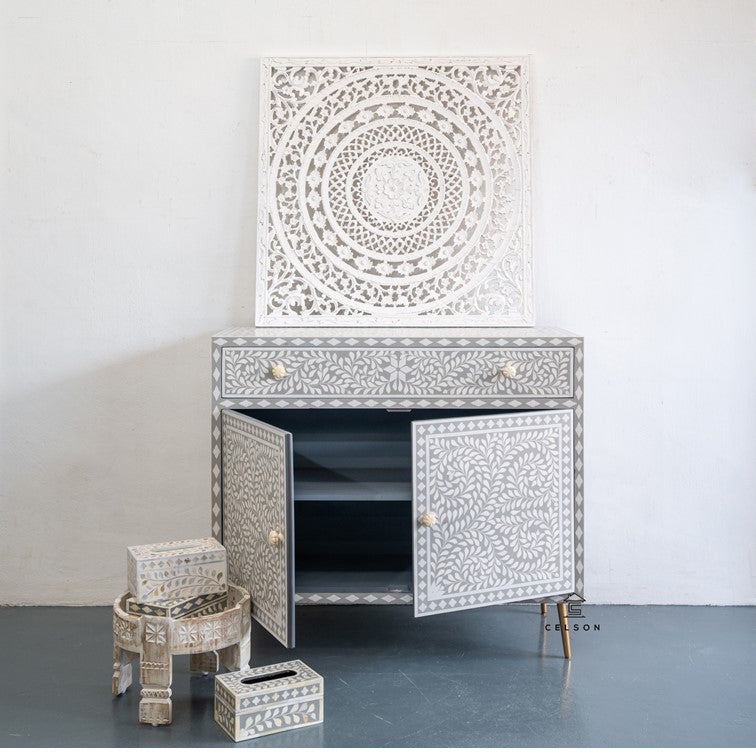 Our Raghav inlay Chest definitely makes it to the top of our favorite pieces list! Along with looking stunning it also provides a good amount of storage space with its one drawer design. It has one drawers and two doors which not only look aesthetically pleasing but help in storage too!