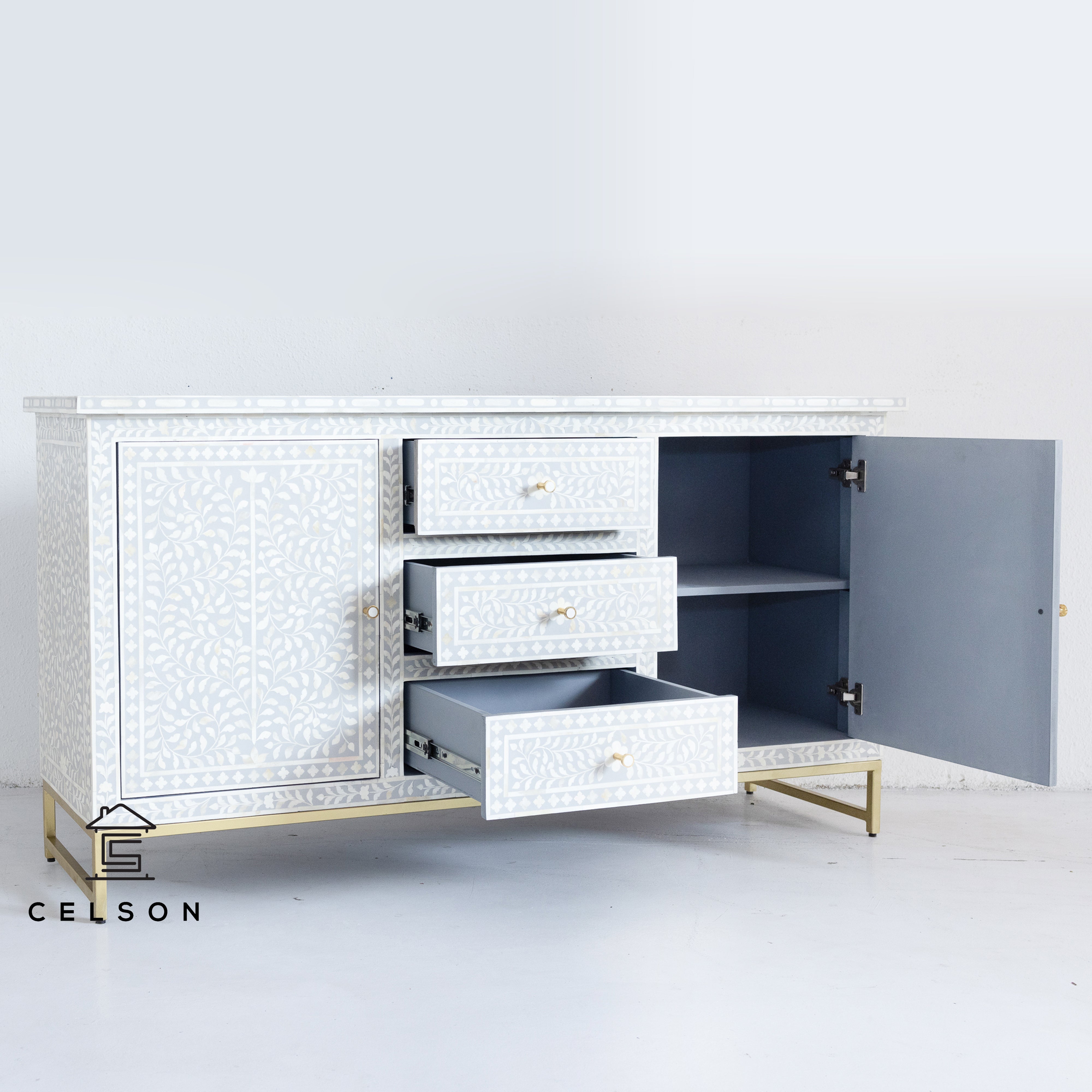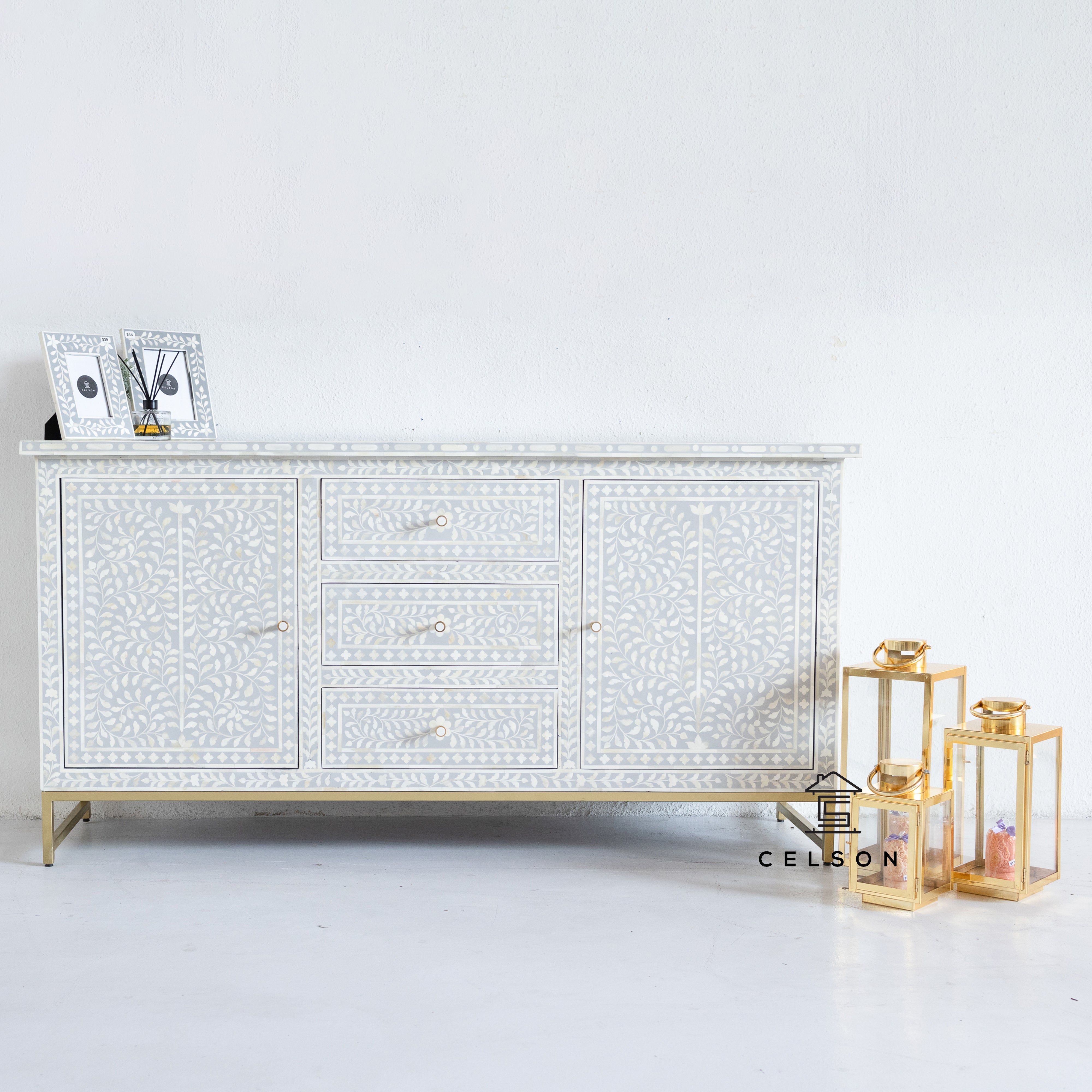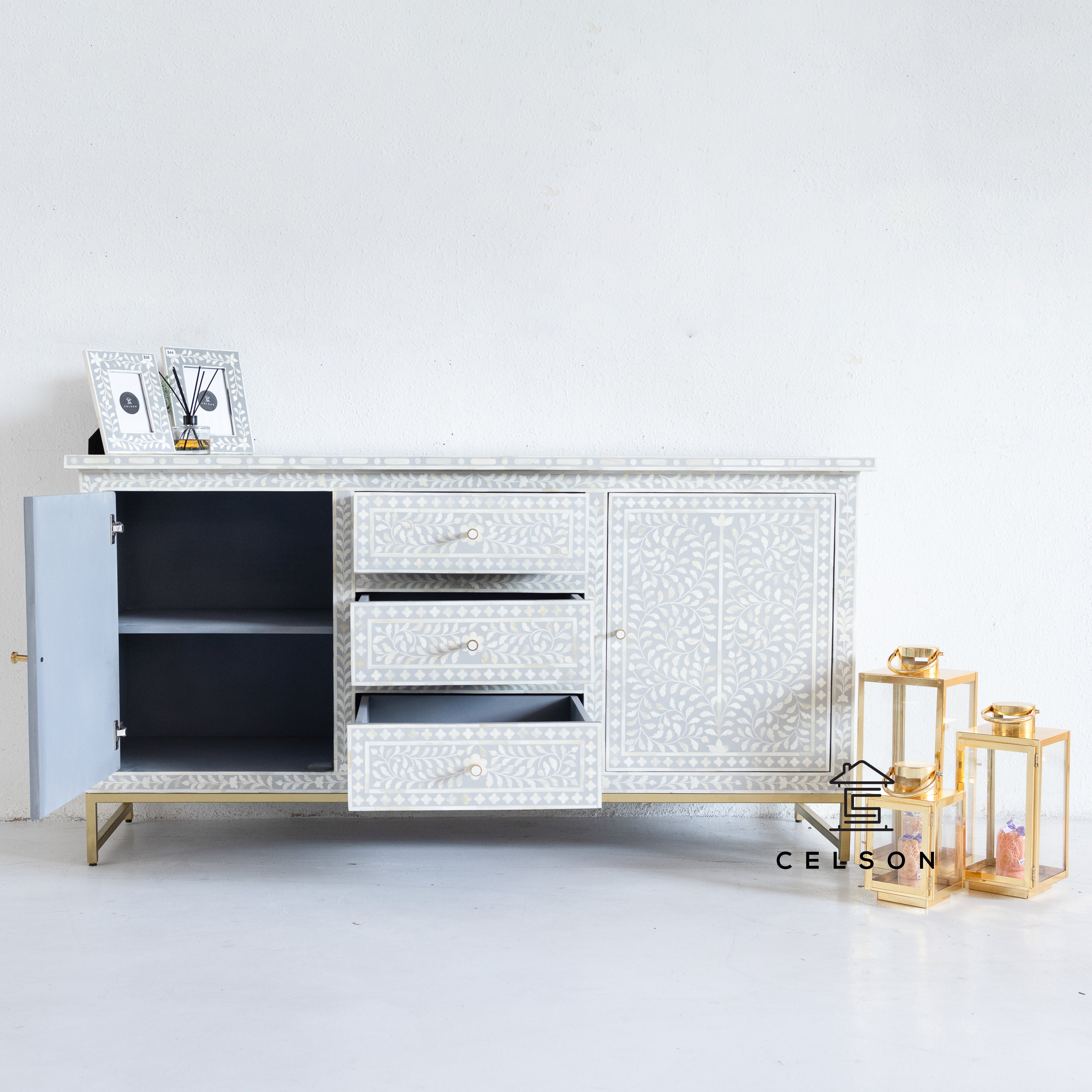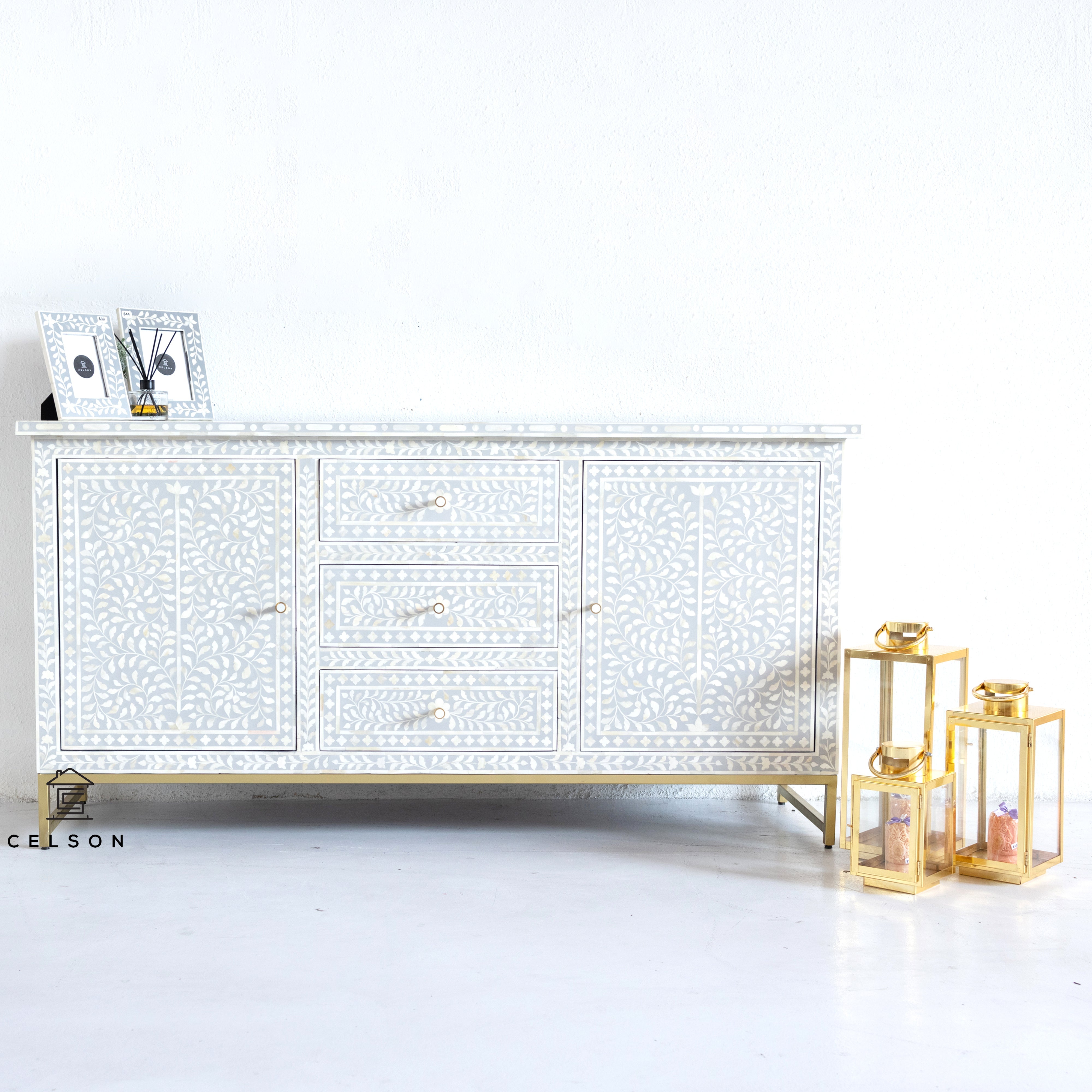 With a floral pattern & a stunning Grey color, this side board is bound to make you feel like modern day royalty!