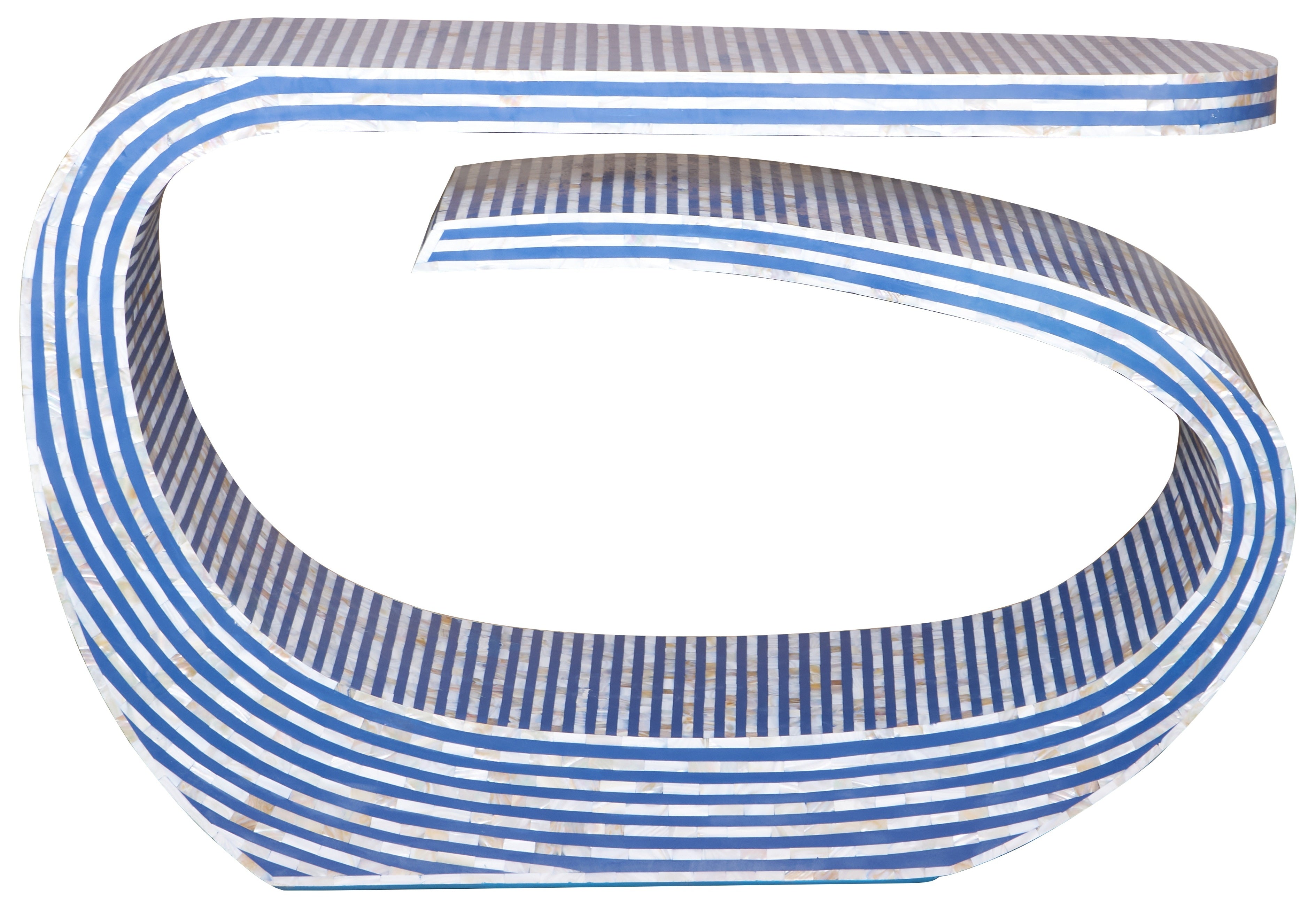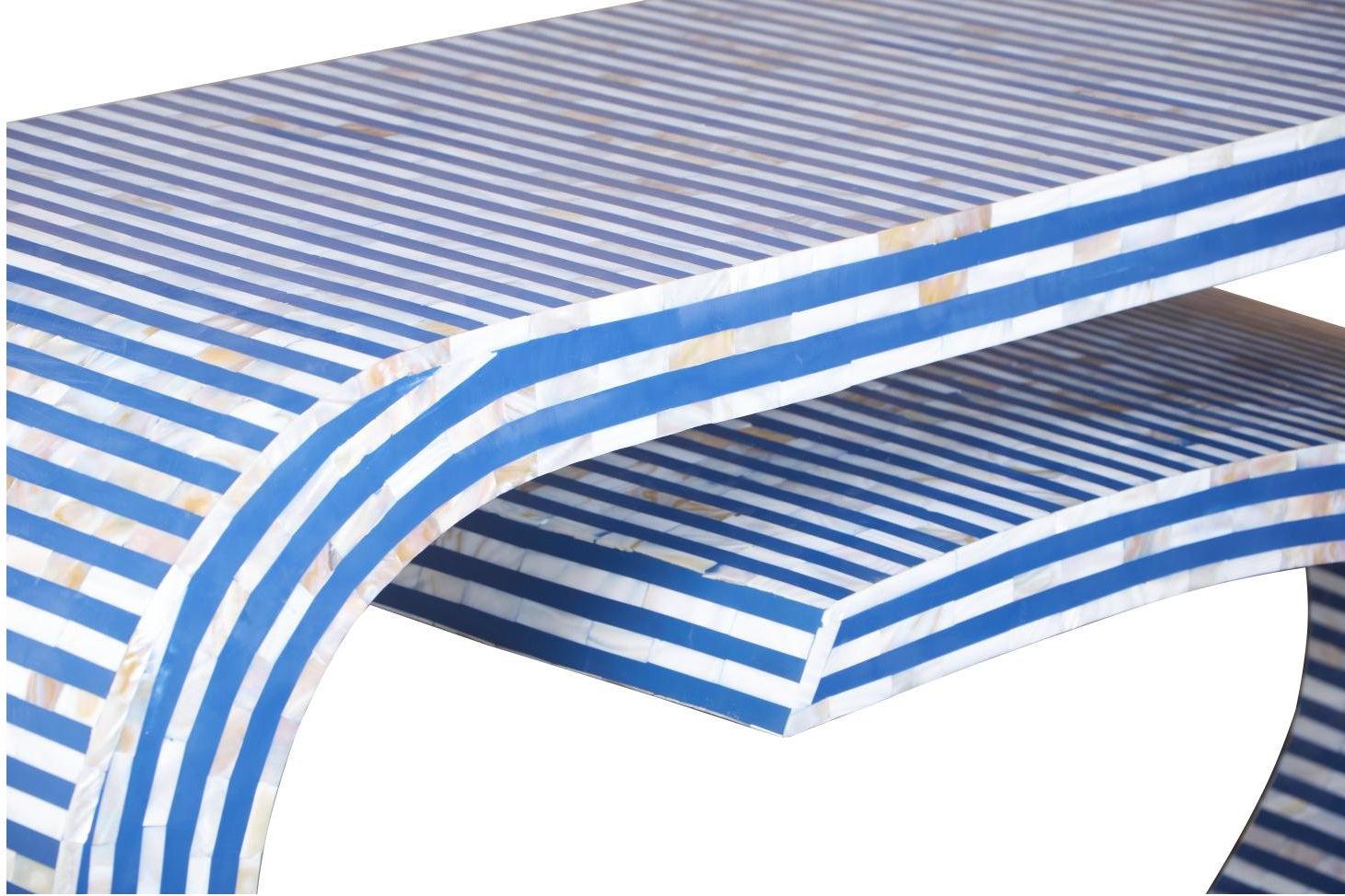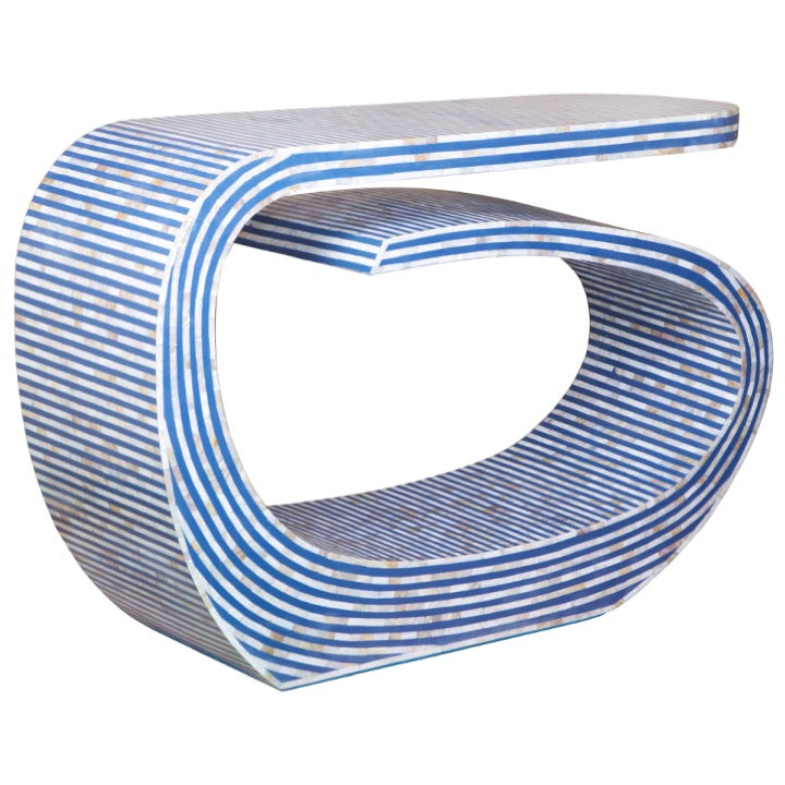 With its graceful curvy silhouette, bold blue stripe pattern, and shimmering mother of pearl inlay, this console is the perfect balance of elegance and uniqueness.
