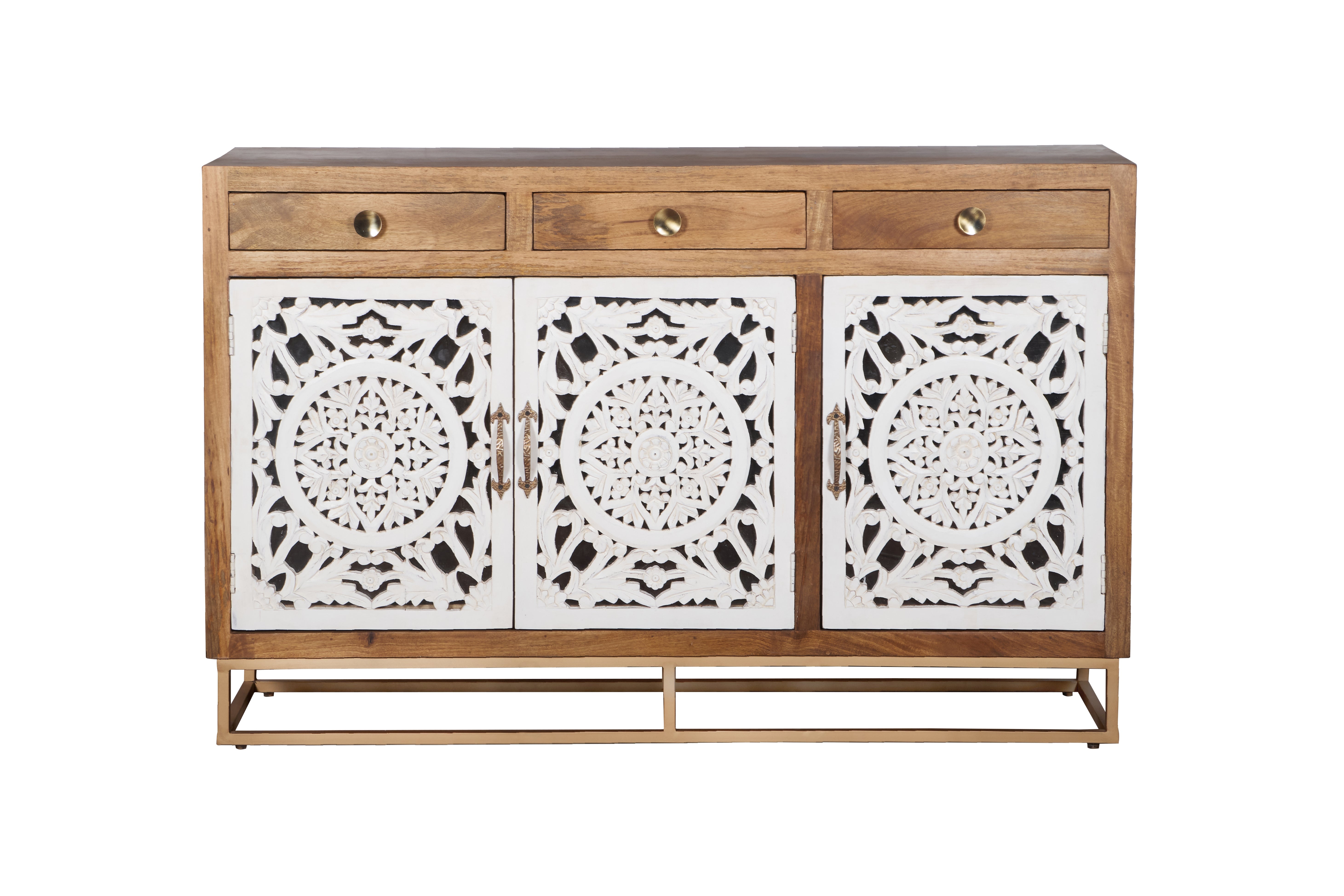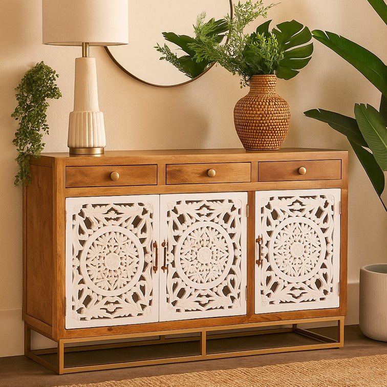 This white and natural wood sideboard features detailed carving and smart storage with drawers and cabinet space - perfect for adding soul to your space.