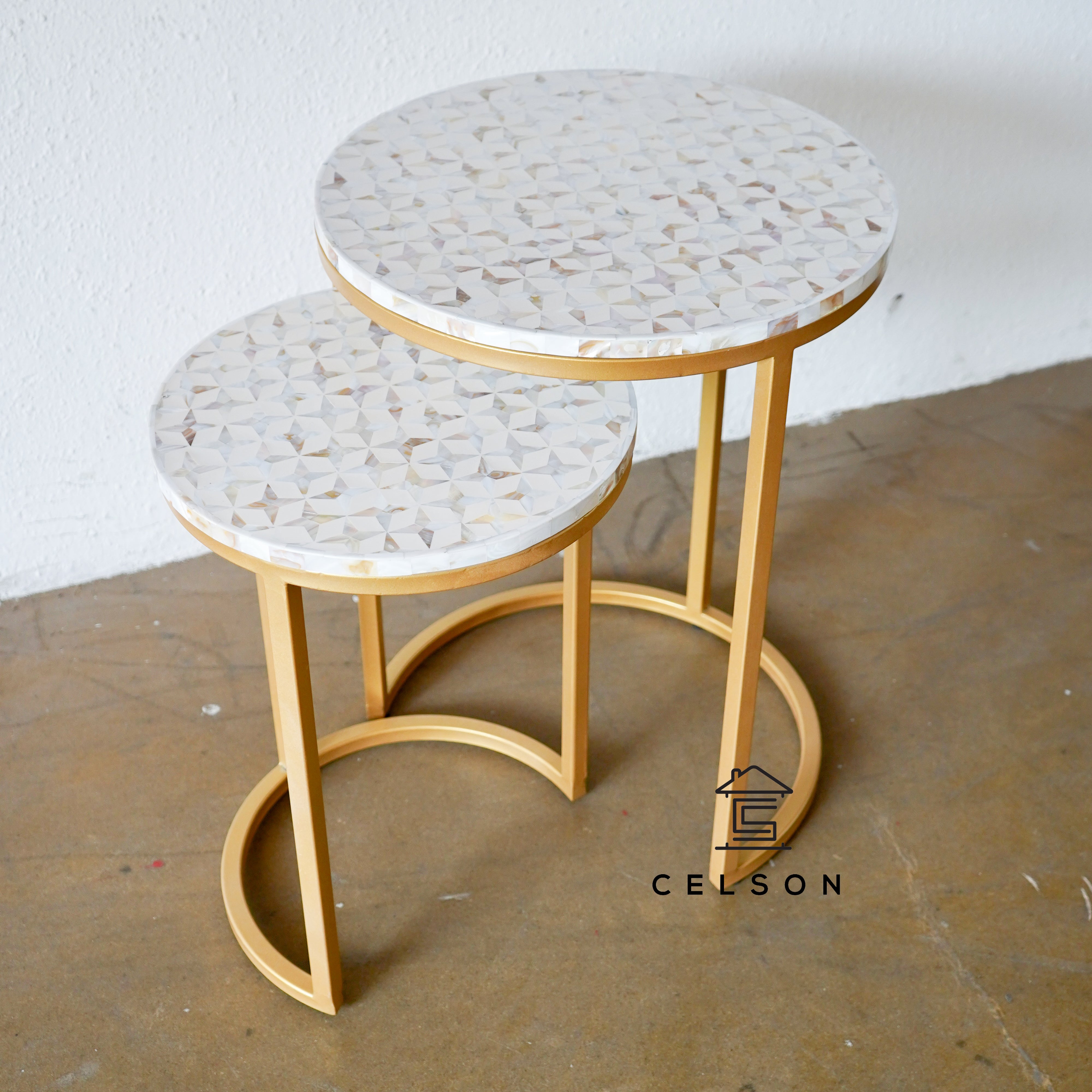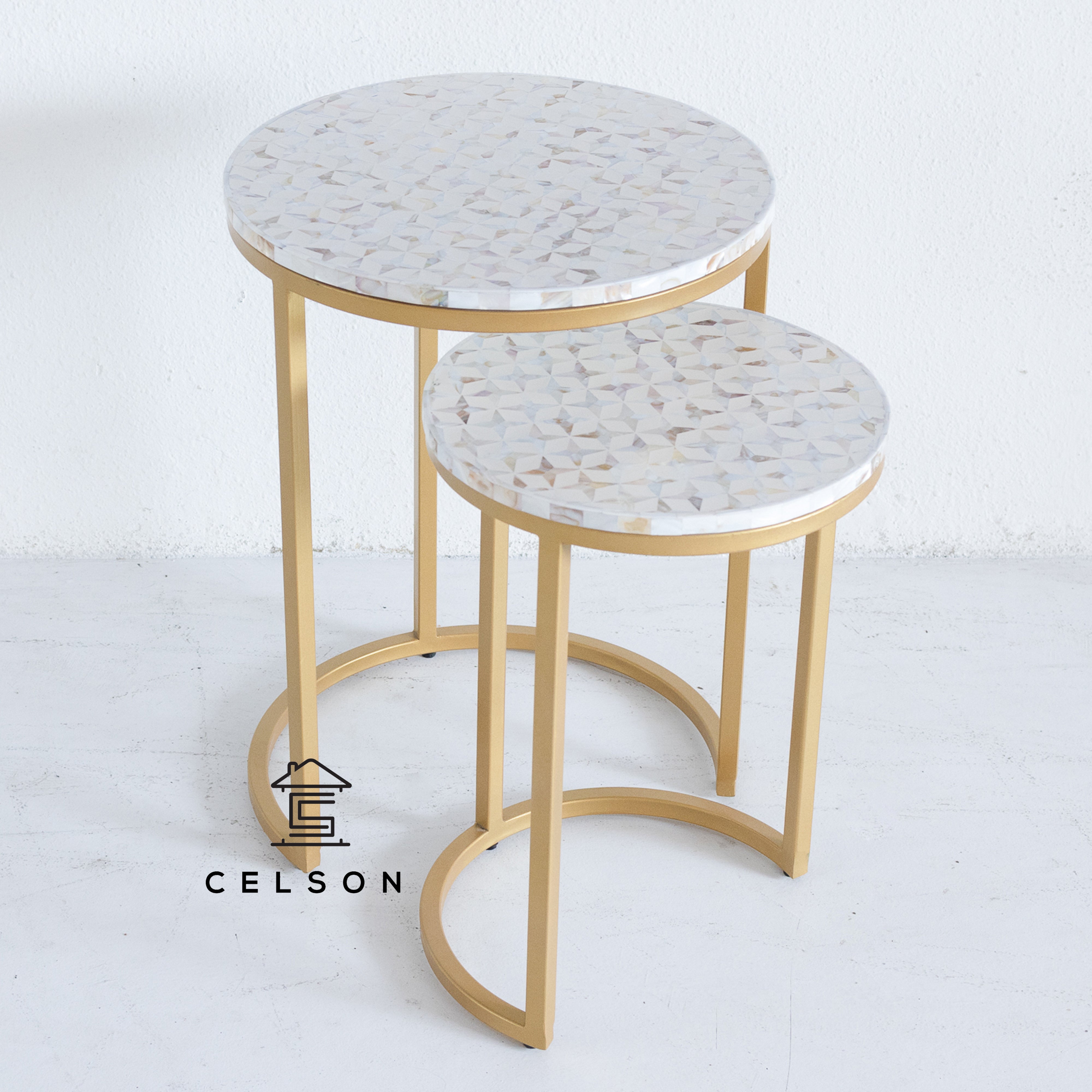 Mother of Pearl tops and gold legs make this nesting table set a showstopper!