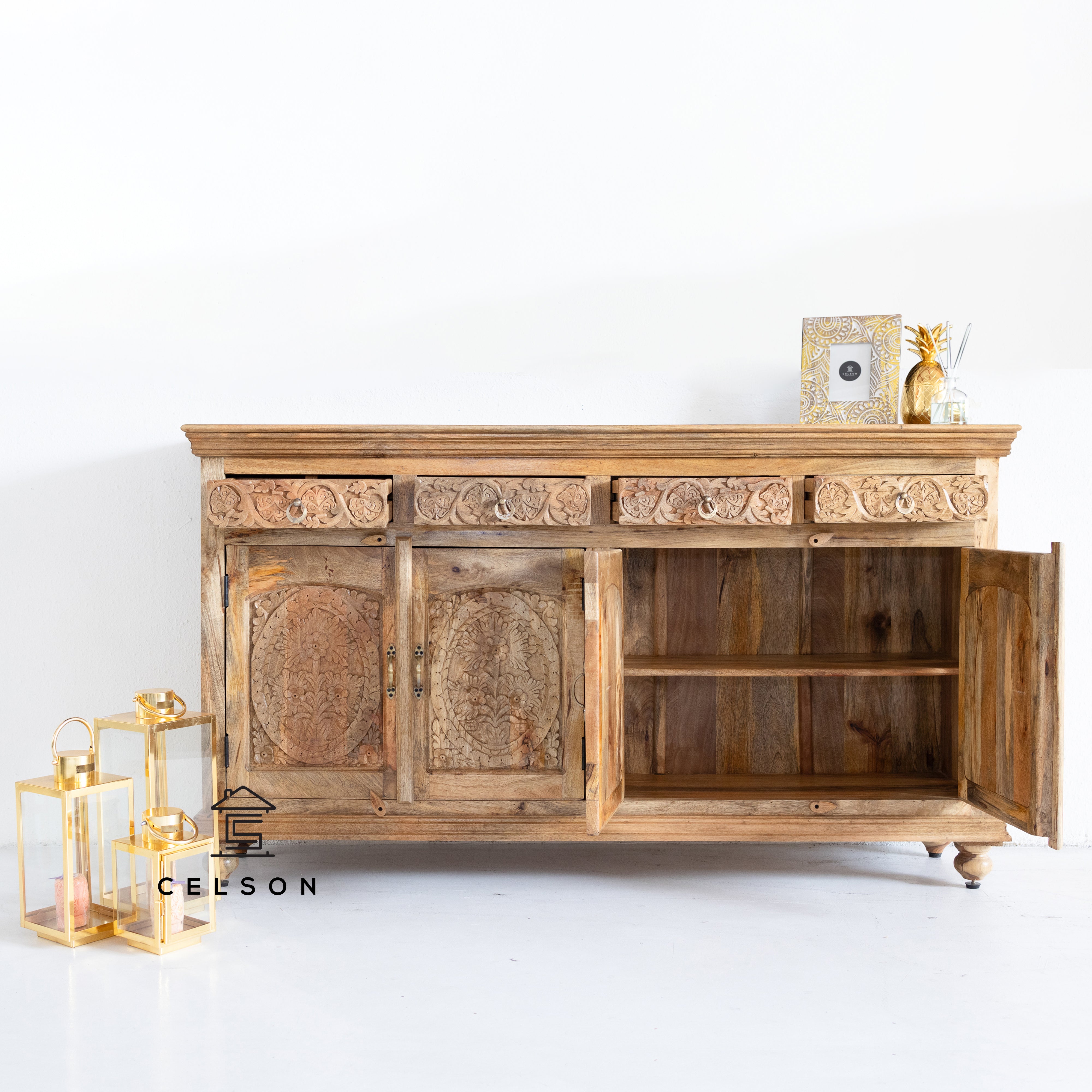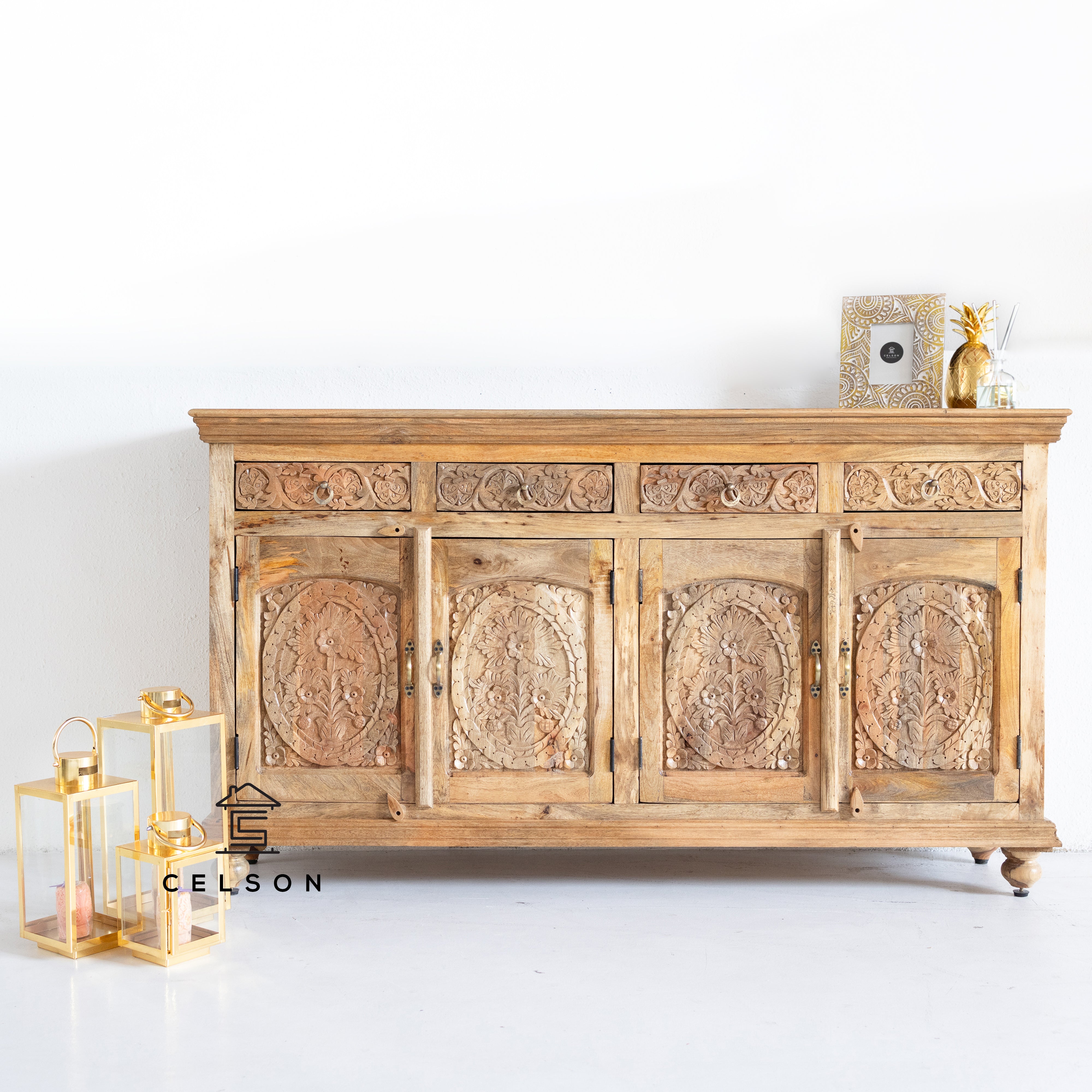 This gorgeous hand carved side board is all you need! The has 4 doors & 4 drawers, where you can easily tuck away all your extras!