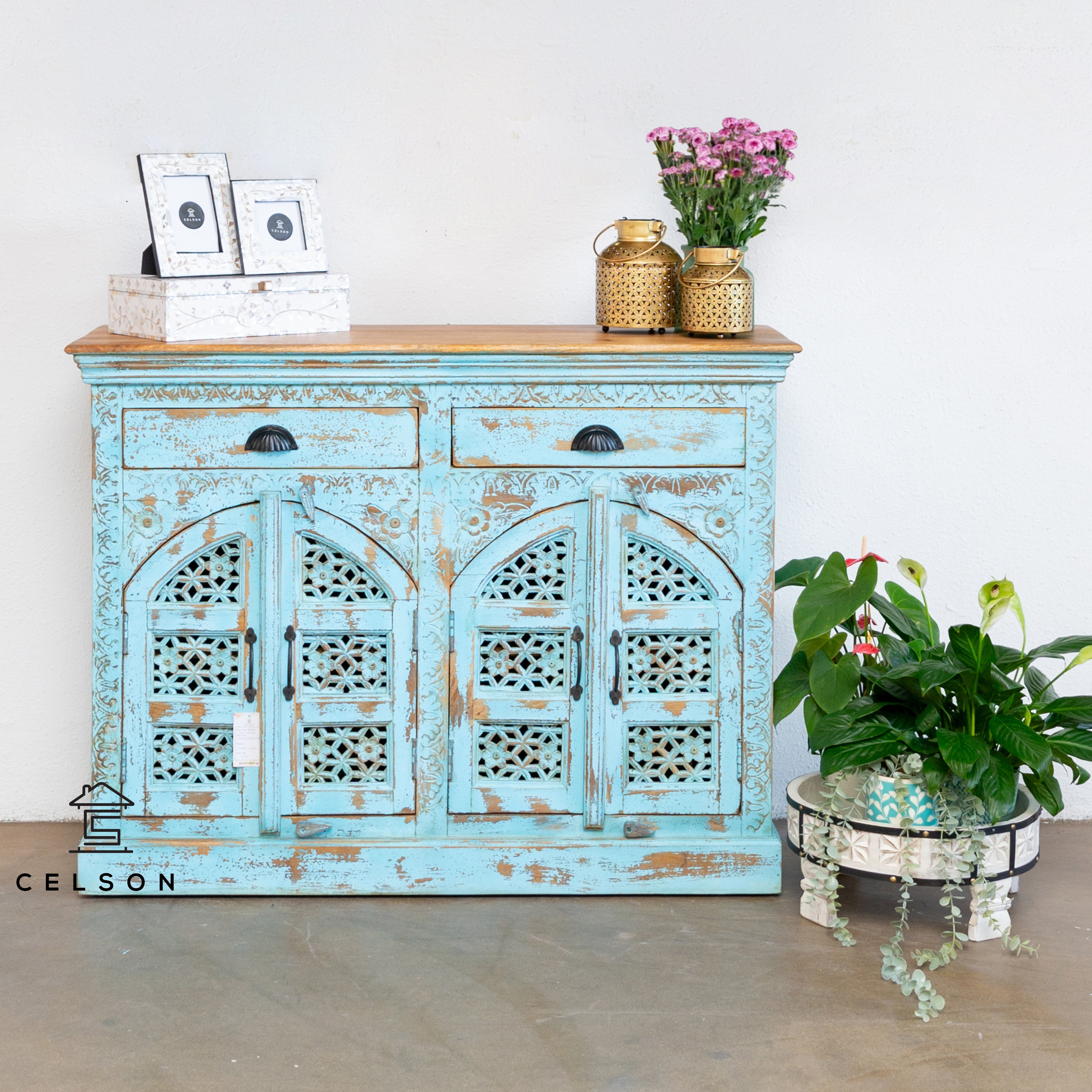 With its 2 drawers and 1 shelve inside each cabinet side and gorgeous pattern on doors, this beauty can be used in the dining area to store dinner ware and serve ware or in the bedroom to stores clothes & accessories or in the living room to store all your extra gadgets, books and stationery.