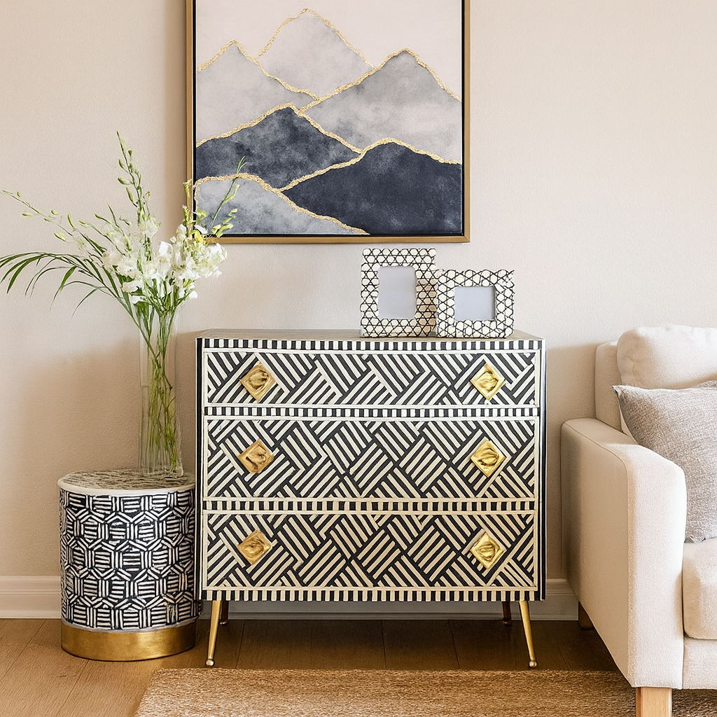 Set in a stripe pattern & a lovely black & White colour, this cabinet is a must have piece!