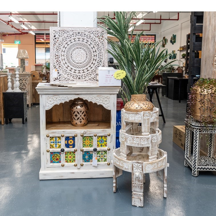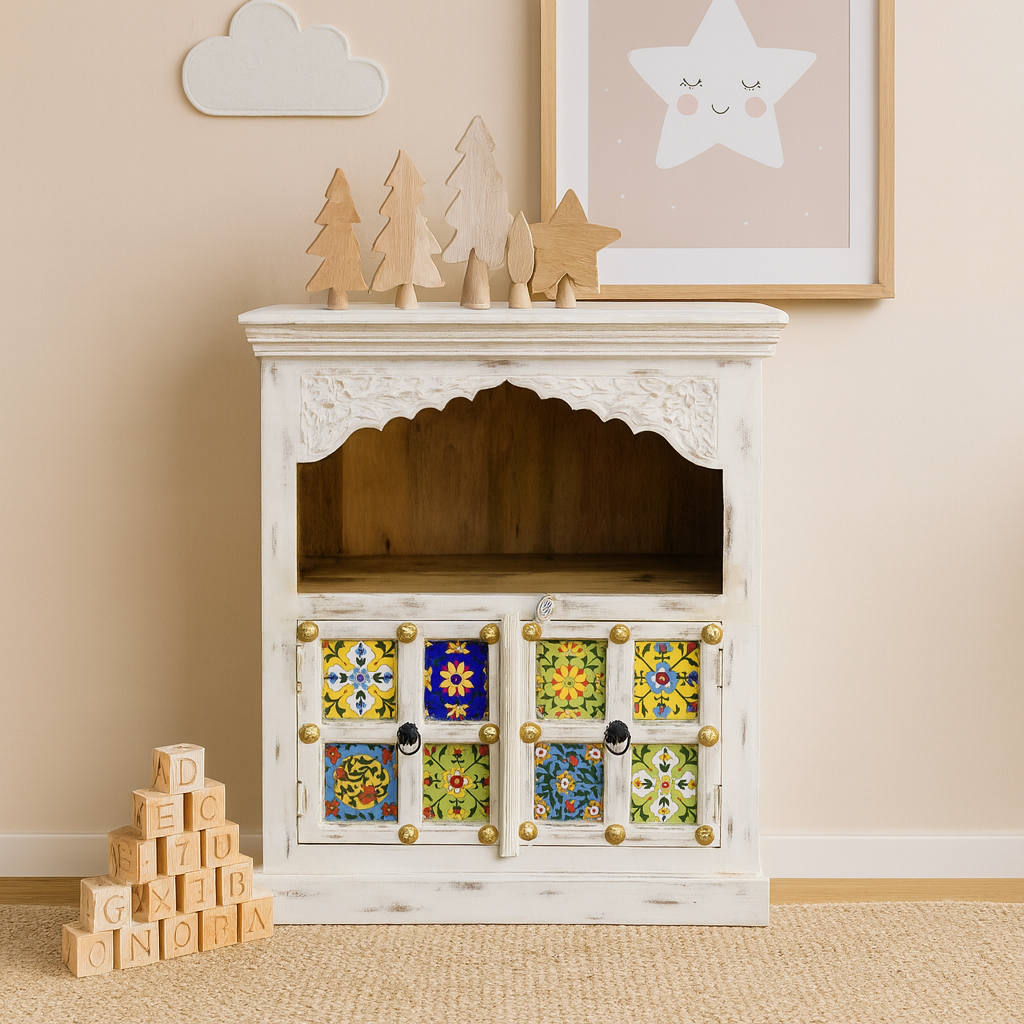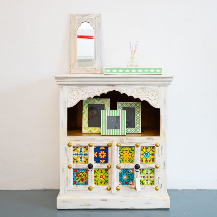 Tile cabinet but with a twist! A solid wood multi color tile cabinet comes in white distress finish.