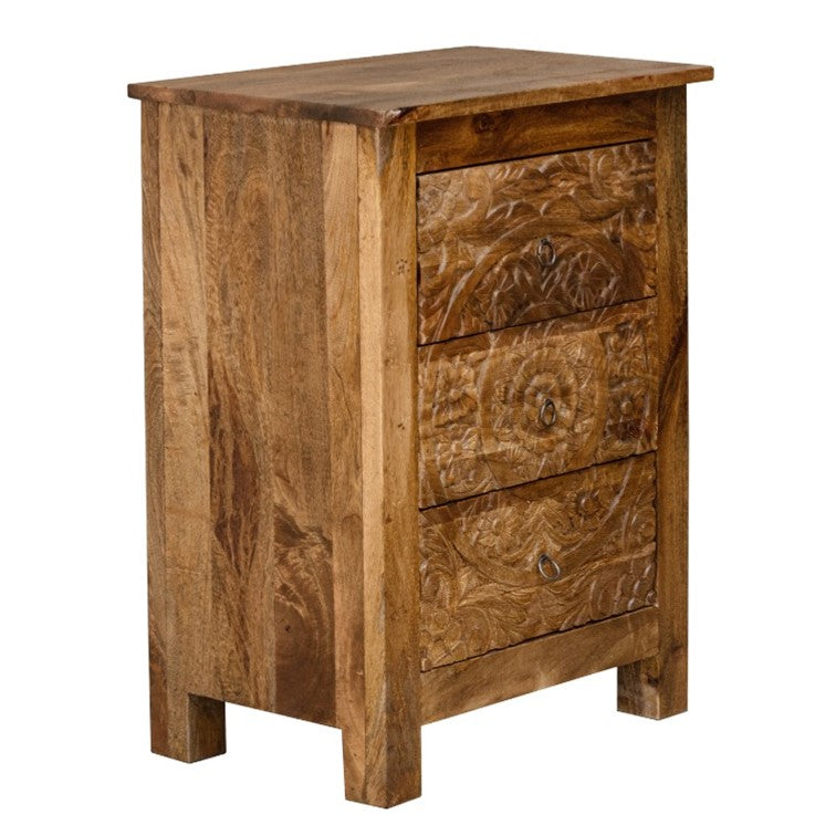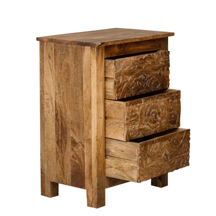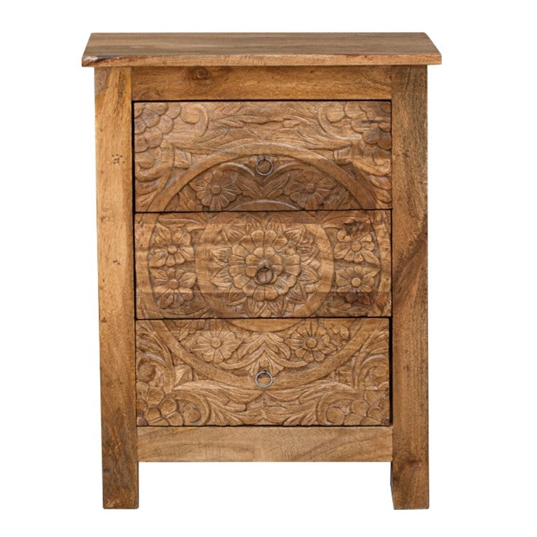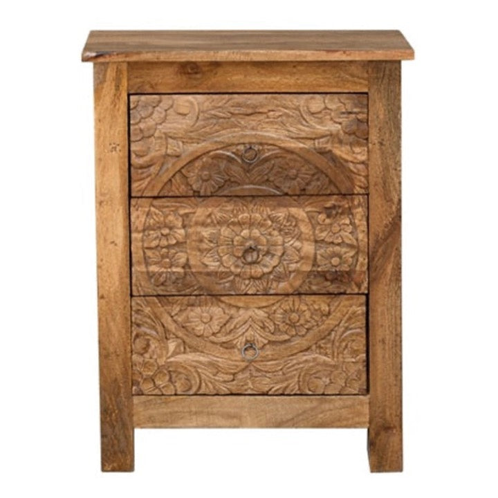 The eye-catchy bedside cabinet comes with three drawers to offer you a decent storage and is decorated with great carvings.