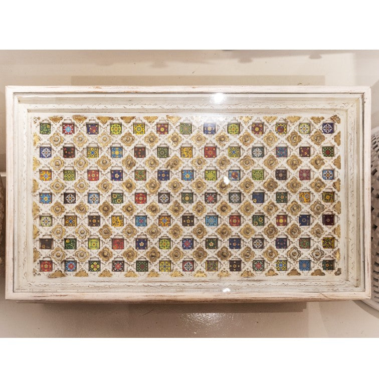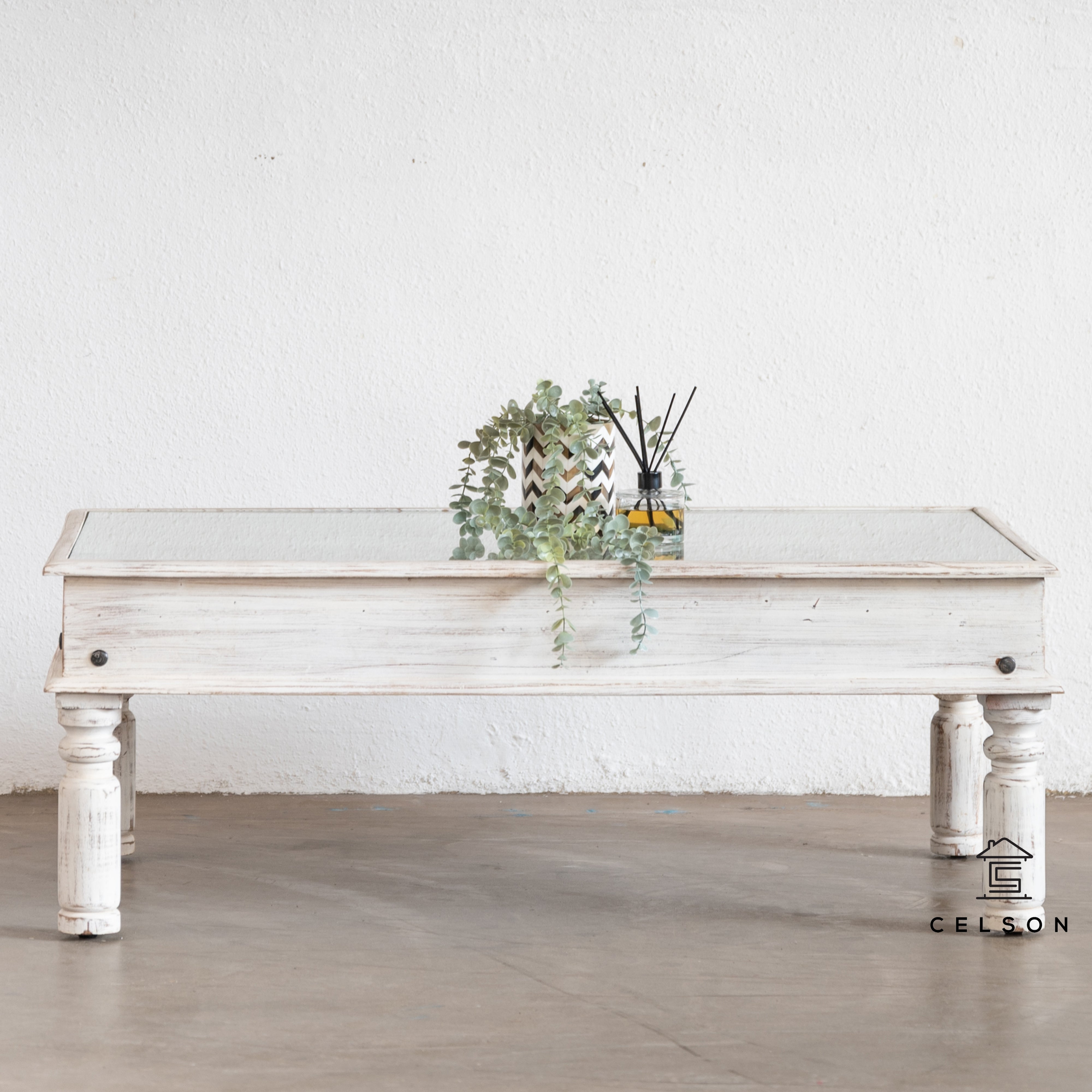 What makes it so striking is that the top is completely hand carved and it’s finished in a white washed style. It comes with a glass top for ease of use.