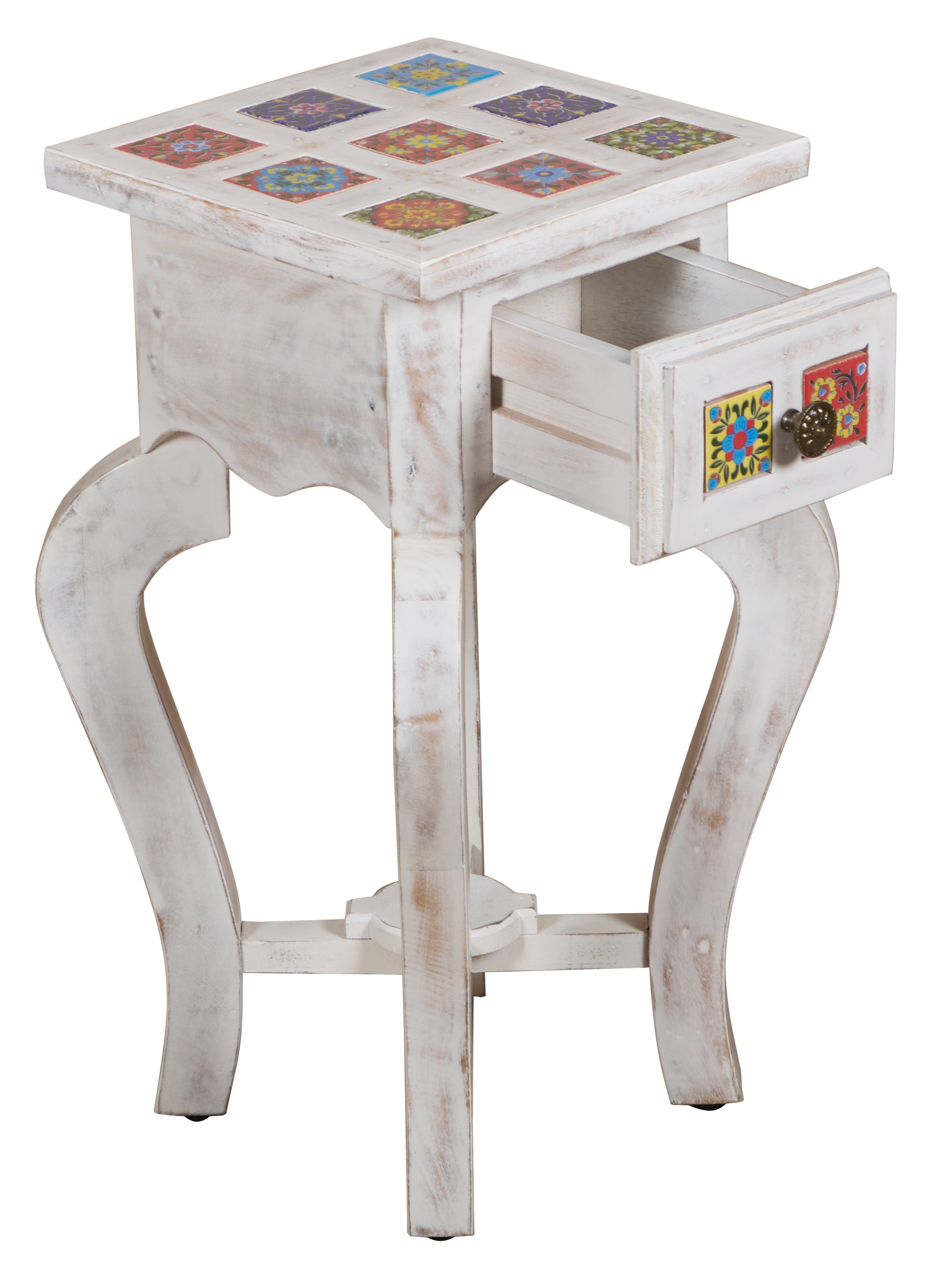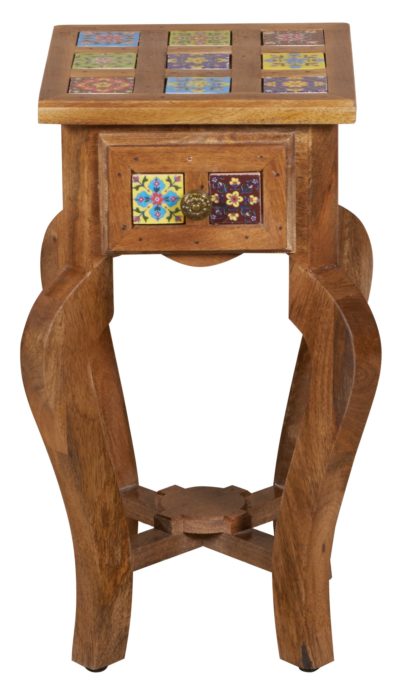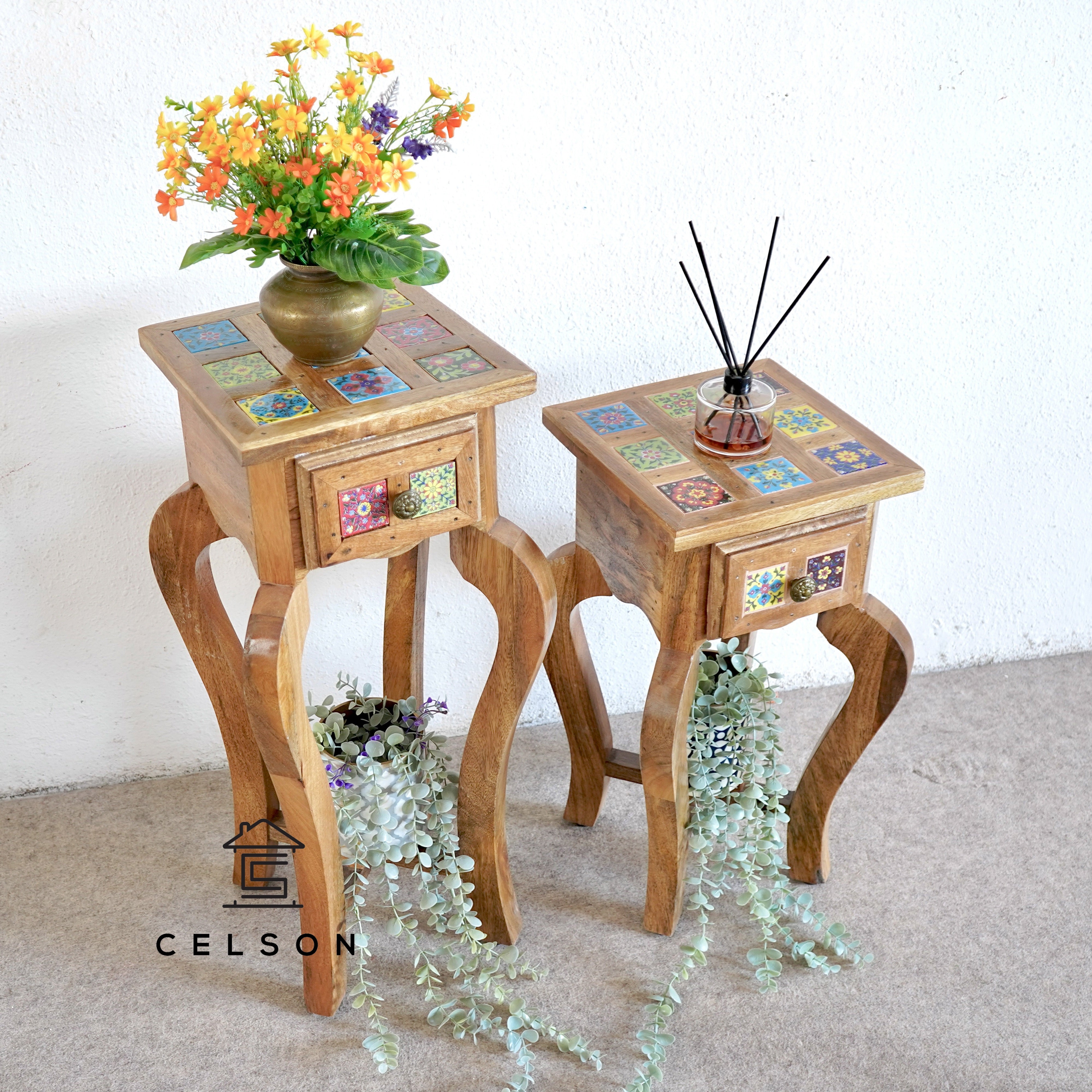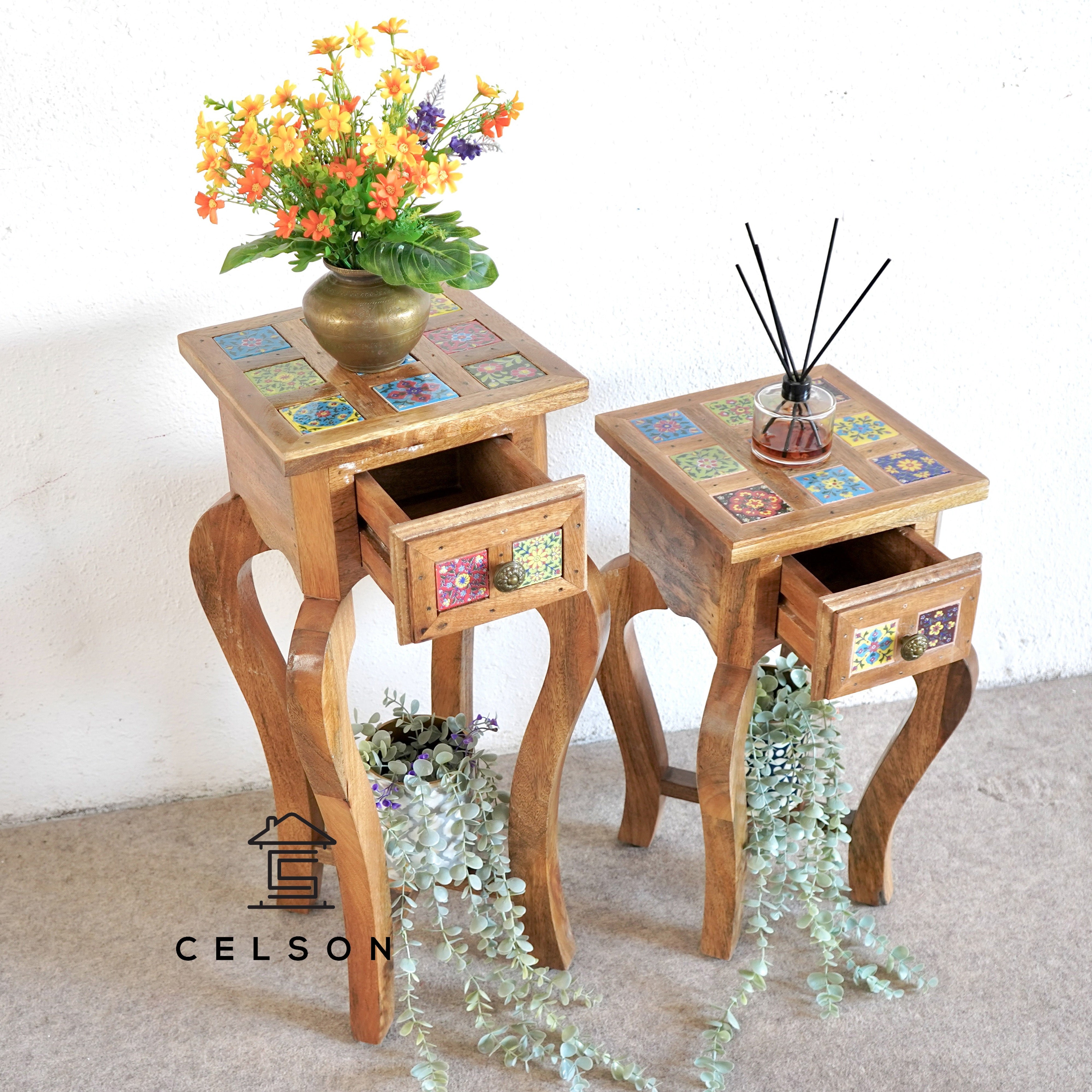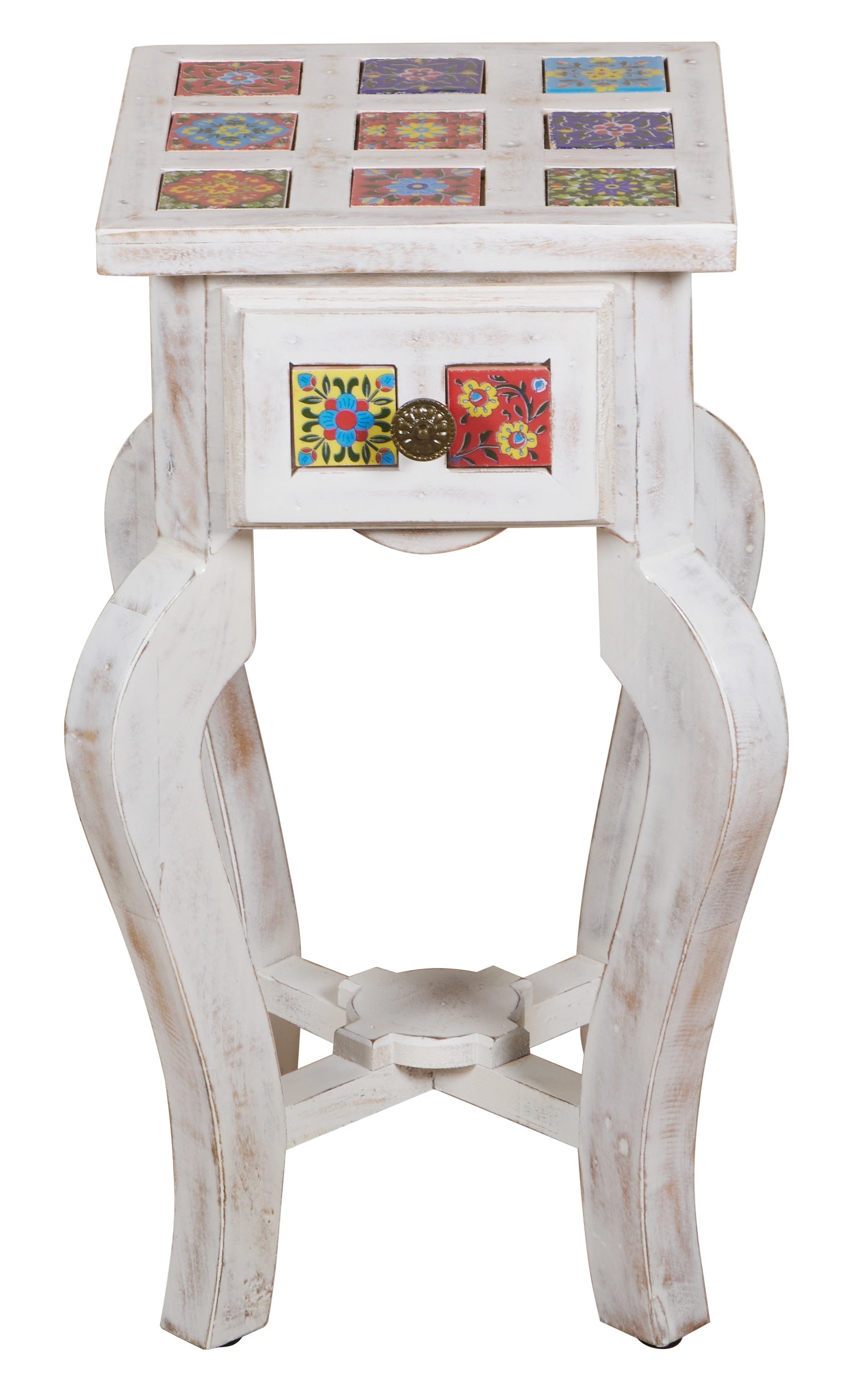 The combination of solid wooden body with multi color ceramic tiles top, these gorgeous curvy legs side tables are perfect for any home/decor.