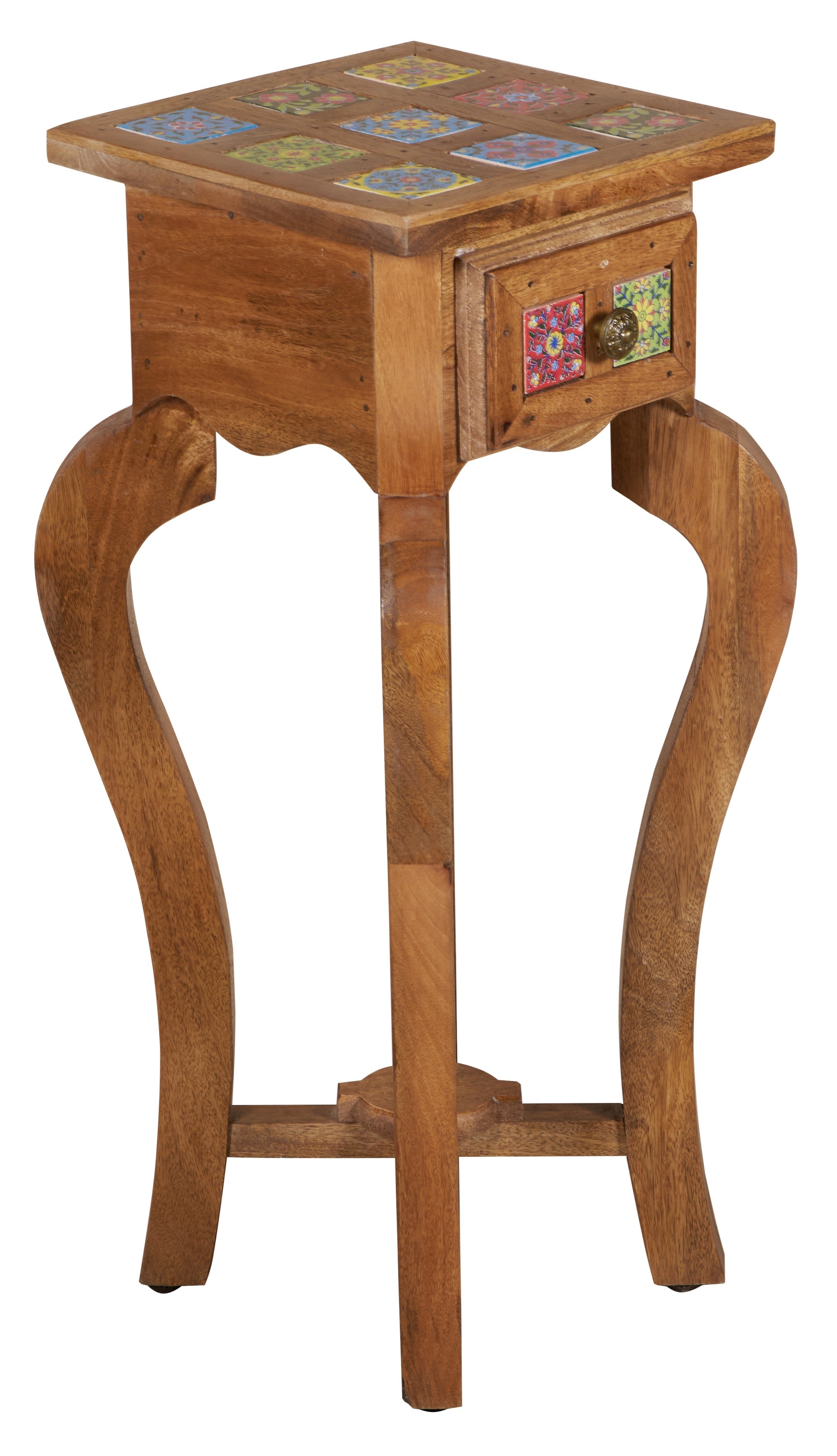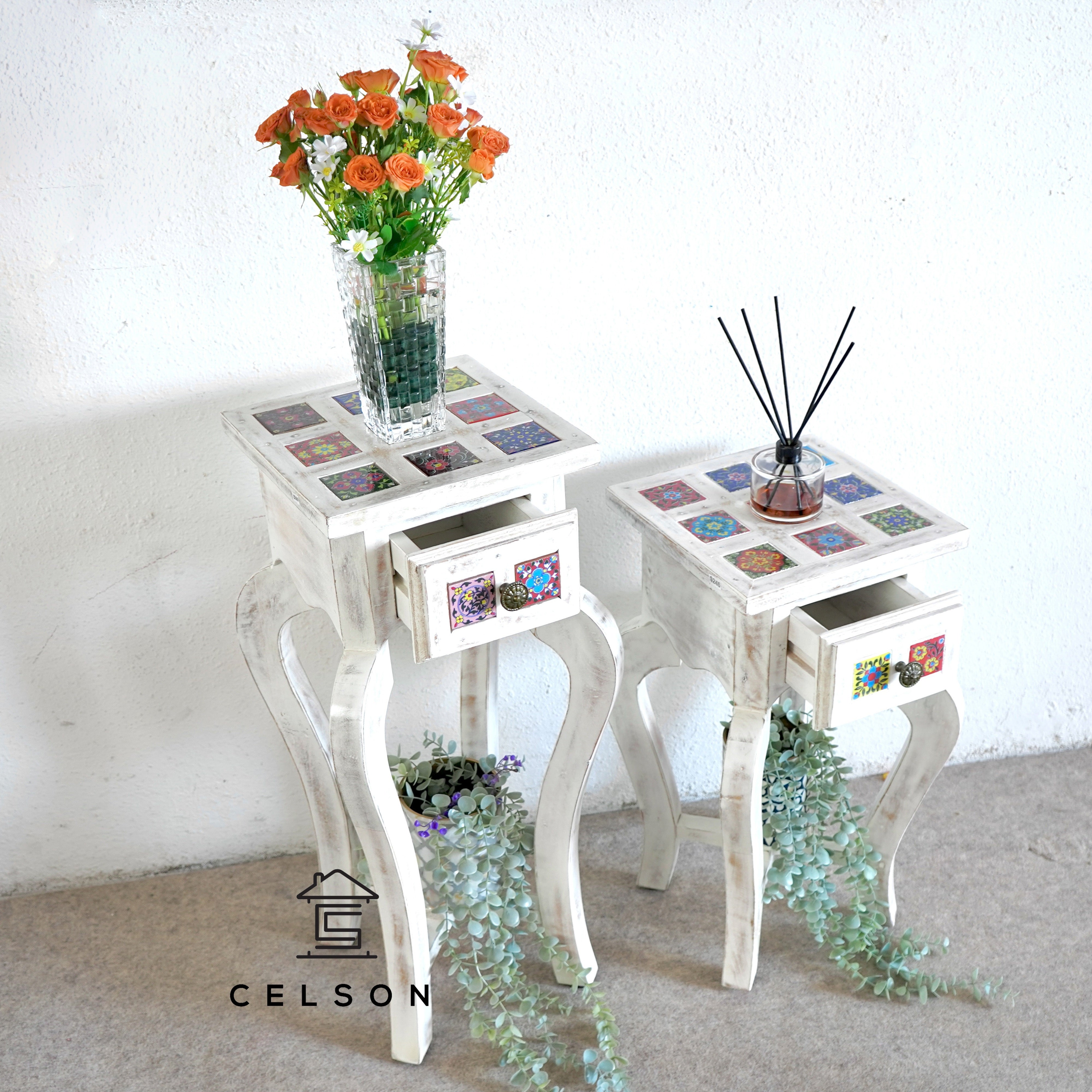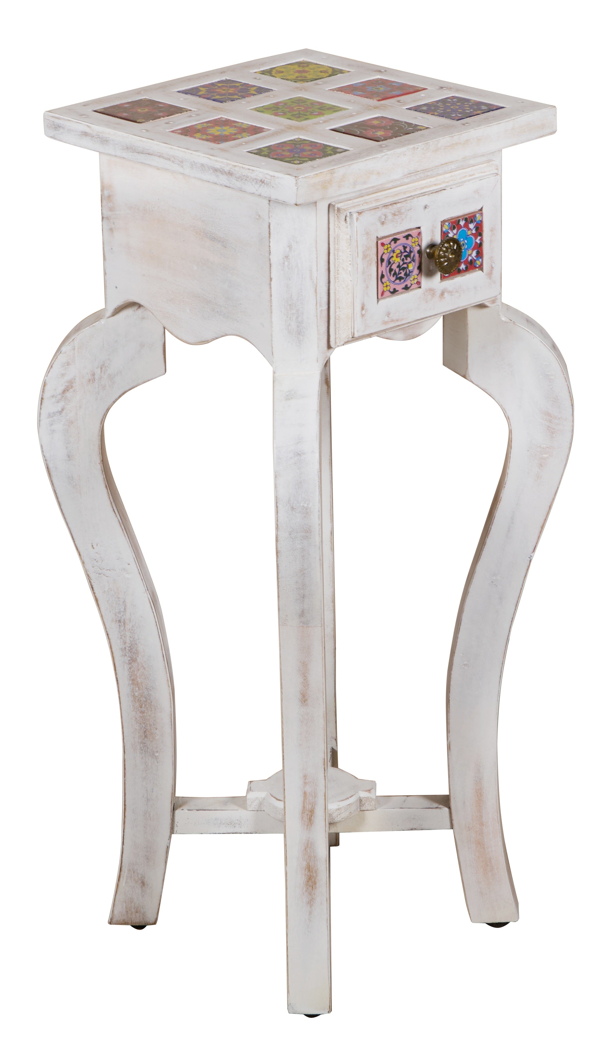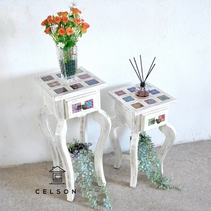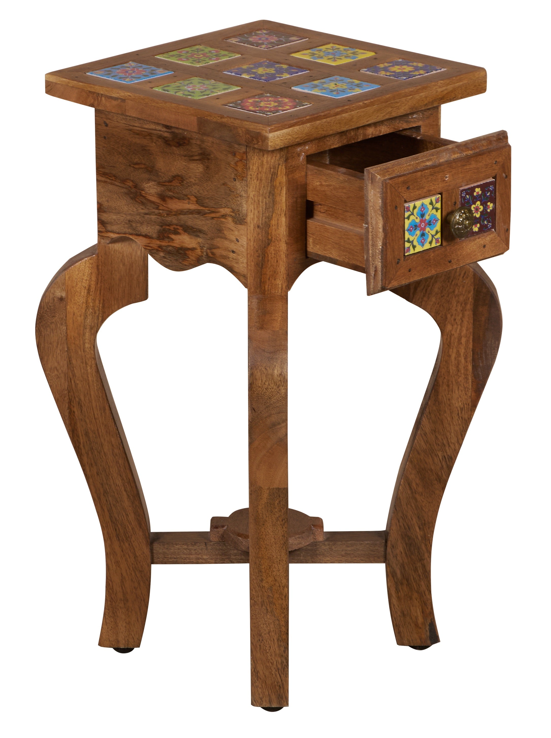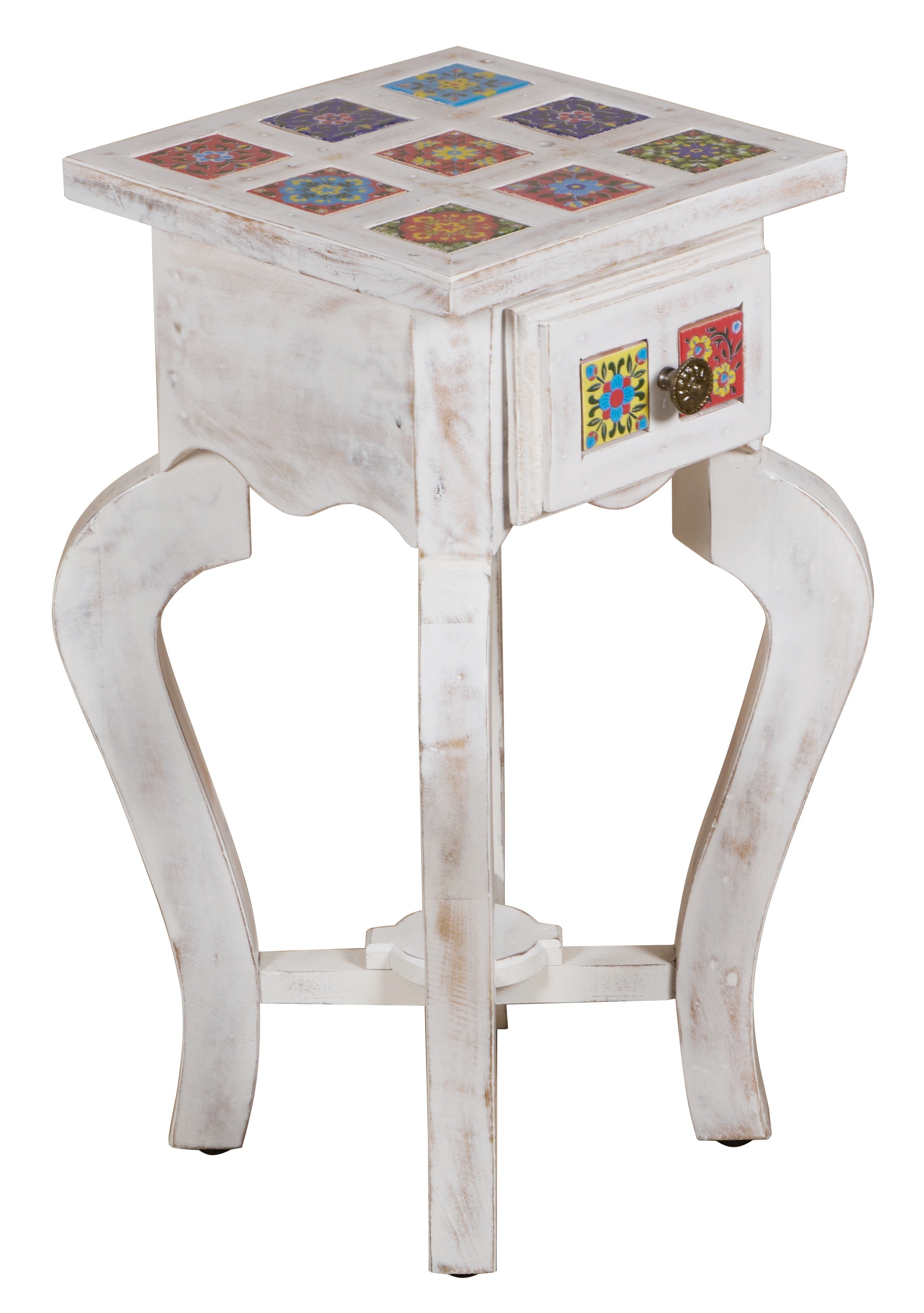 The combination of solid wooden body with multi color ceramic tiles top, these gorgeous curvy legs side tables are perfect for any home/decor.