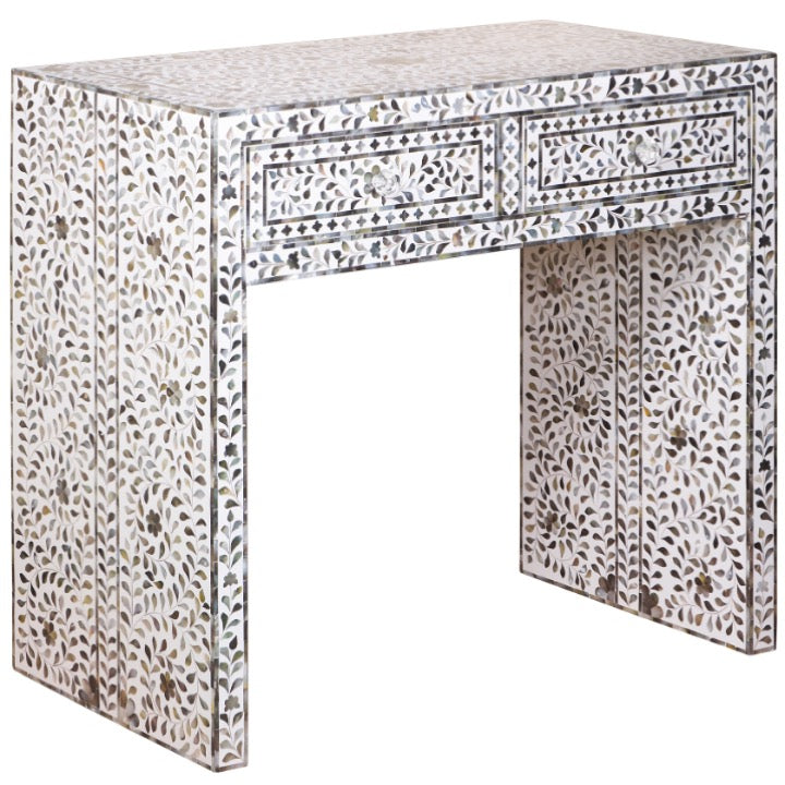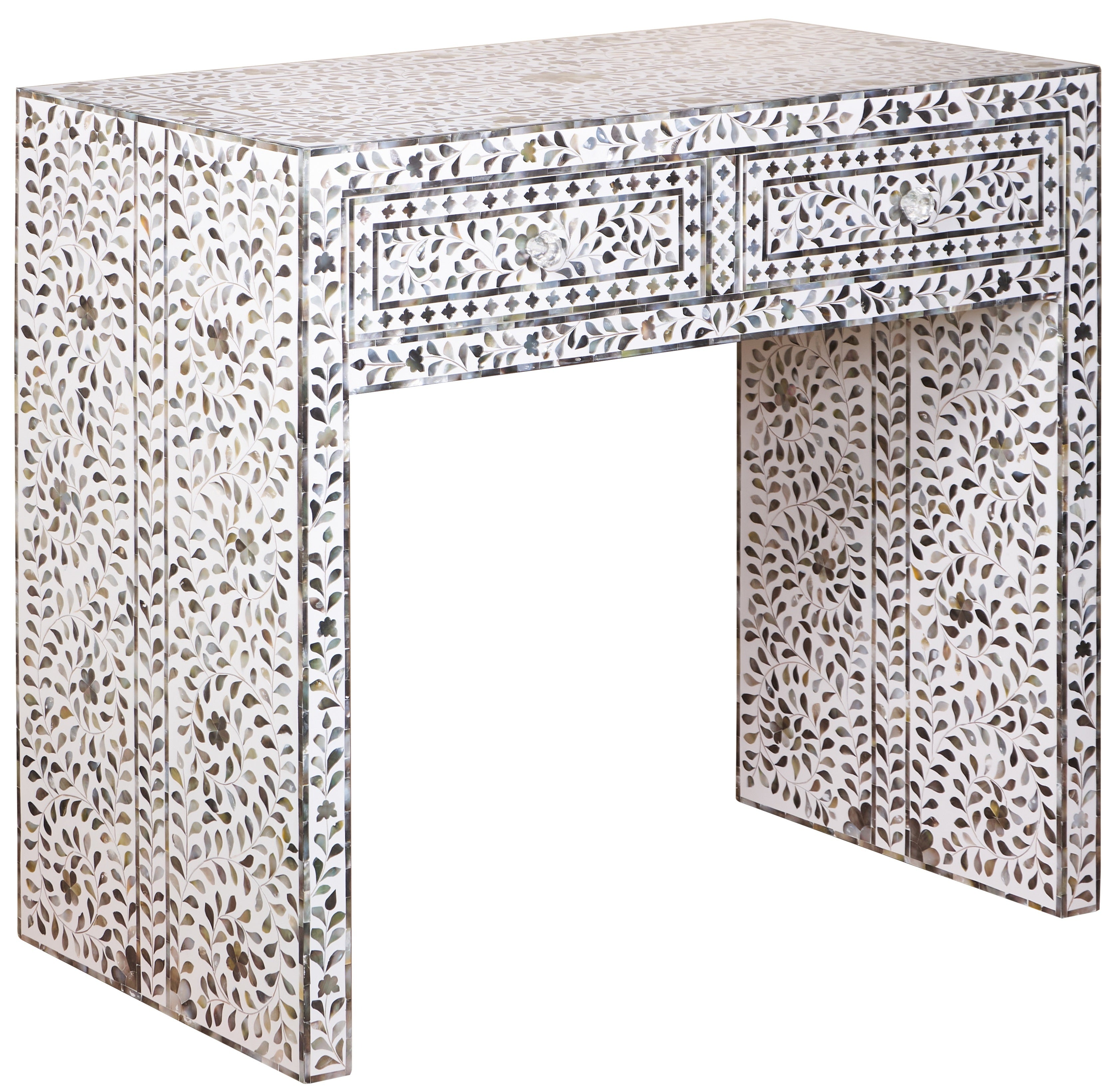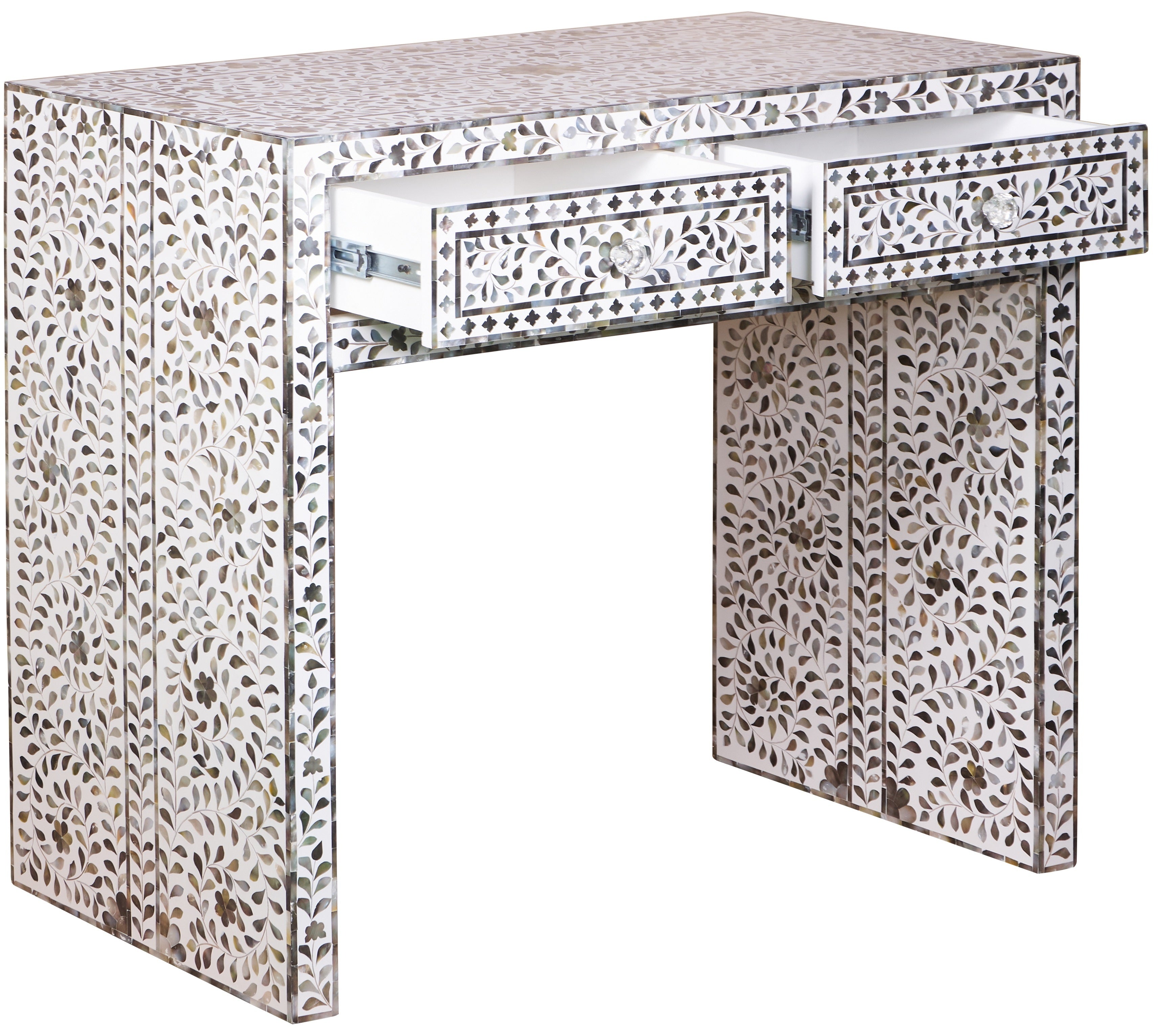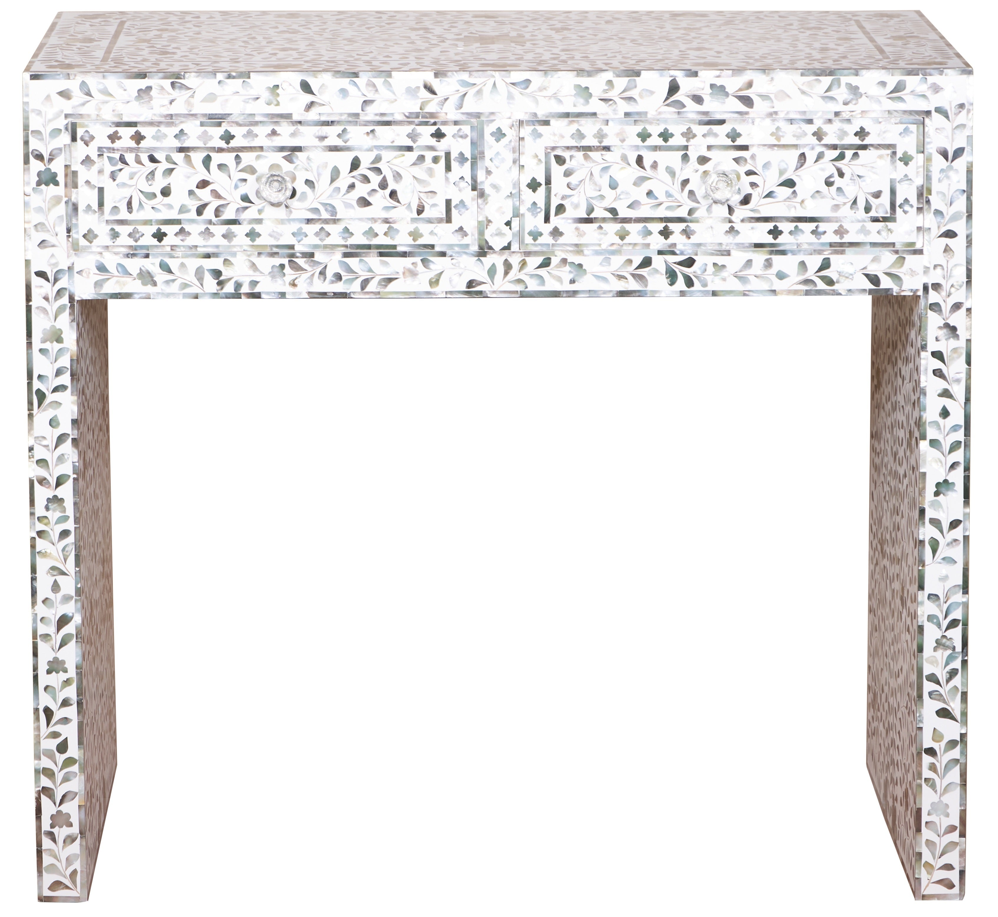 Classy and charming, this white bone inlay console with a floral pattern is the ideal platform for you to place some family photographs & scented candles on.