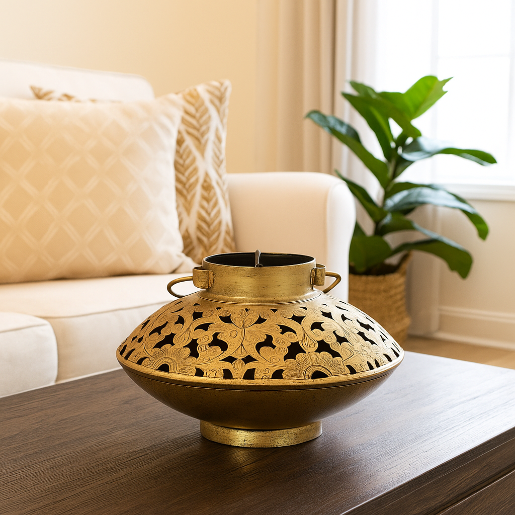 Bring a rustic, vintage vibe to your living room or patio with our round lantern. The intricate flower cut design and antique brass finish create a stunning, timeless ambiance.