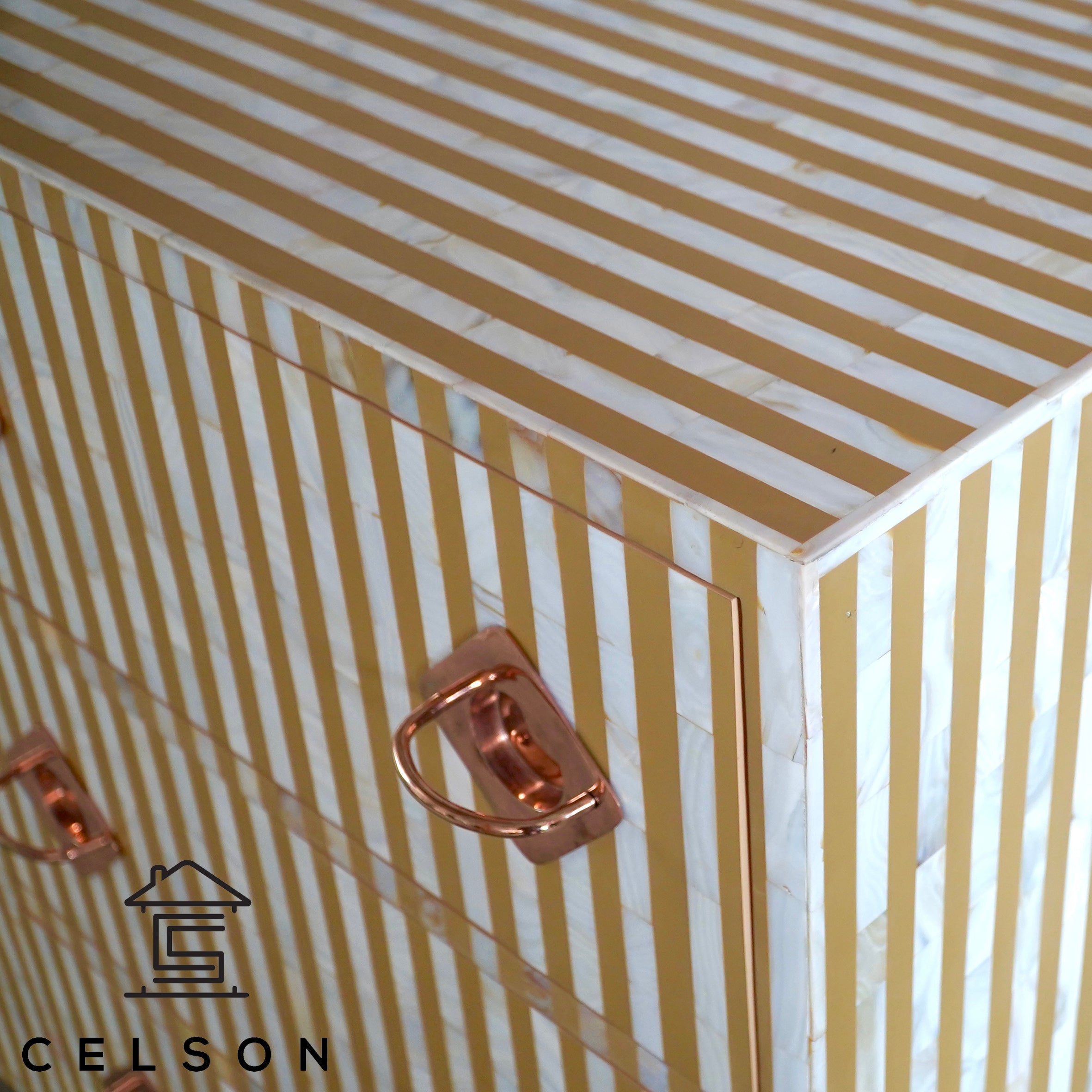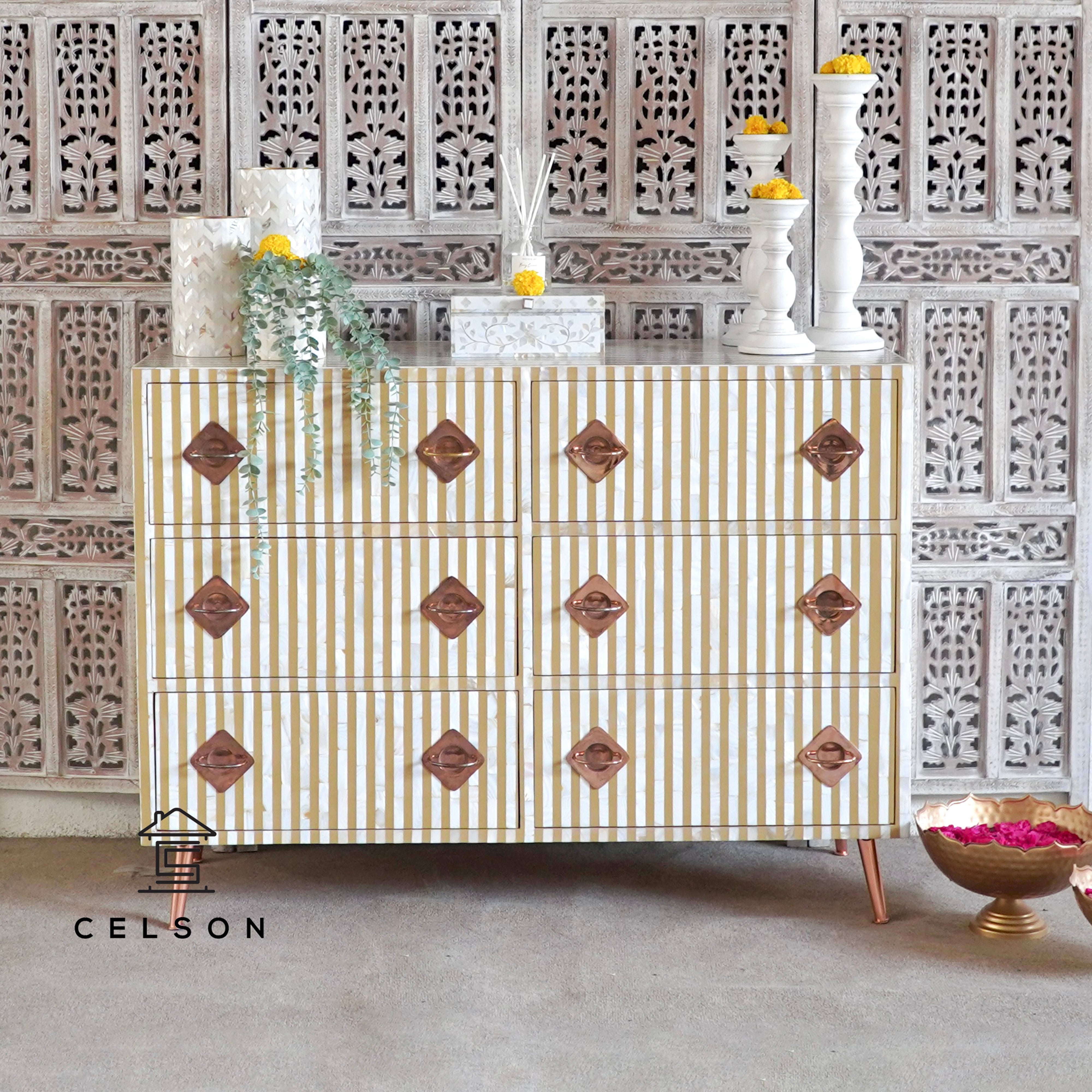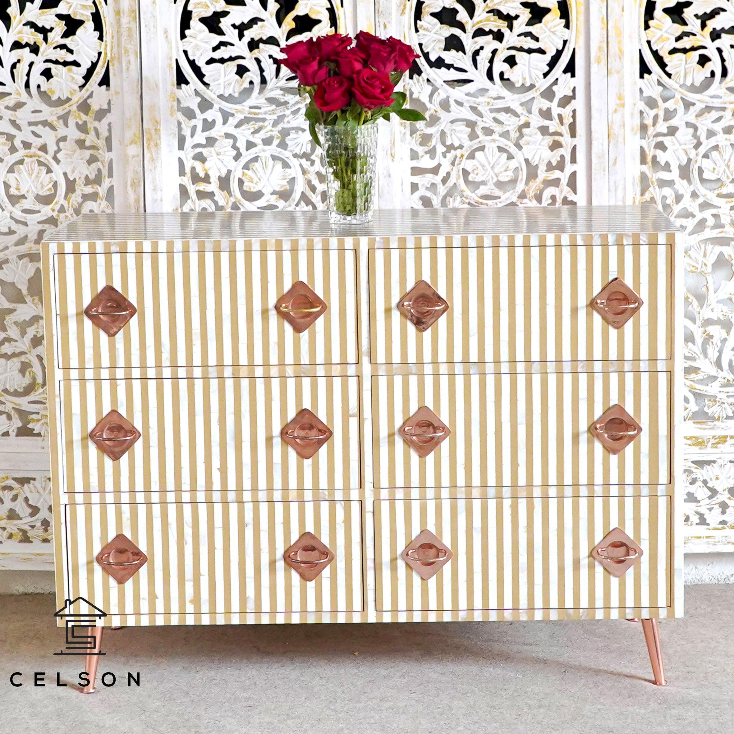 This pastel-colored dresser, featuring a beautiful mother-of-pearl inlay, adds a graceful touch to your decor. Its soft tones and exquisite detailing create a refined, yet serene, atmosphere in any room.