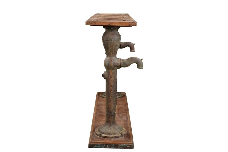 The iron legs in this console are very unique given their old water pump like structure. The plain top ensures that the table looks balanced & the focus remains on the legs.