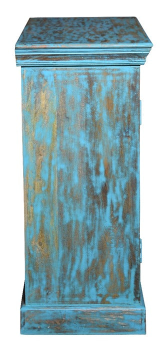 This distressed blue finish cabinet is an absolute eye catcher with its hand carved design and complimenting matching metal pulls.