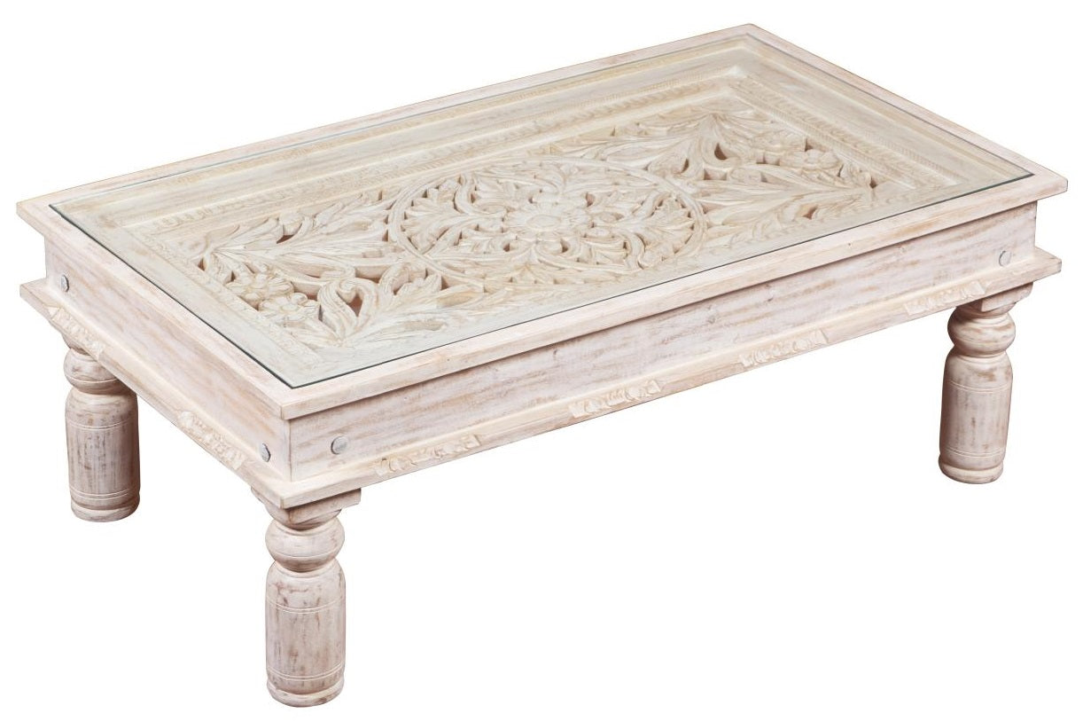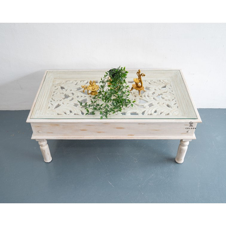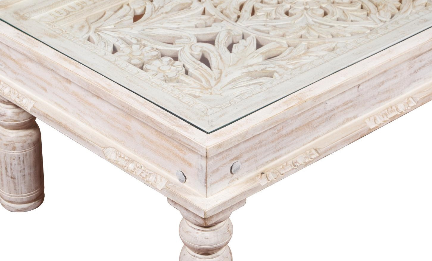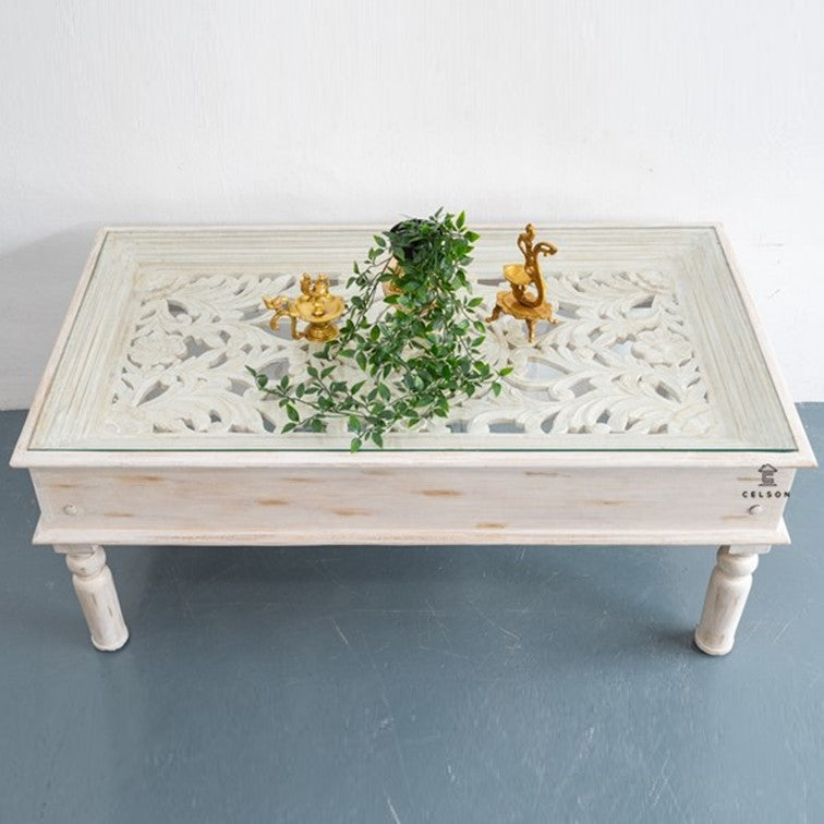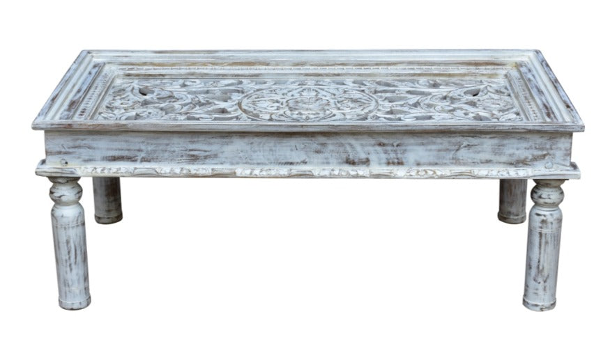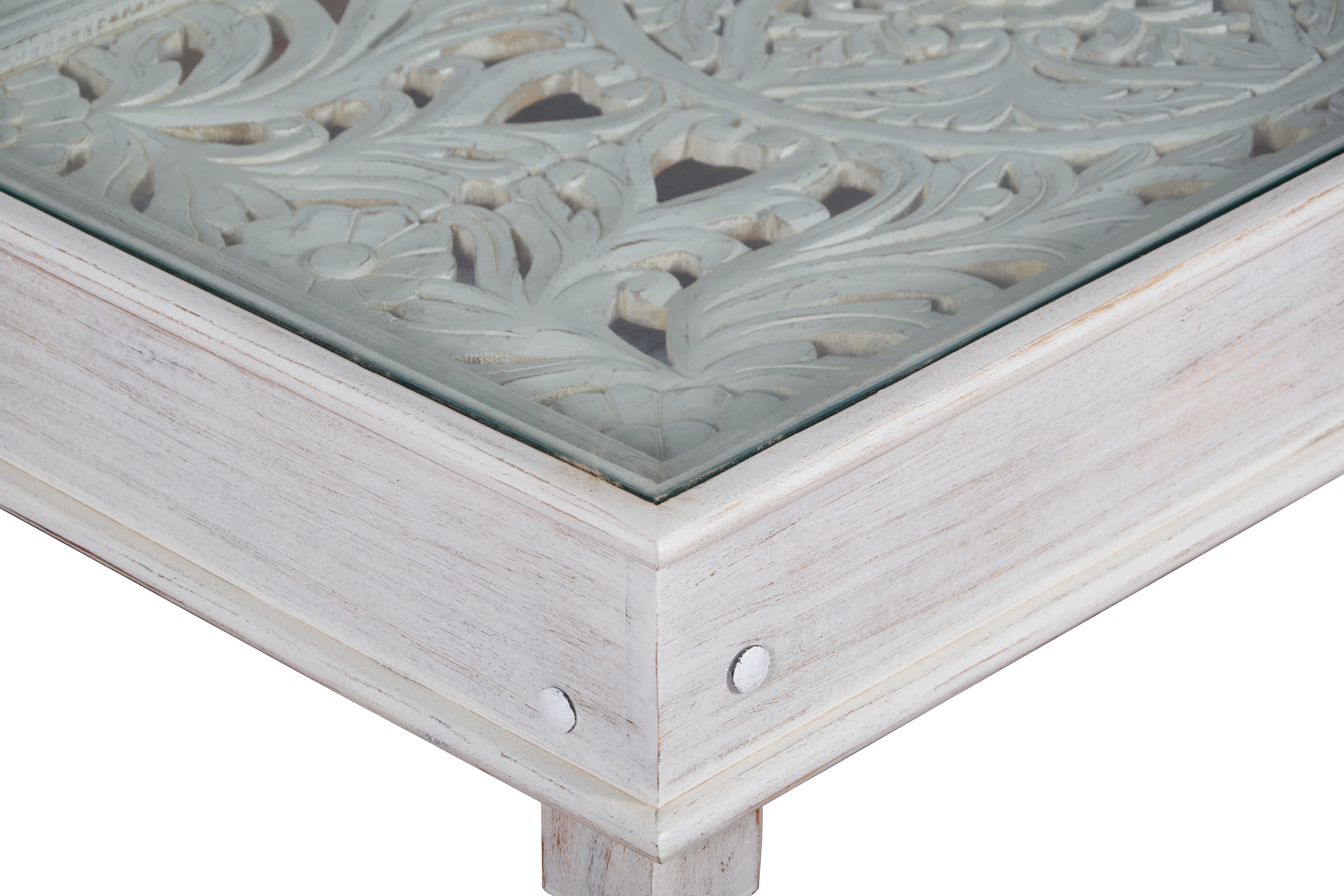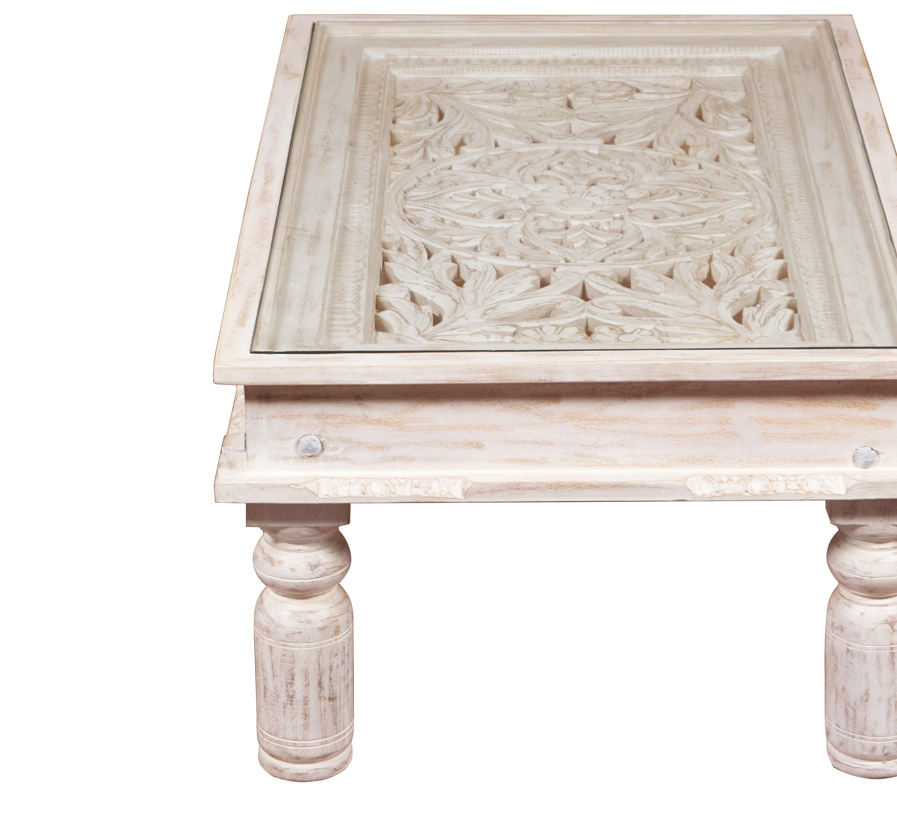 What makes it so striking is that the top is completely hand carved and it’s finished in a white distressed style. It comes with a glass top for ease of use.