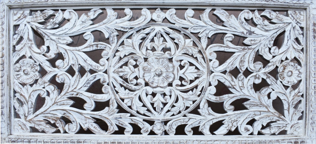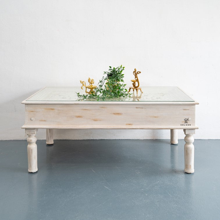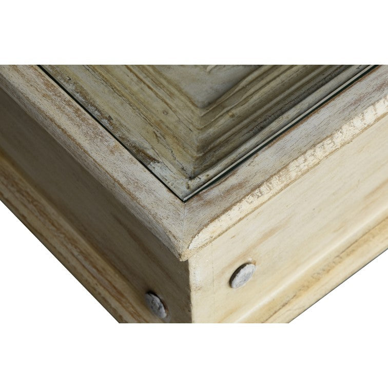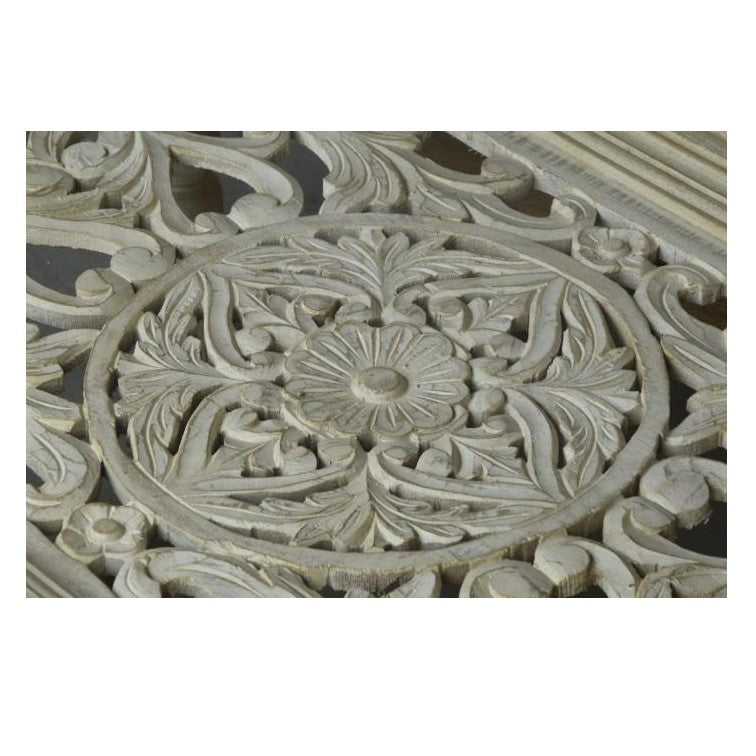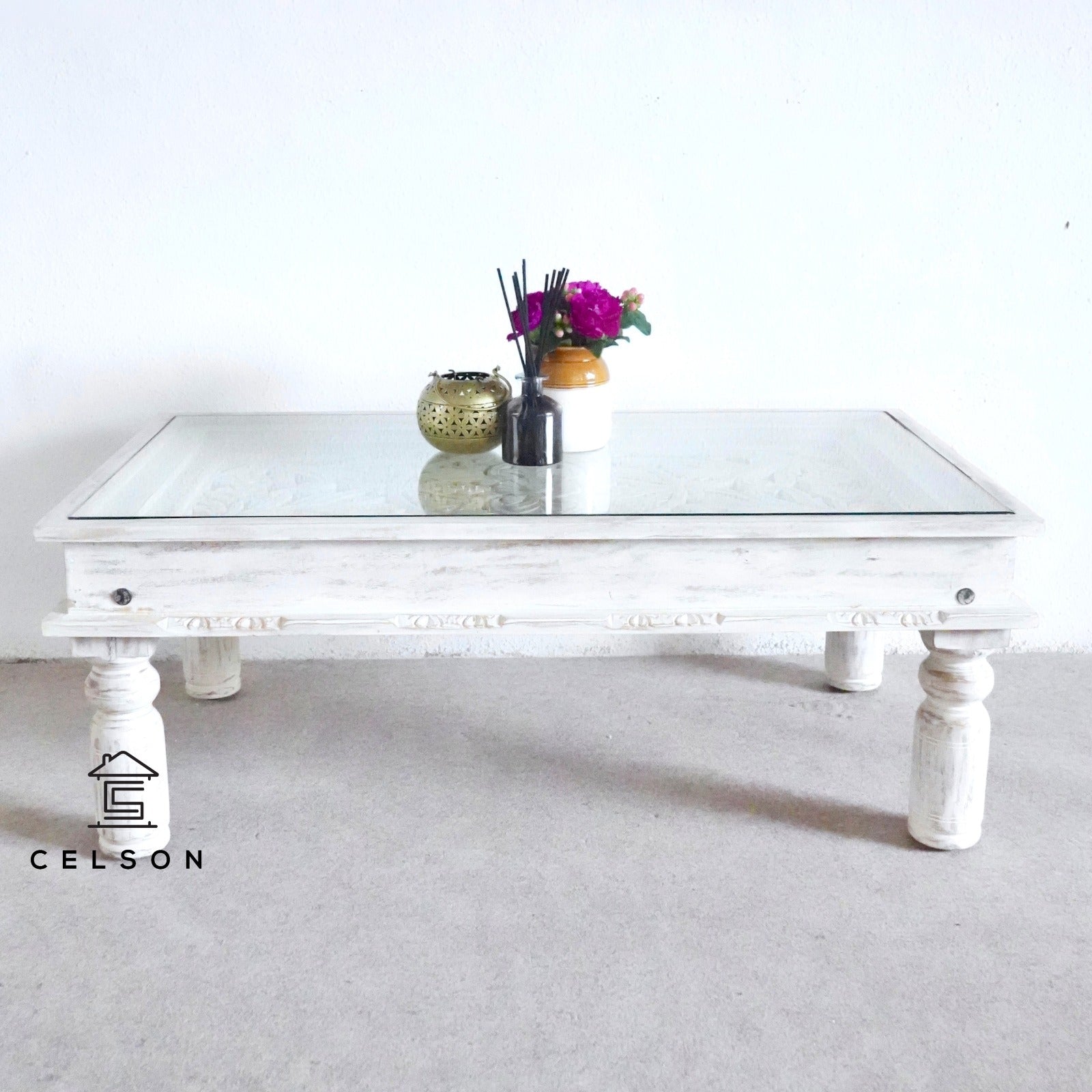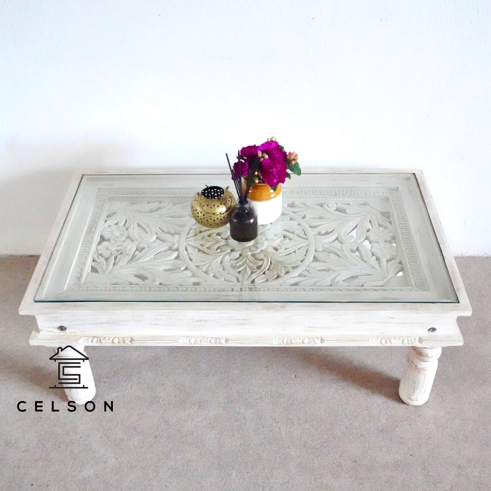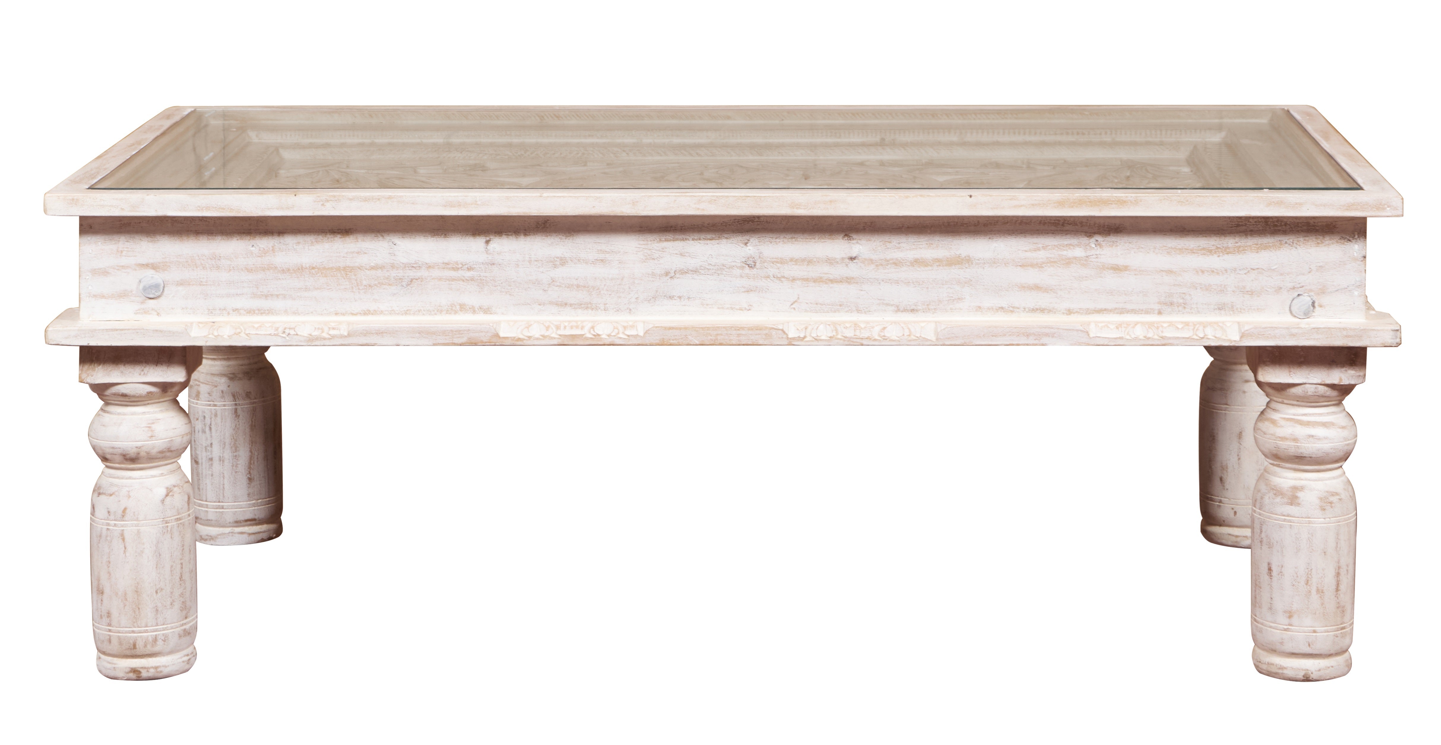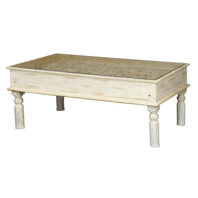 What makes it so striking is that the top is completely hand carved and it’s finished in a white distressed style. It comes with a glass top for ease of use.