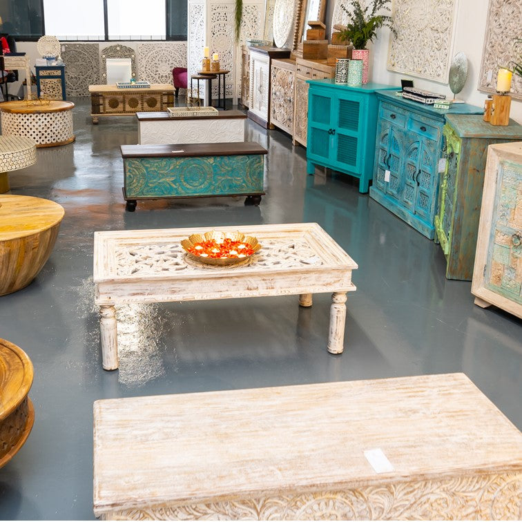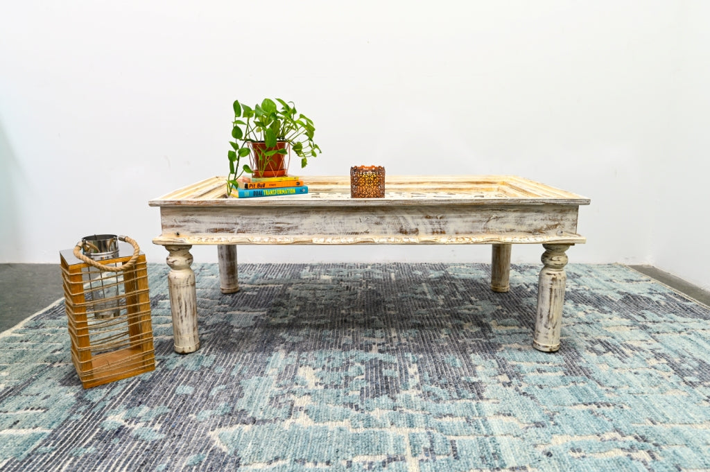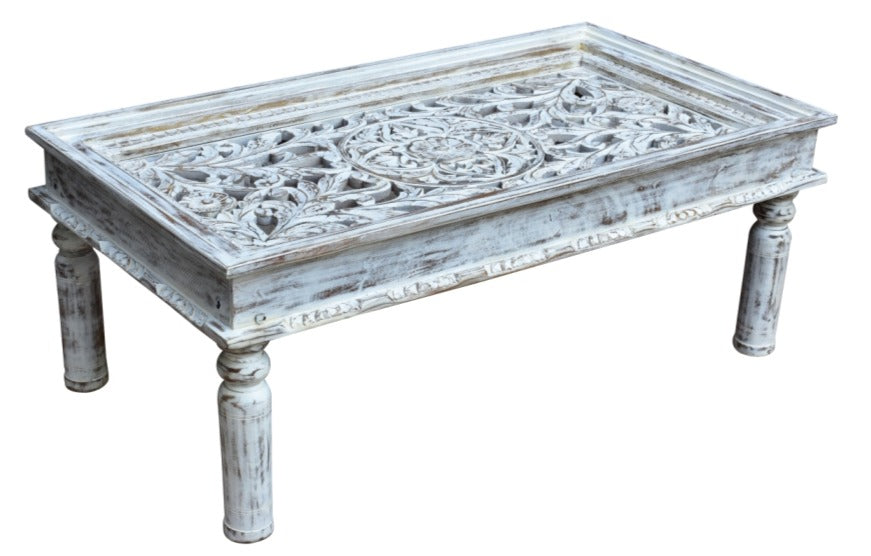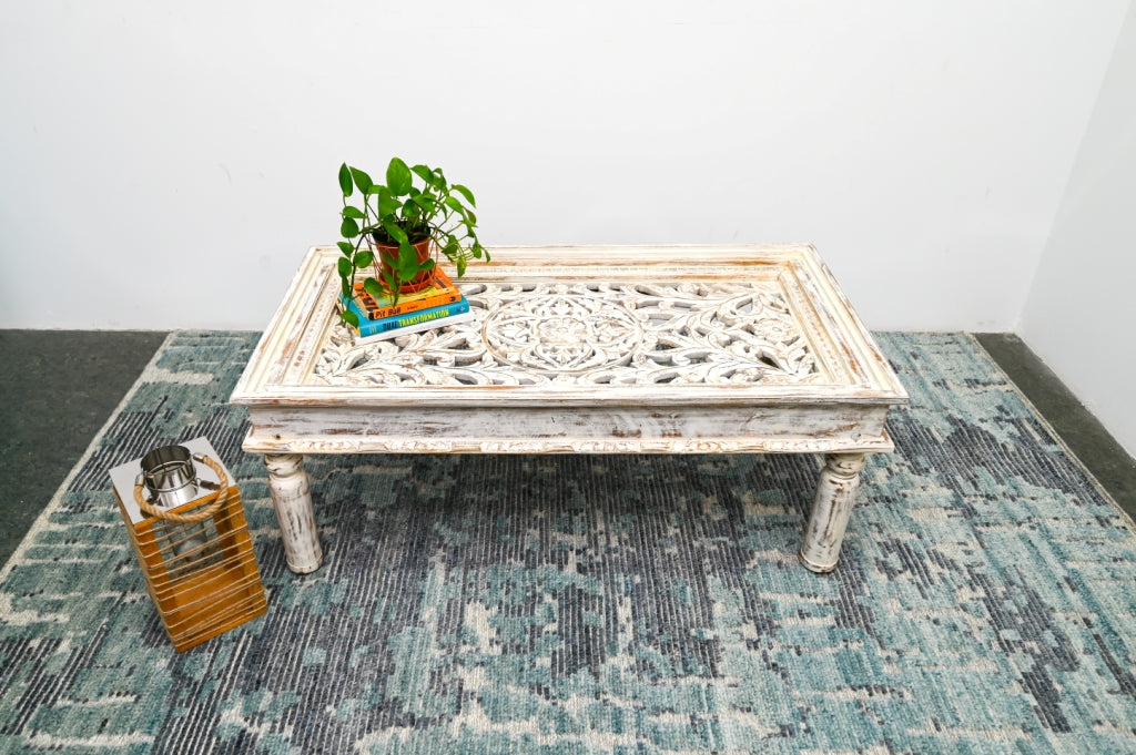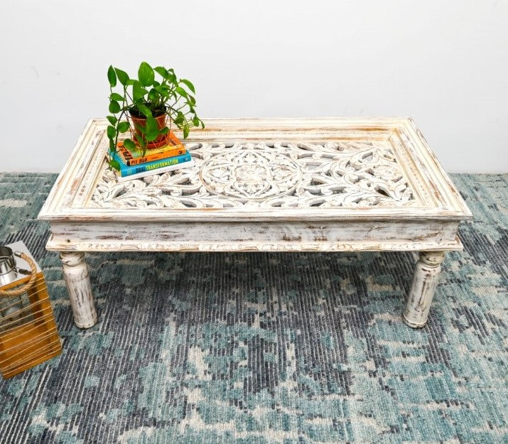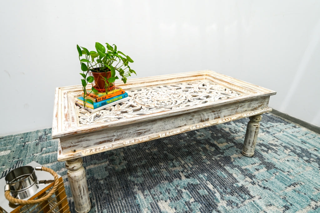 A cute but gorgeous wooden hand carved coffee table for a family room or bedroom set up!