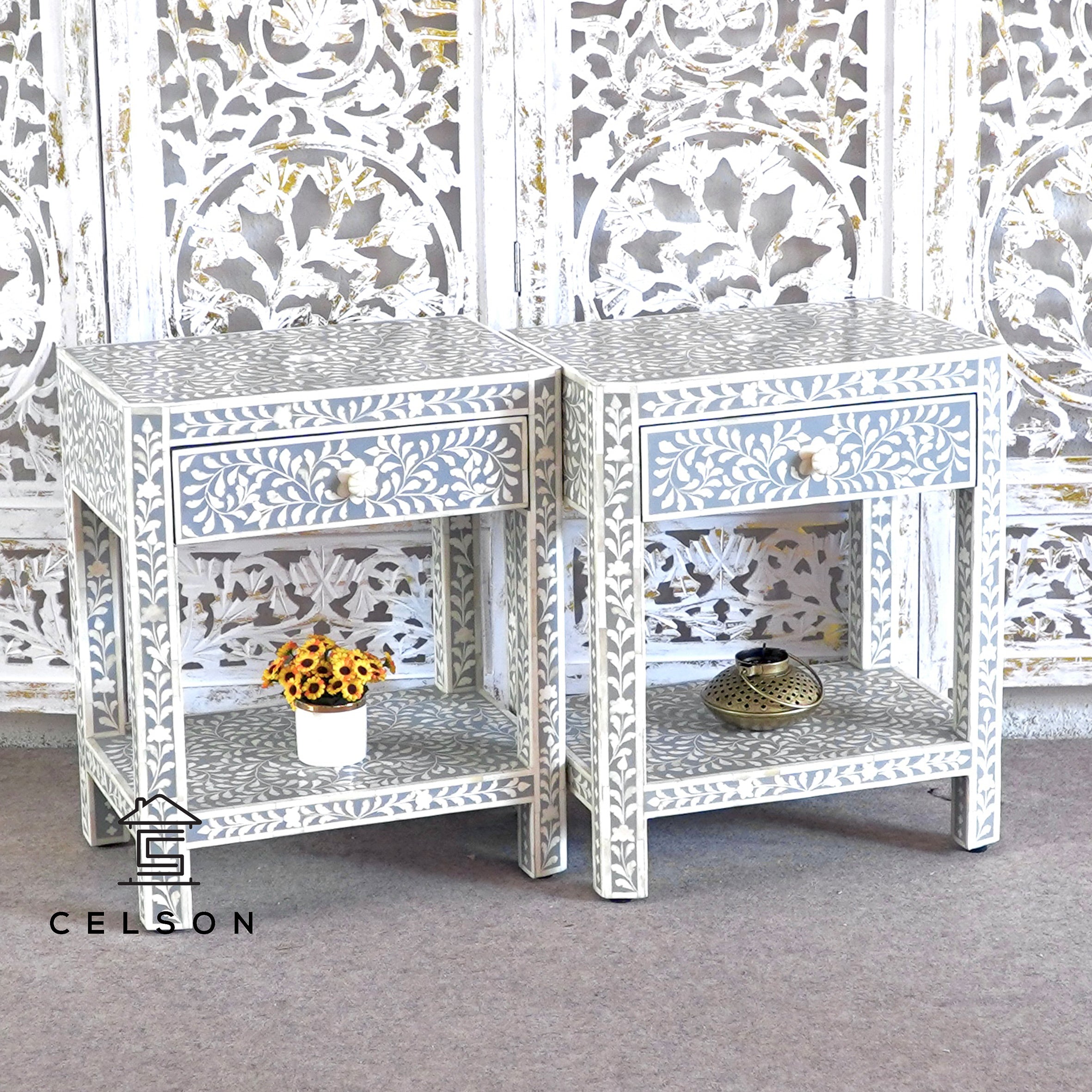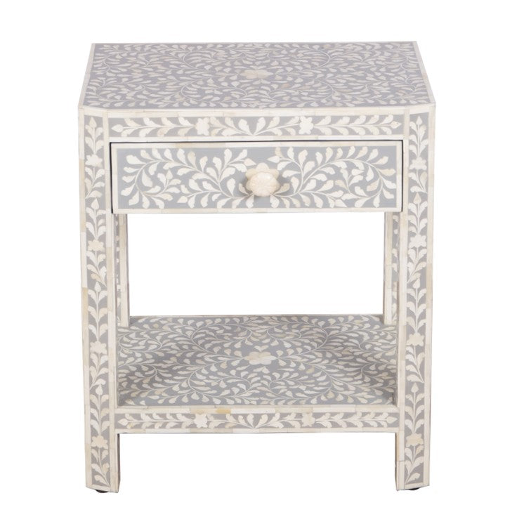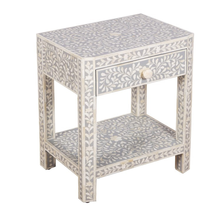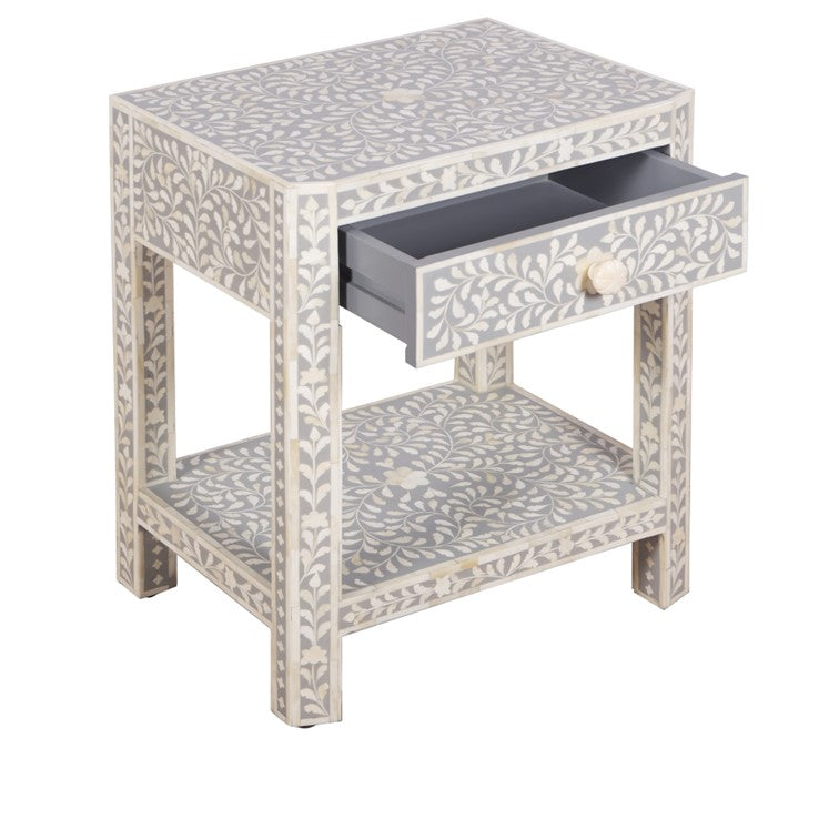 This bone inlay bedside table features a drawer for hidden storage and an open shelf for easy access to your nighttime essentials.