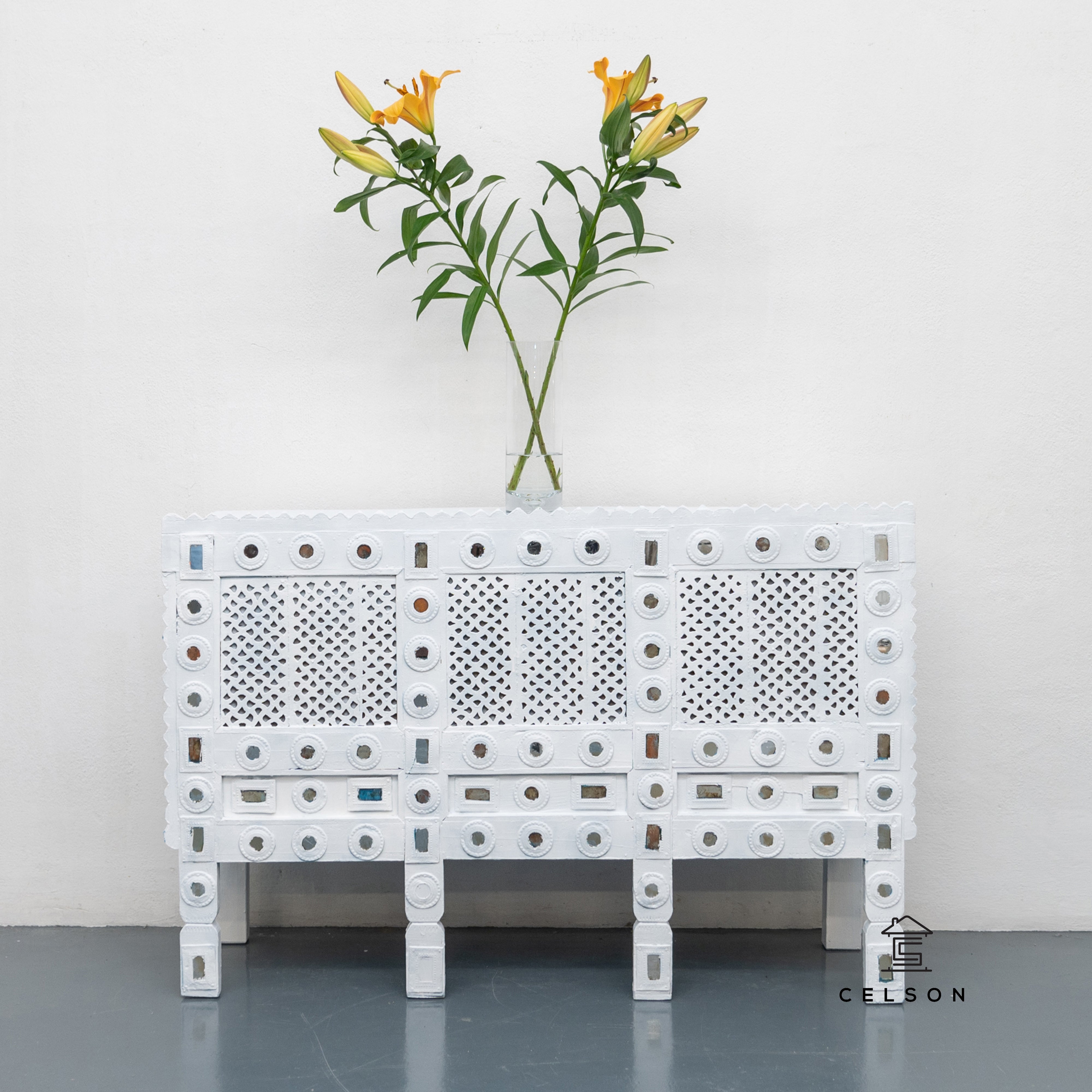 The striking blue colour with mirror work is breathtaking & is sure to grab eyeballs in any room of the house. This has a shelve at back to provide storage.