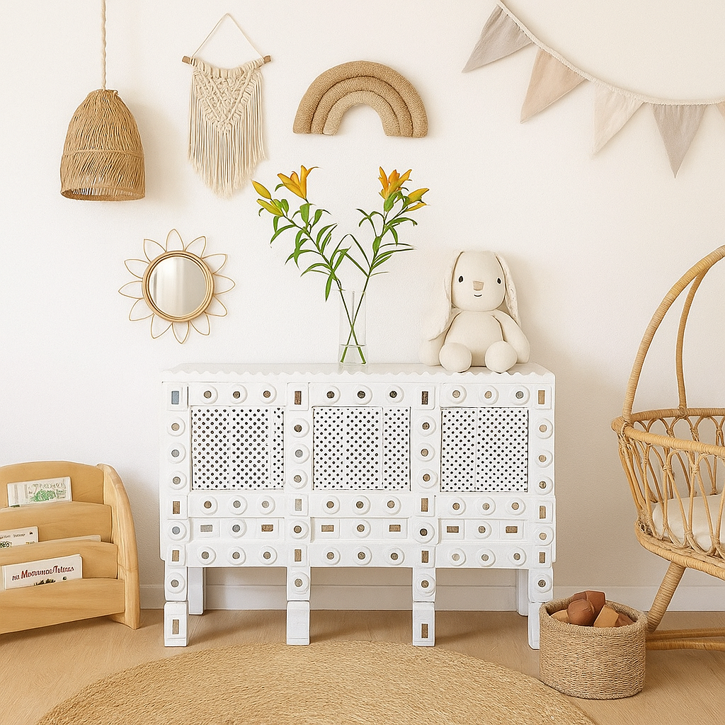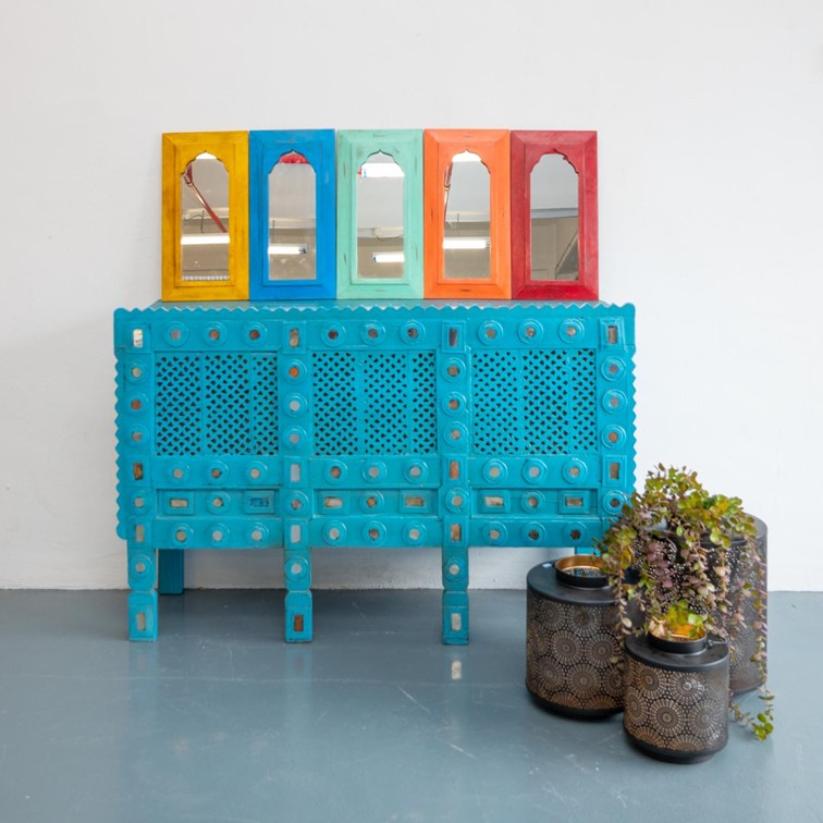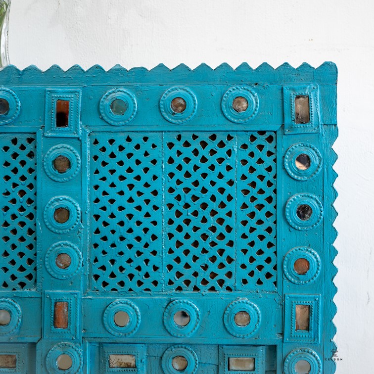 Our Laila vintage Damchiya has been up cycled from an old piece and we have retained the original wood & some other elements like vintage mirrors.