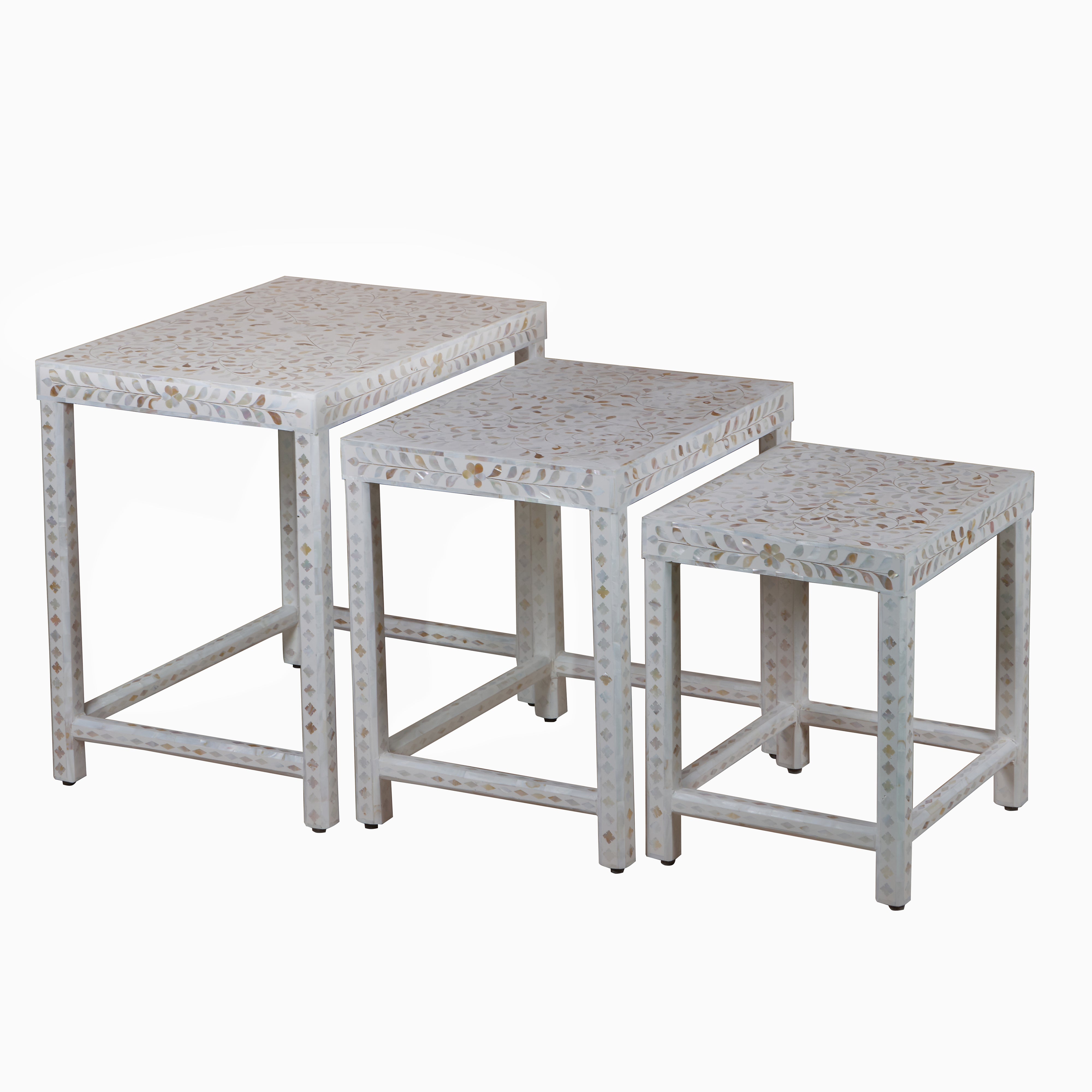 Experience the perfect blend of beauty and practicality with our MOP Inlay Nesting Table Set. The stunning handcrafted finish brings a touch of class to your decor, while the versatile design allows the smaller tables to slide out when guests arrive and hide away effortlessly when not in use.