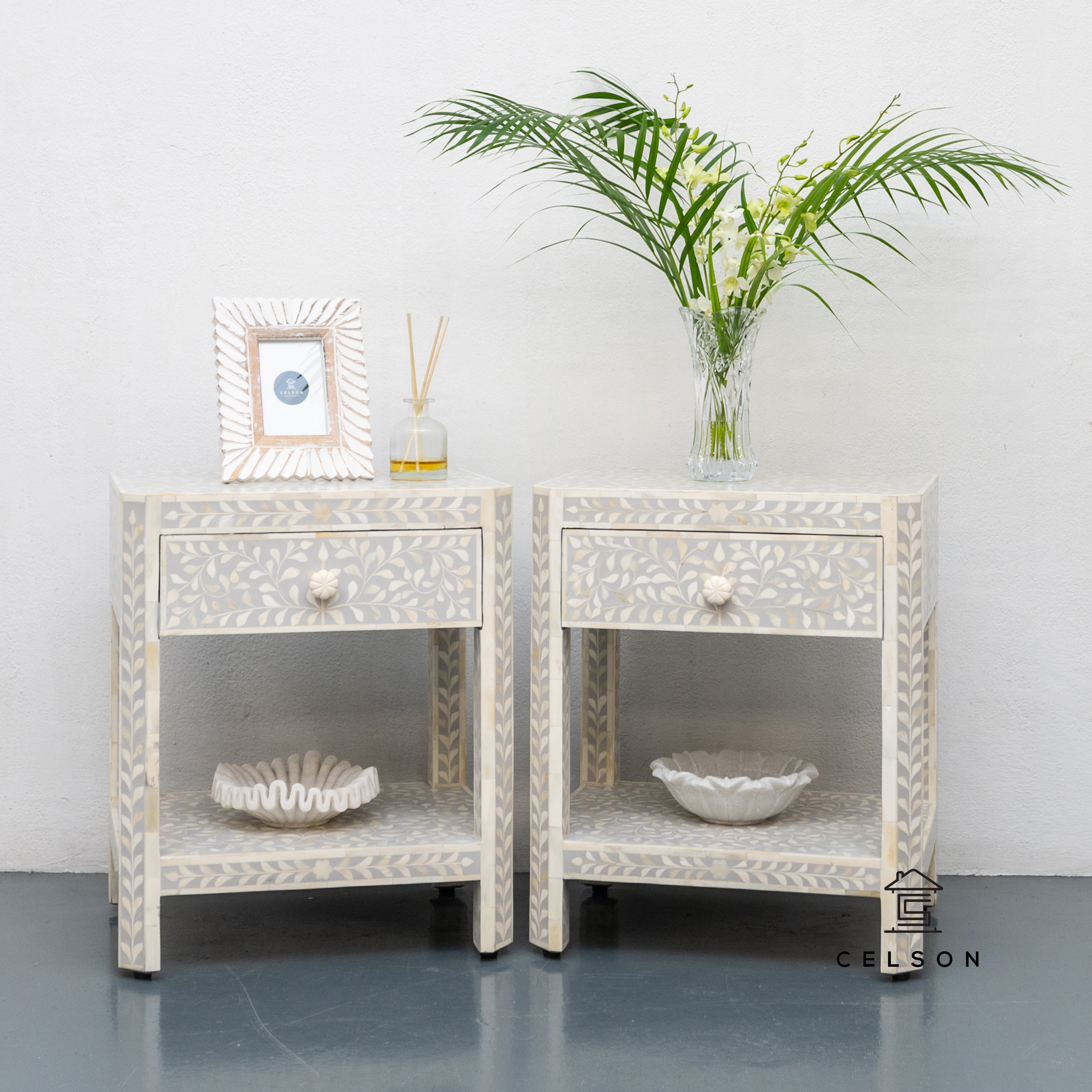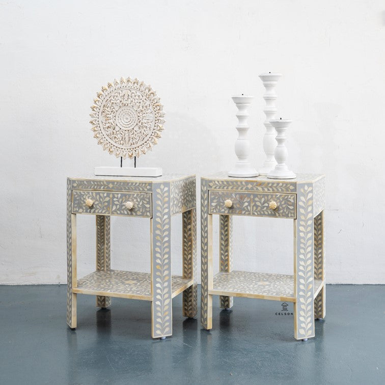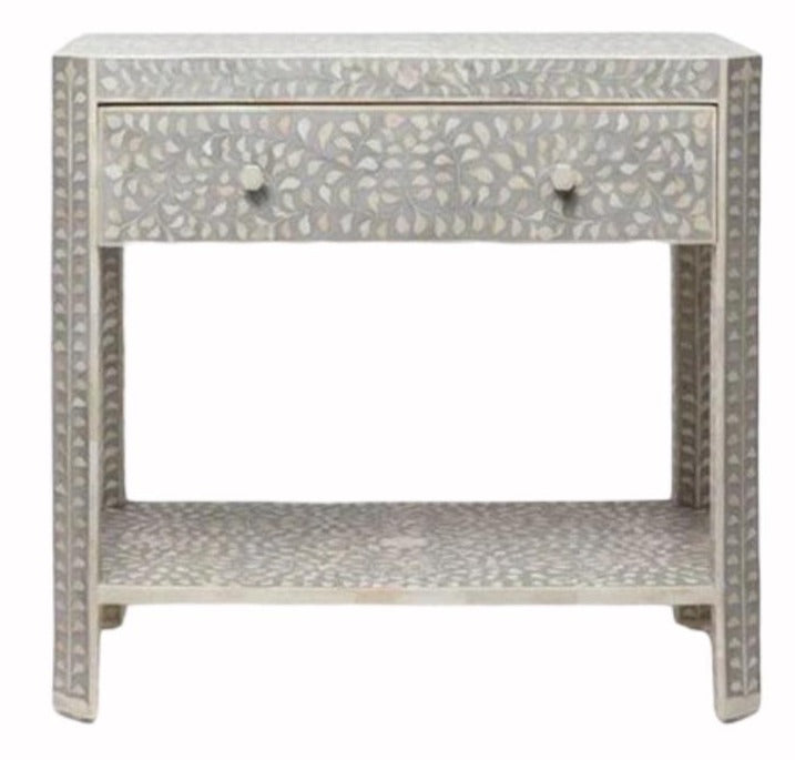 This gorgeous bone inlay bed side table comes with a drawer and a open shelve at bottom which provides the perfect amount of space for all your needs.