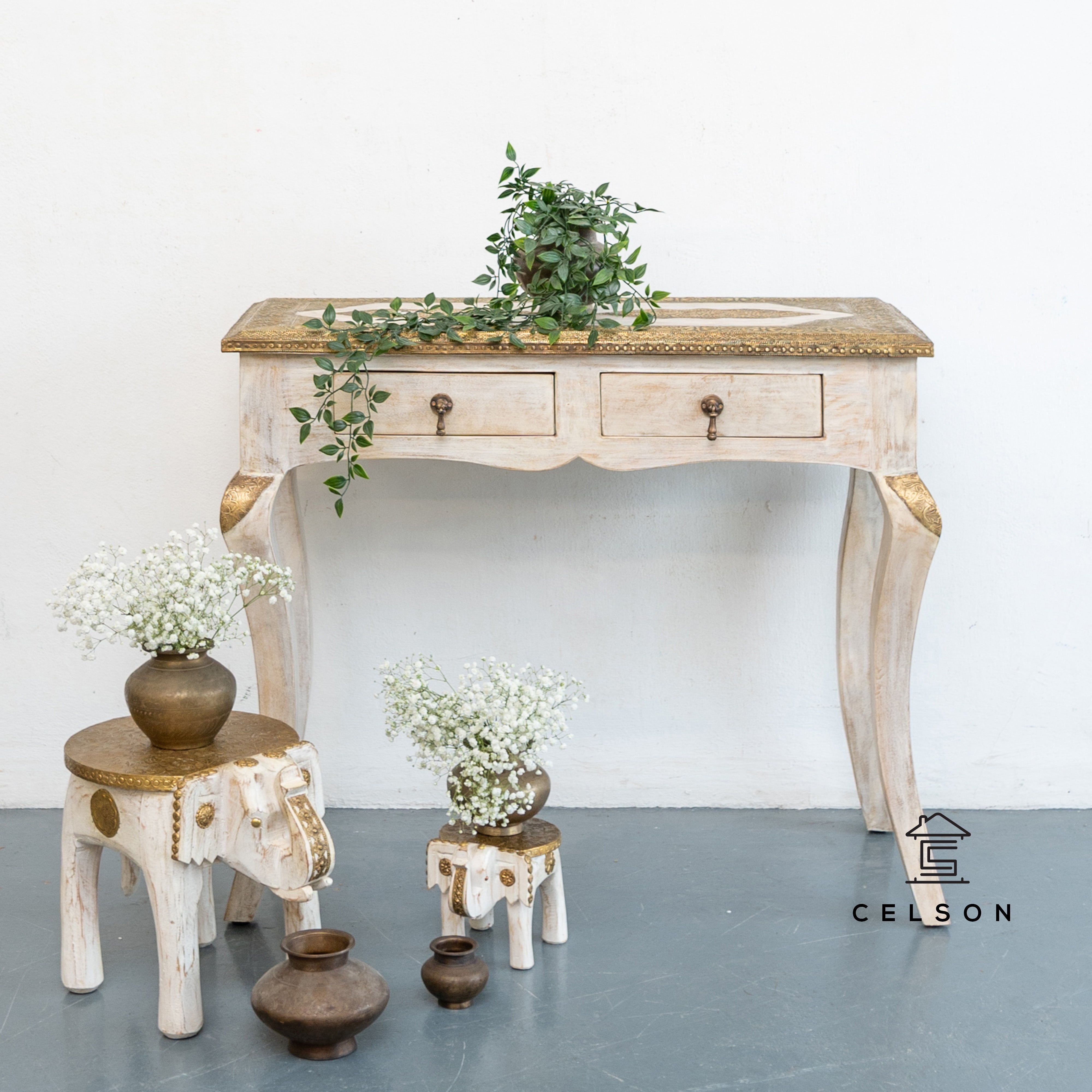 What makes this 2 drawer console table gorgeous is the white washed finish with inlaid brass & complimenting hardware.