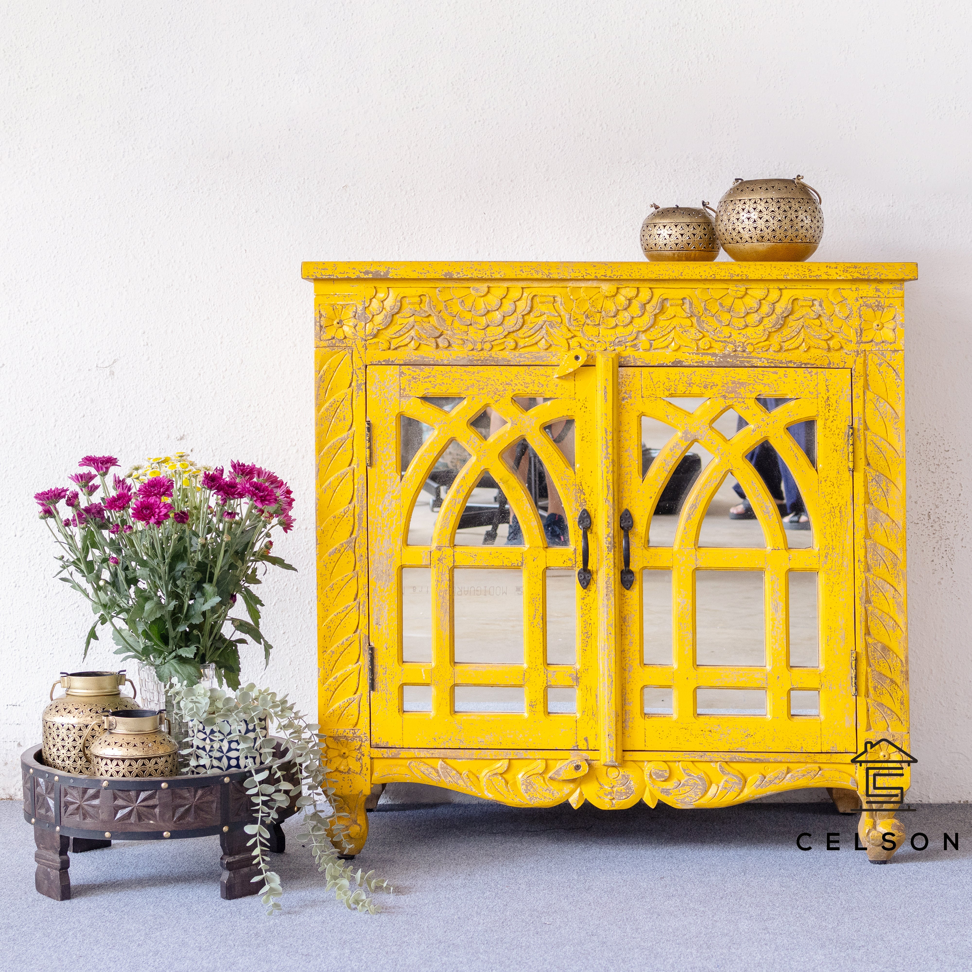 Set in a mirror with carved door & a lovely lemon colour, this cabinet is a must have piece!