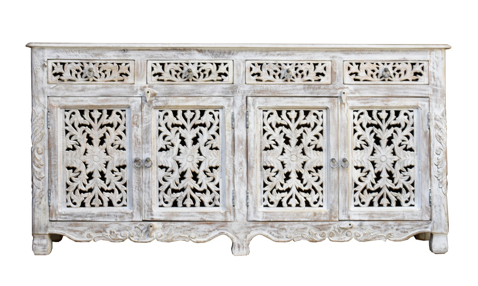 It comes with four hand carved doors and four drawers in a lovely distressed white finish perfect to get along with any existing decor.