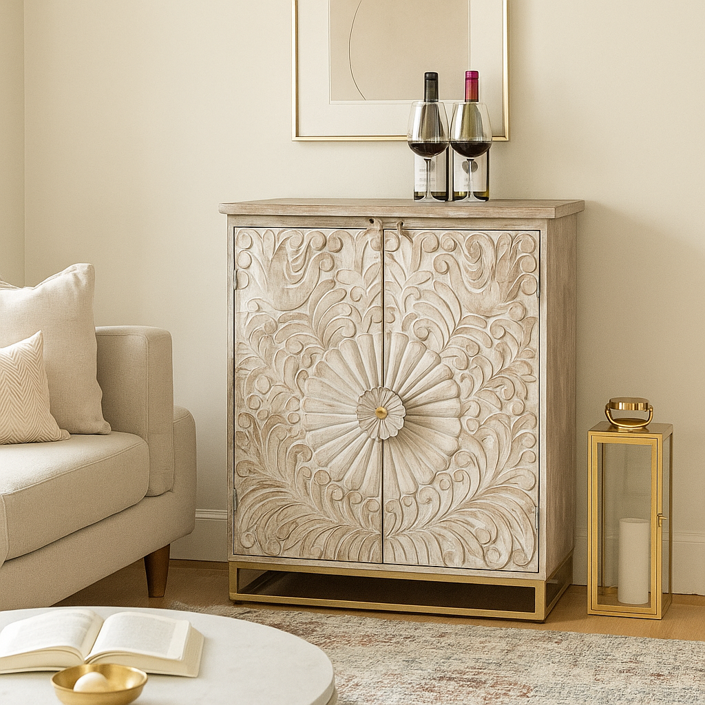 Our solid‑wood cabinet ends your search - carved exterior, white‑washed finish, and plenty of room for bottles, glasses, and all your bar essentials.